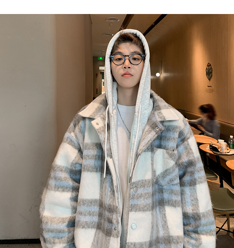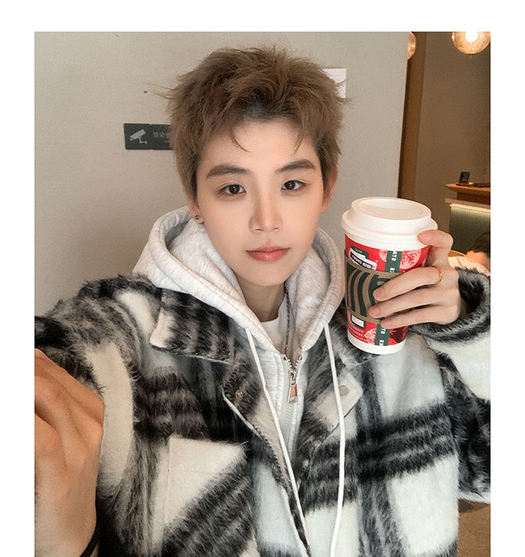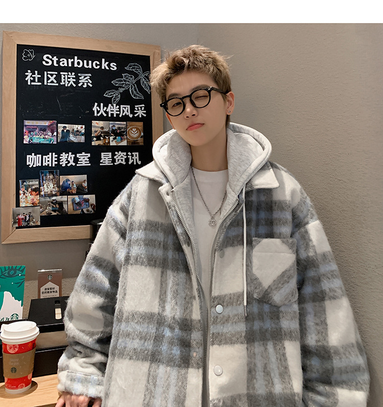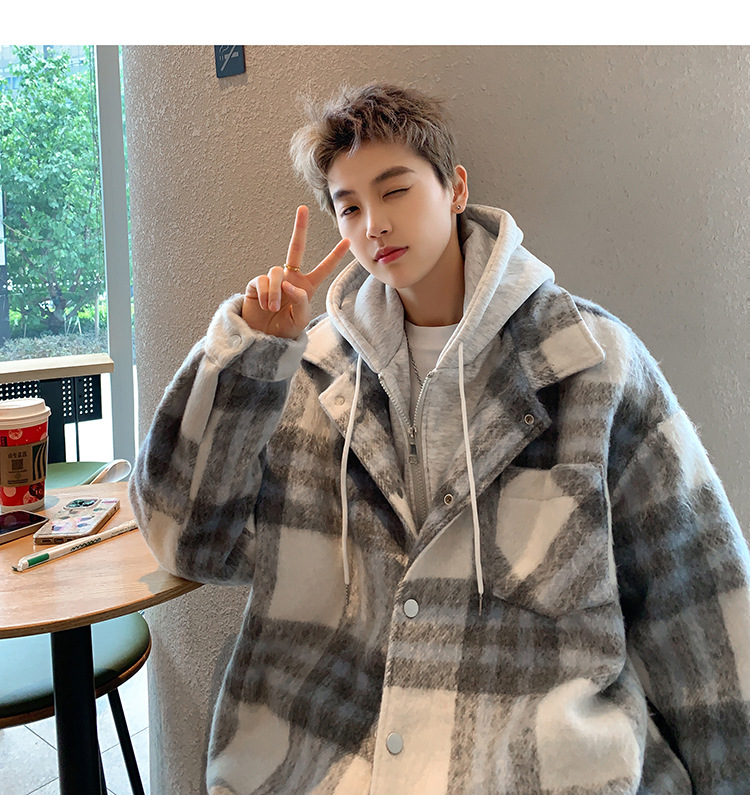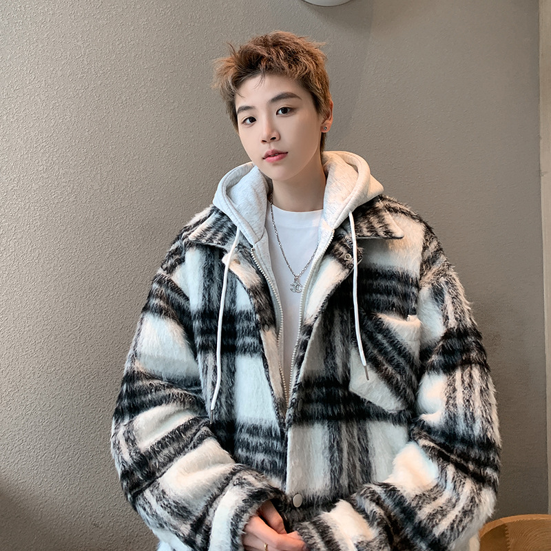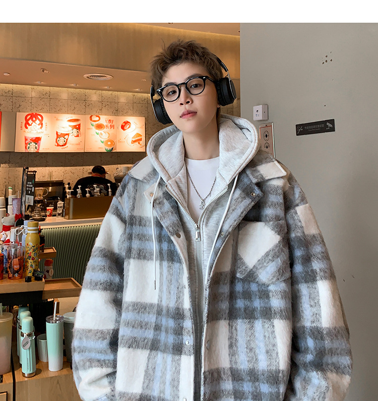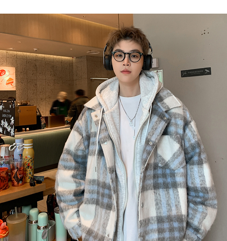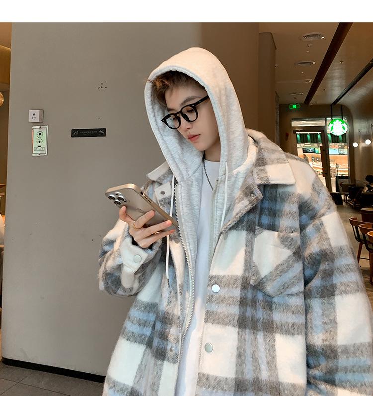 남자 가짜 투피스 플레이드 코튼 패딩 재킷 남자 2024 가을 겨울 새로운 미국 스타일 패션 브랜드 샤넬 스타일 후드 재킷 코트스토어 가기