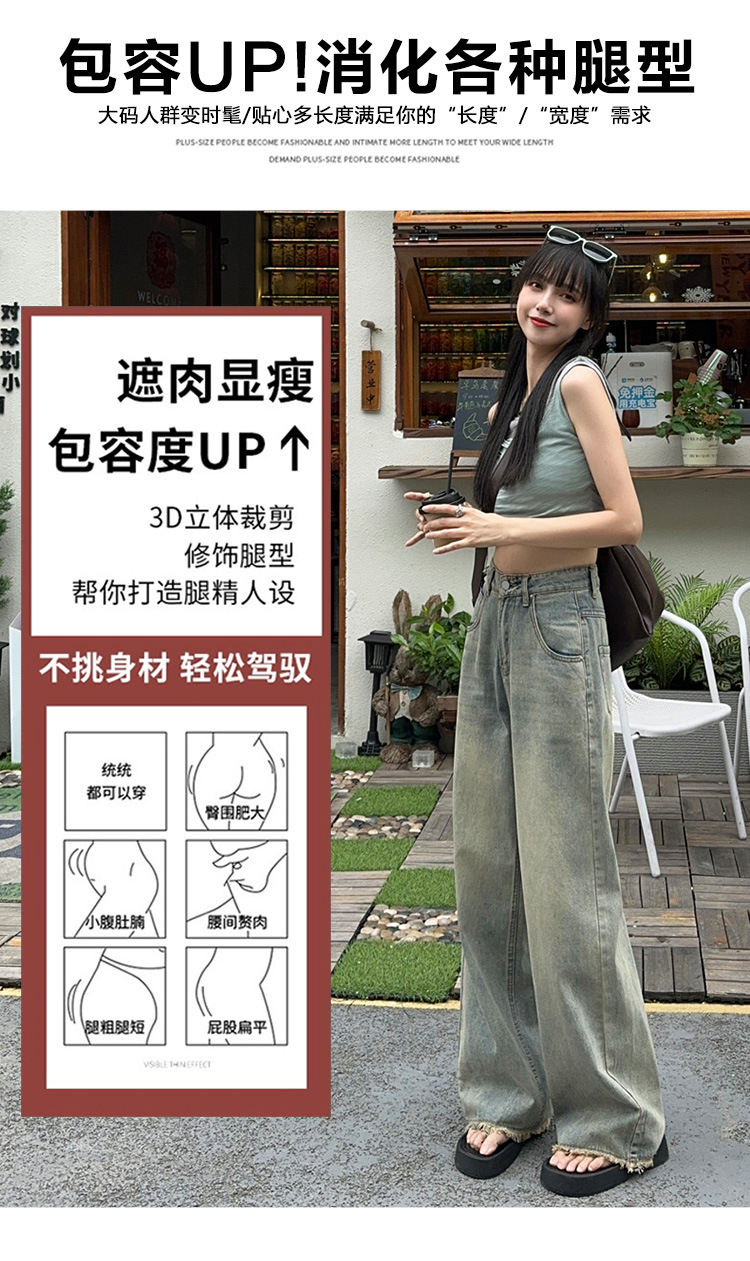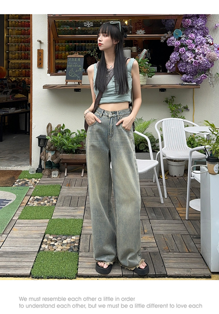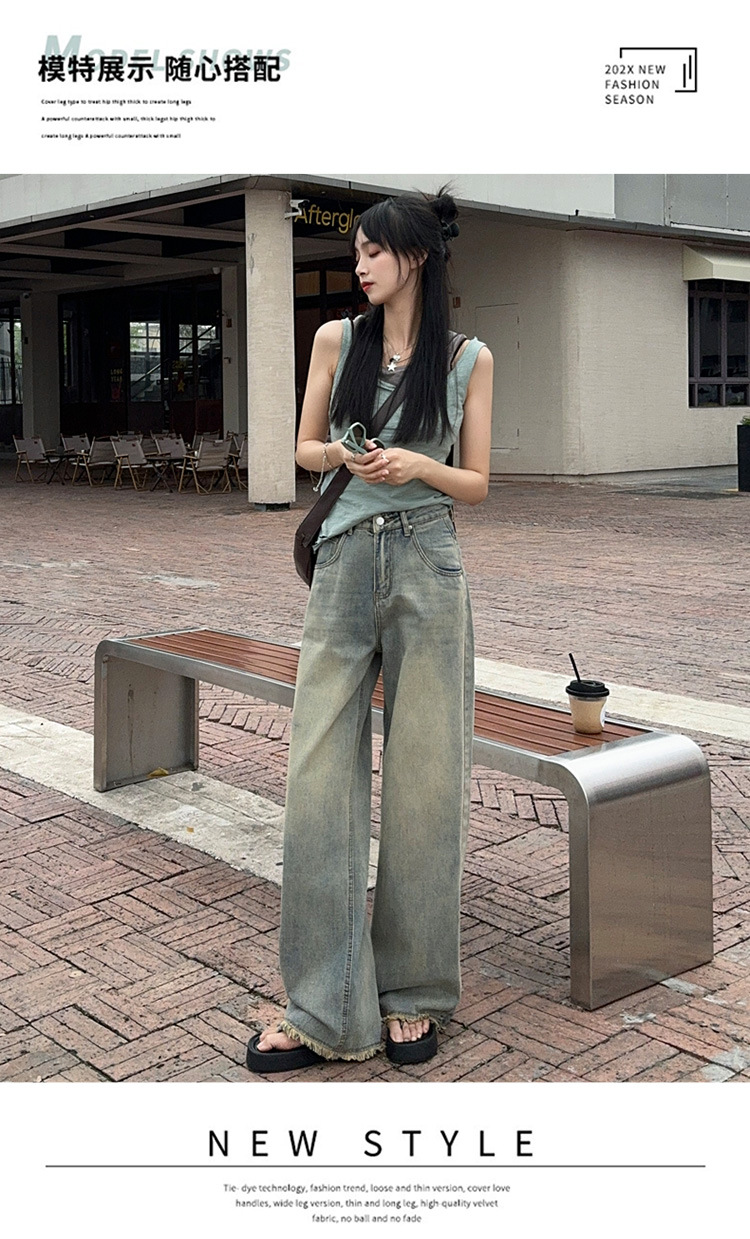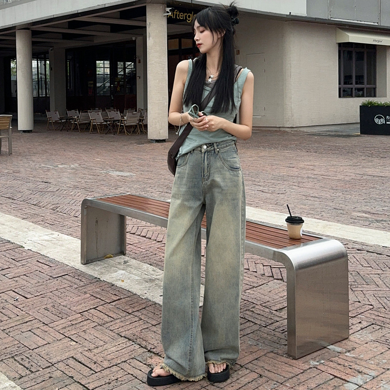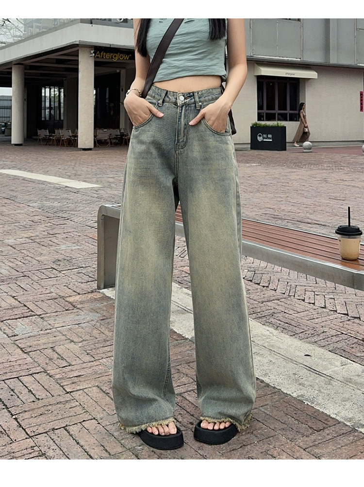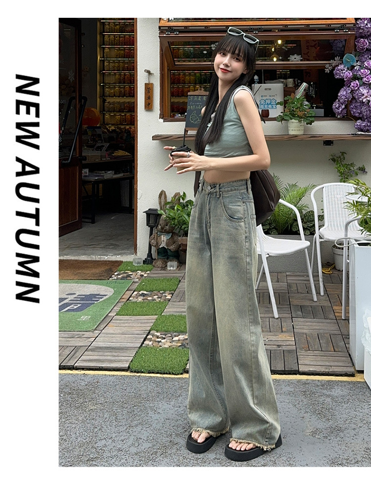 빈티지 모피 가장자리 넓은 다리 청바지 여성의 2024 가을과 겨울 작은 높은 허리 슬리밍 오래 된 스트레이트 튜브 긴 바지스토어 가기