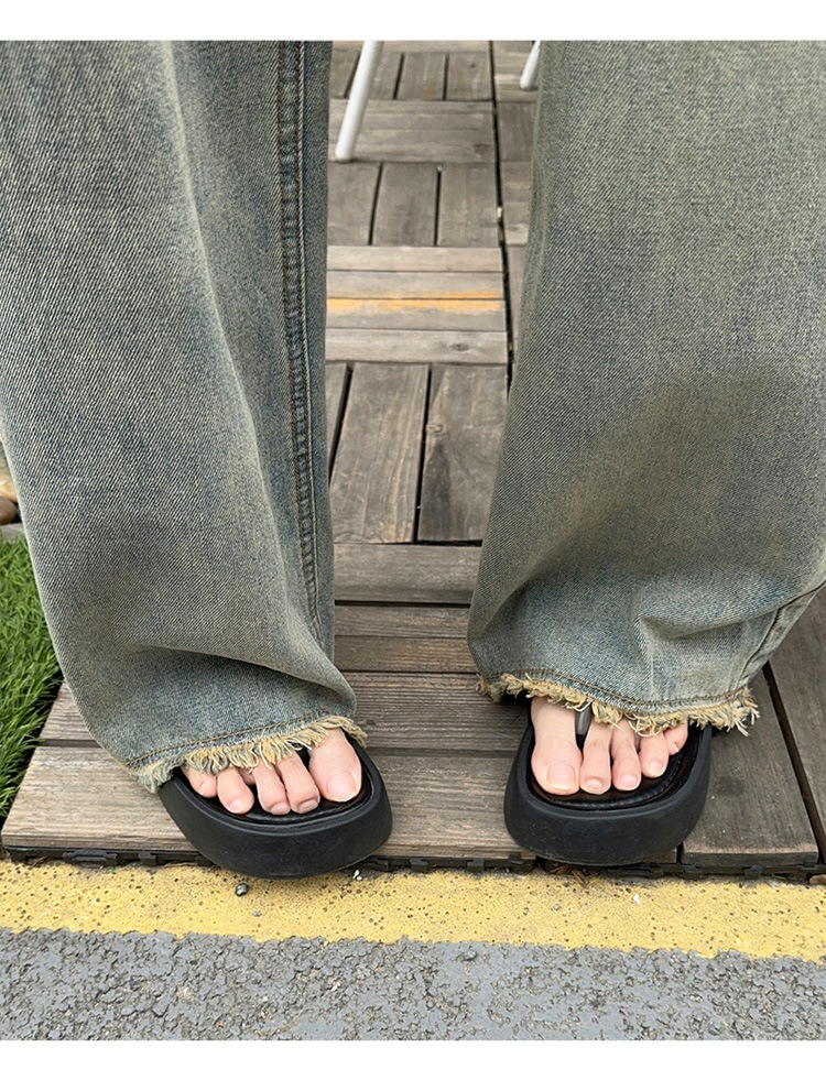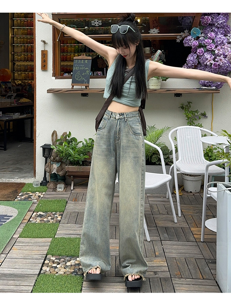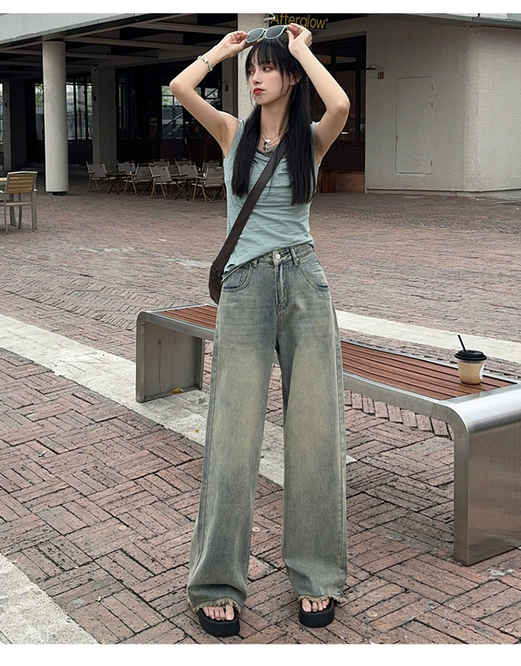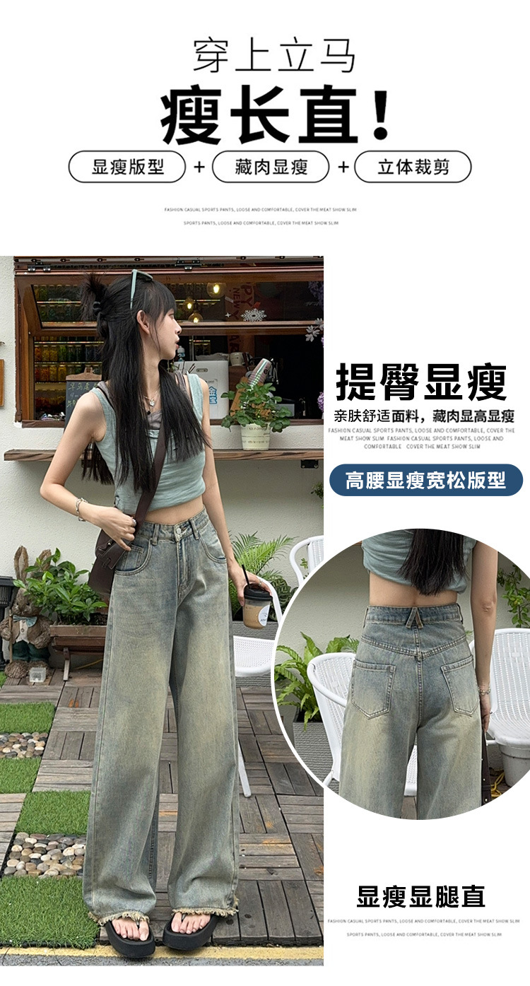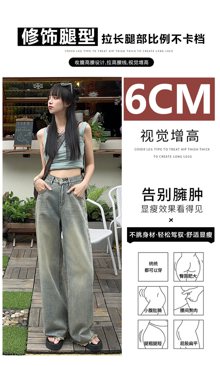 빈티지 모피 가장자리 넓은 다리 청바지 여성의 2024 가을과 겨울 작은 높은 허리 슬리밍 오래 된 스트레이트 튜브 긴 바지