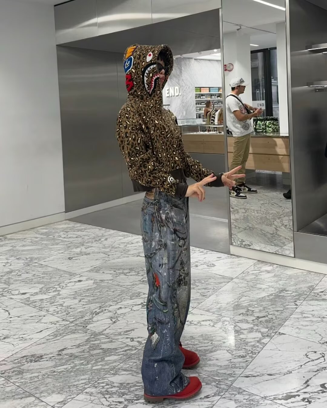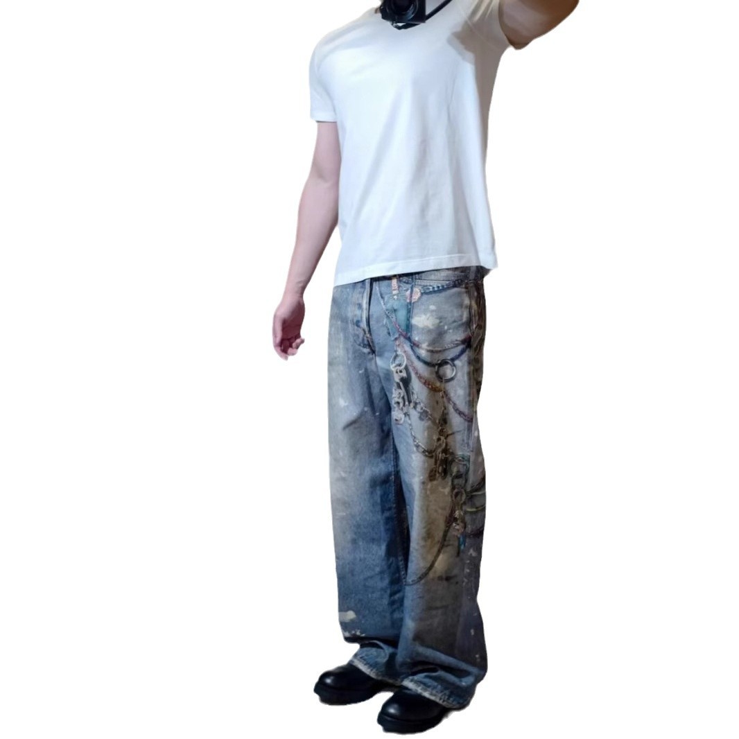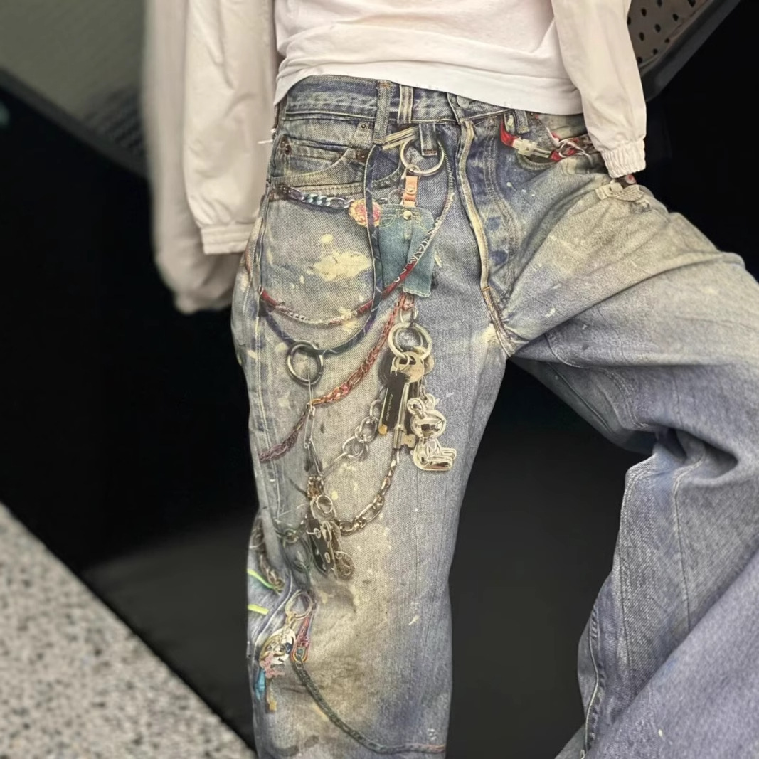 미국 거리 세척 오래 인쇄 청바지 남자의 봄과 가을 스트레이트 느슨한 유럽과 미국의 하이 스트리트 바이브 스타일 긴 바지스토어 가기