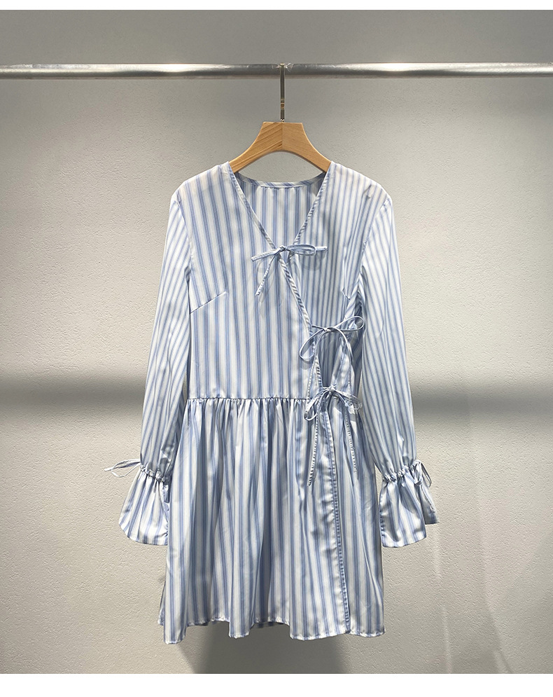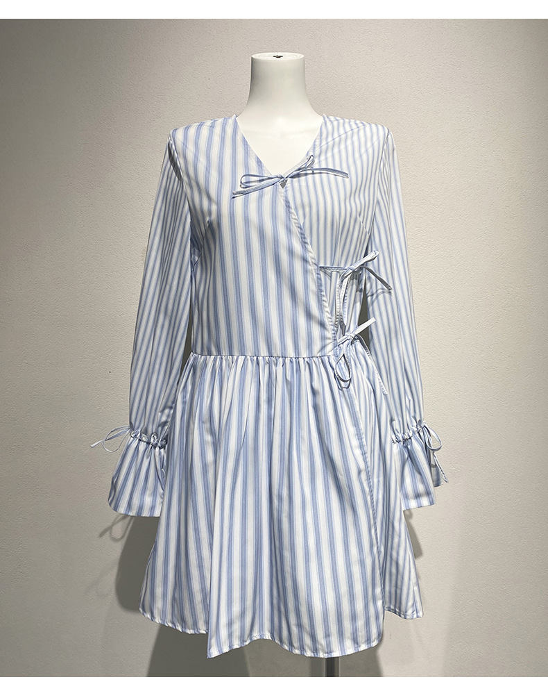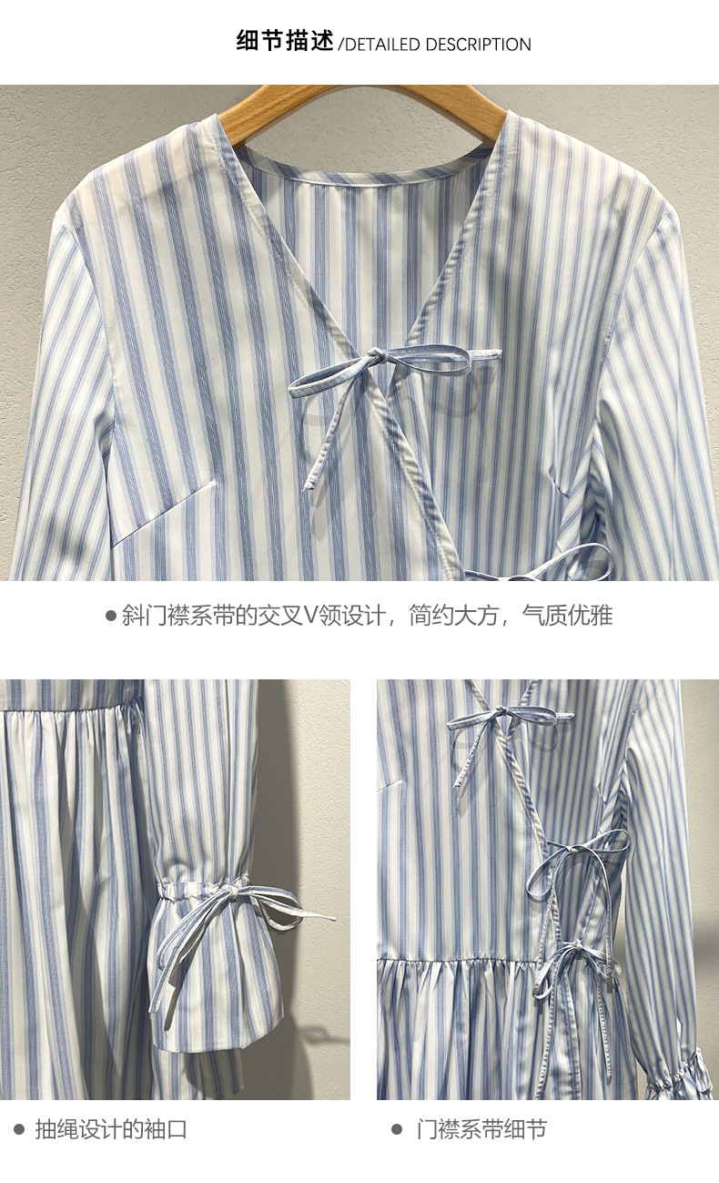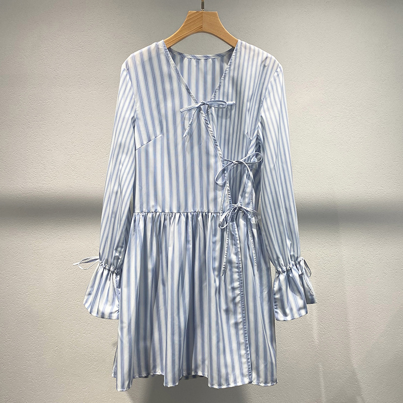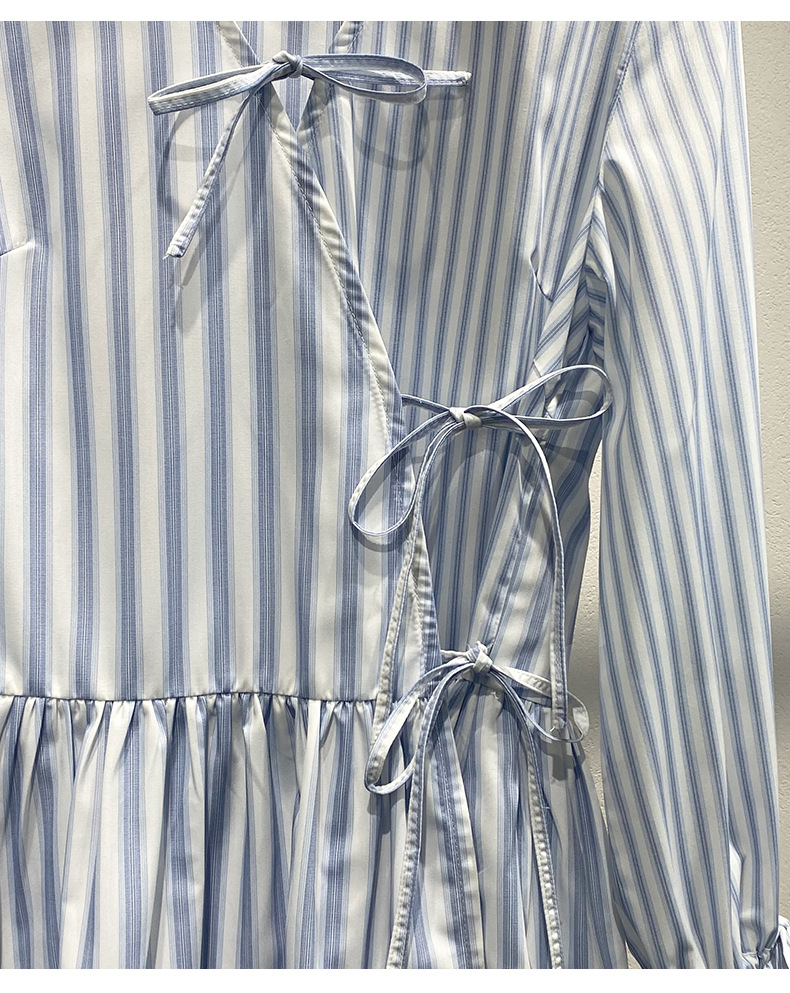 Xiaozhong 2024 가을 새로운 단색 줄무늬 레이스 업 느슨한 긴 소매 원피스 여성