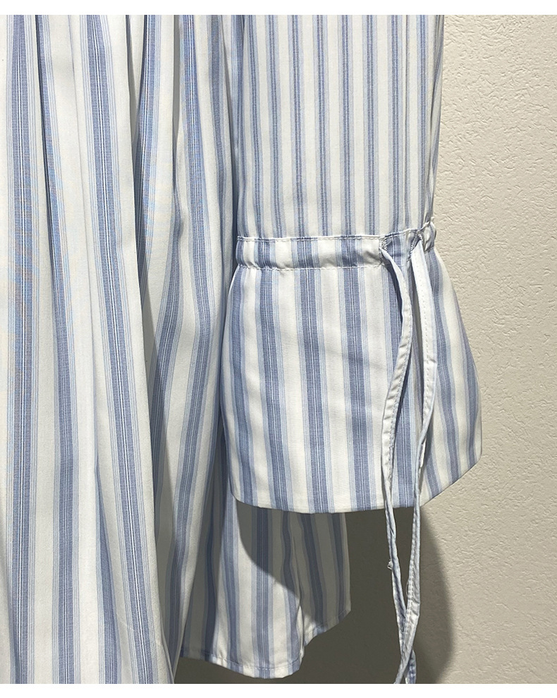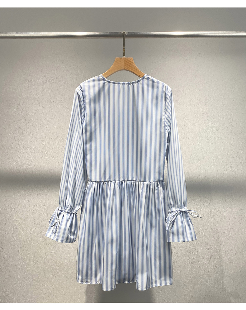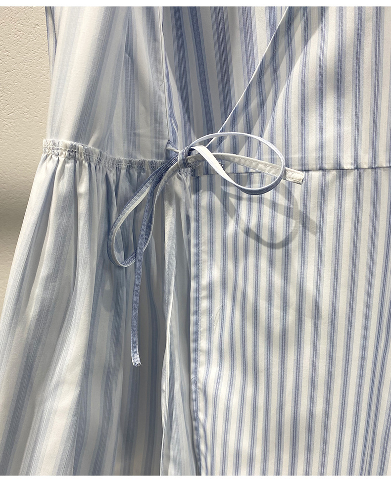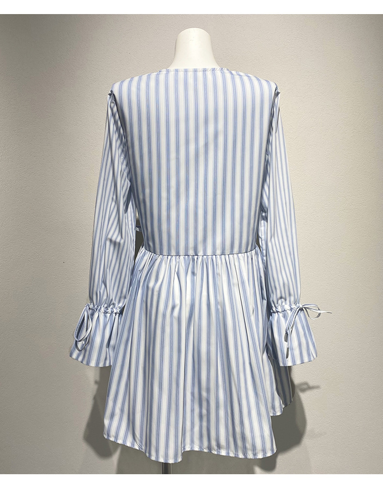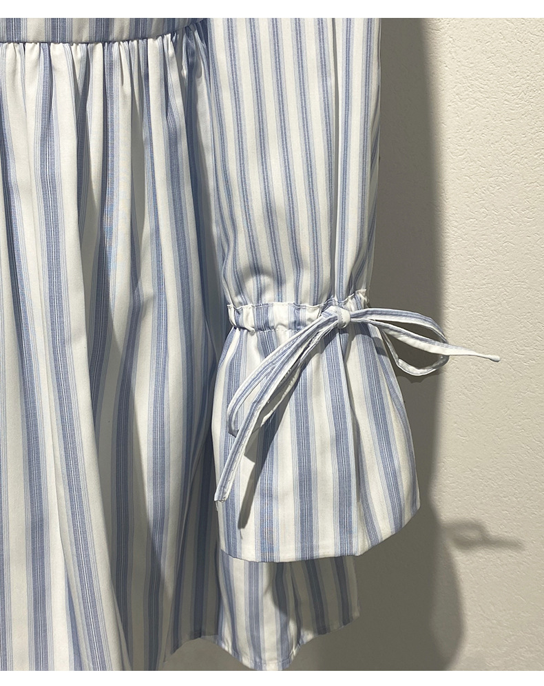 Xiaozhong 2024 가을 새로운 단색 줄무늬 레이스 업 느슨한 긴 소매 원피스 여성