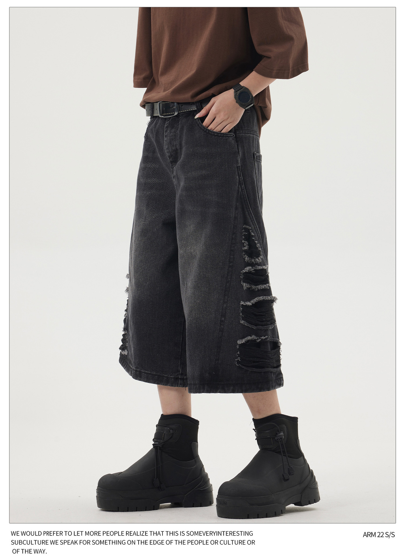 여름 새로운 파괴 씻은 오래된 데님 반바지 남성용 느슨한 미국 복고풍 컷 넓은 다리 스트레이트 자른 바지