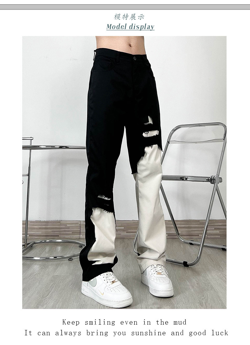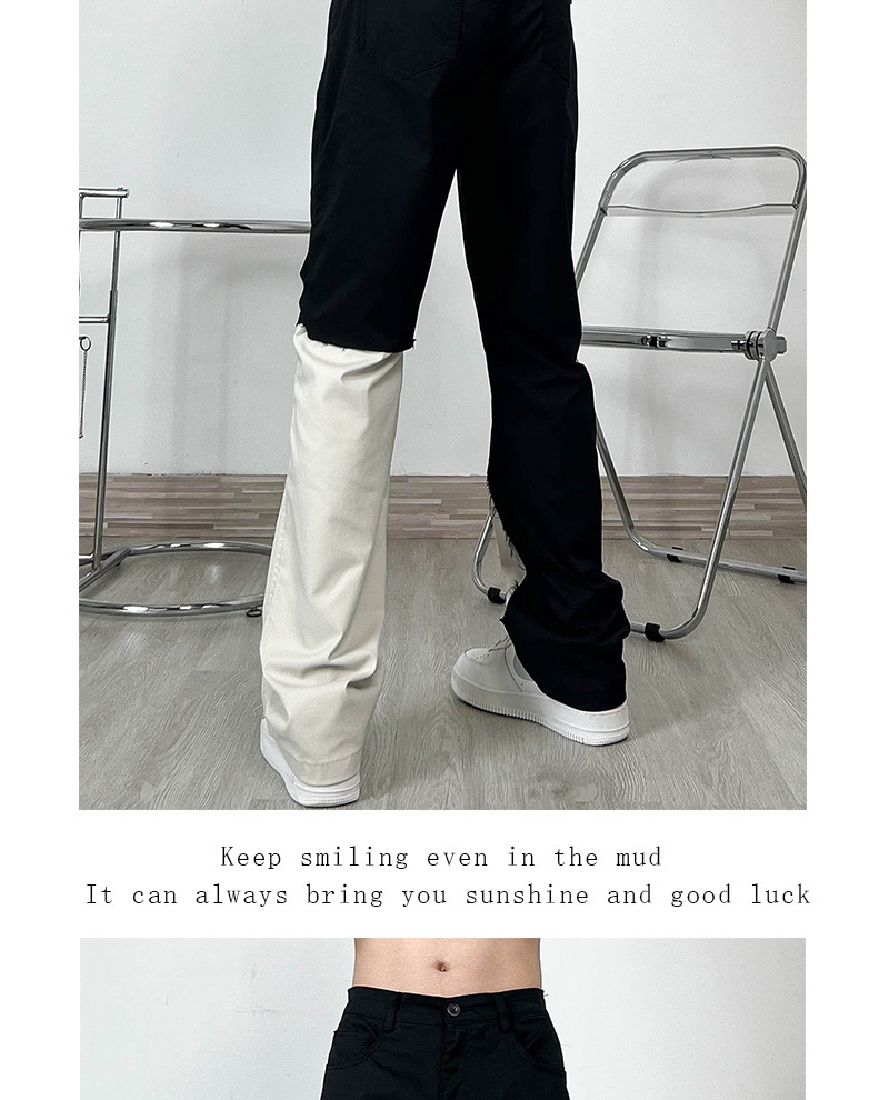 미국식 하이 스트리트 바이브 흑백 스티칭 캐주얼 바지 남성 봄과 가을 유행 브랜드 파괴 커버 바지 마이크로 혼 바지
