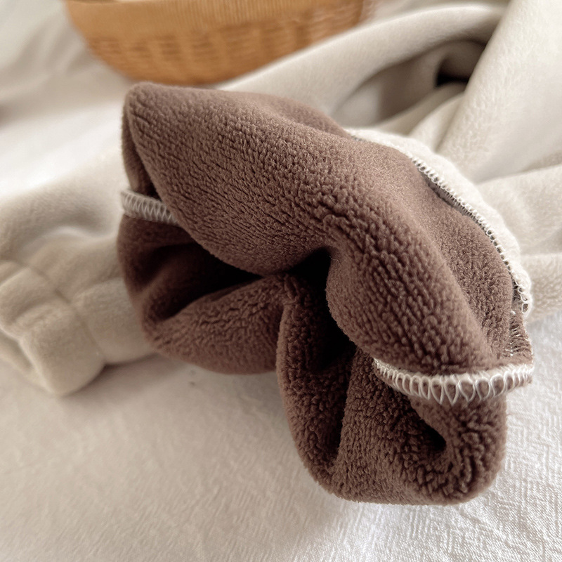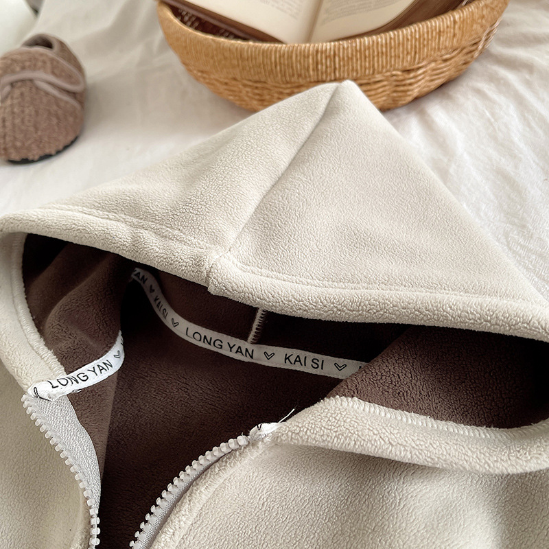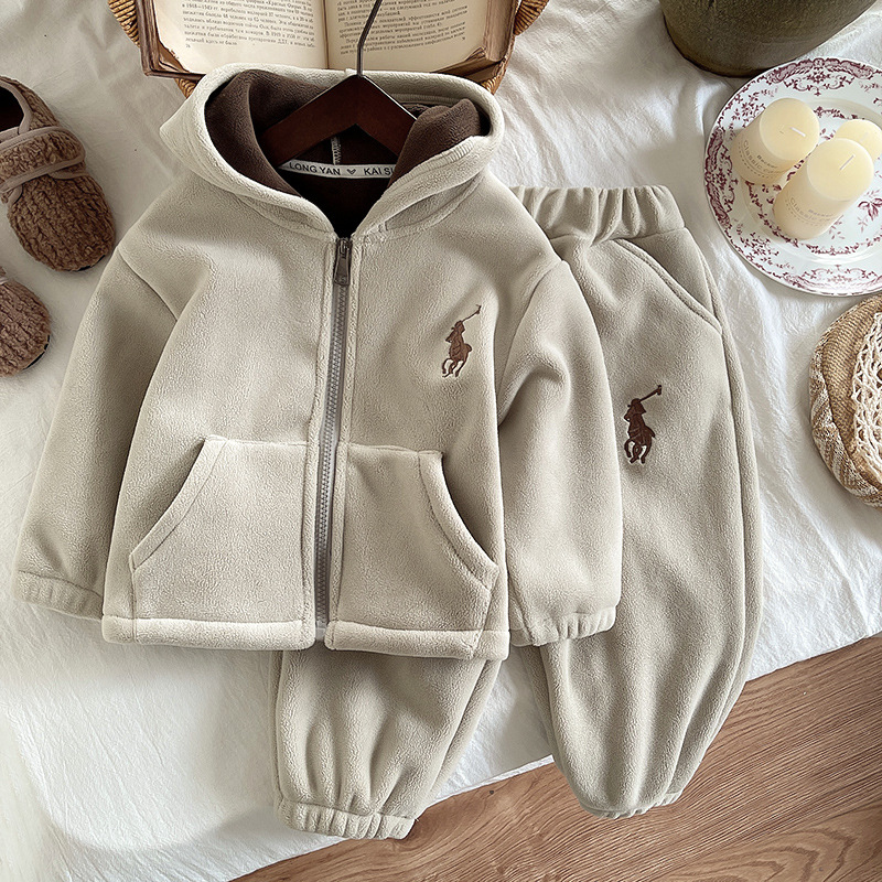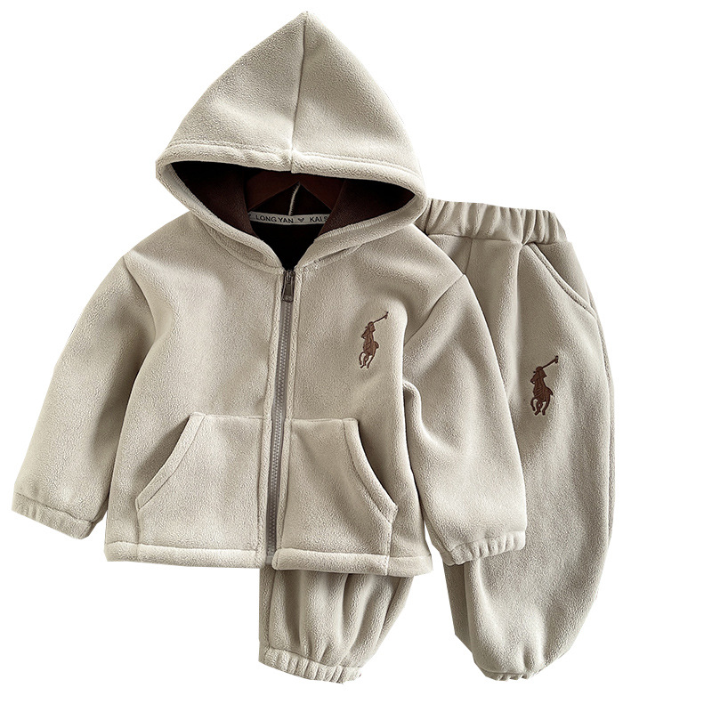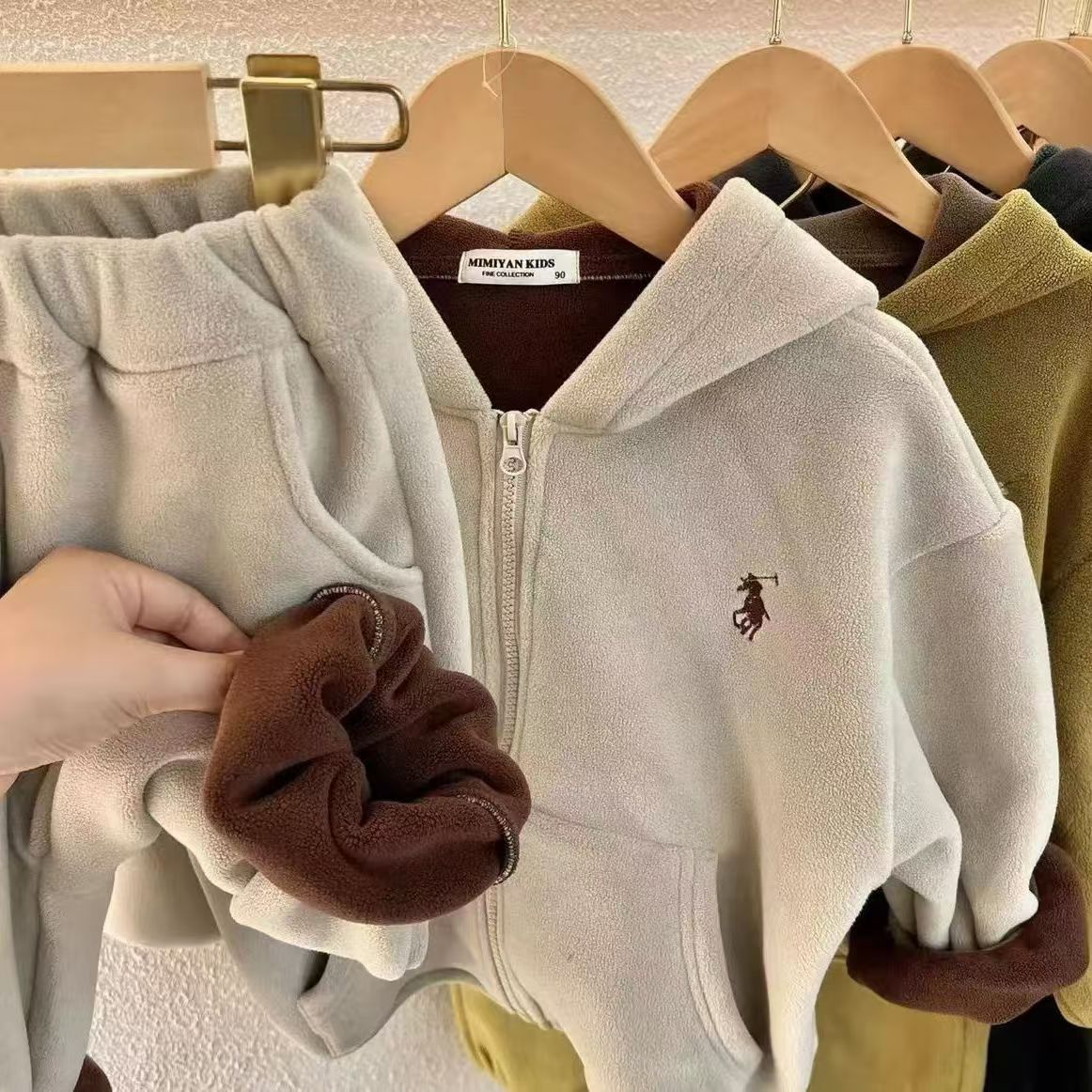 가을과 겨울 남학생과 아이들의 재킷 바지 라이스 화이트 기모 후드 지퍼 스웨터 따뜻한 세트 착용