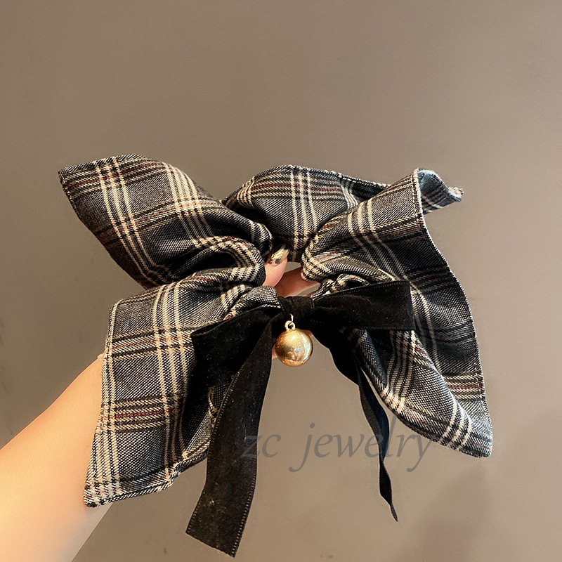 • 블랙 빅 보우 체크 무늬 스퀘어 스카프 머리끈