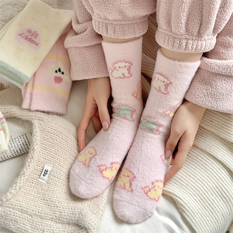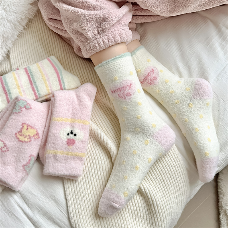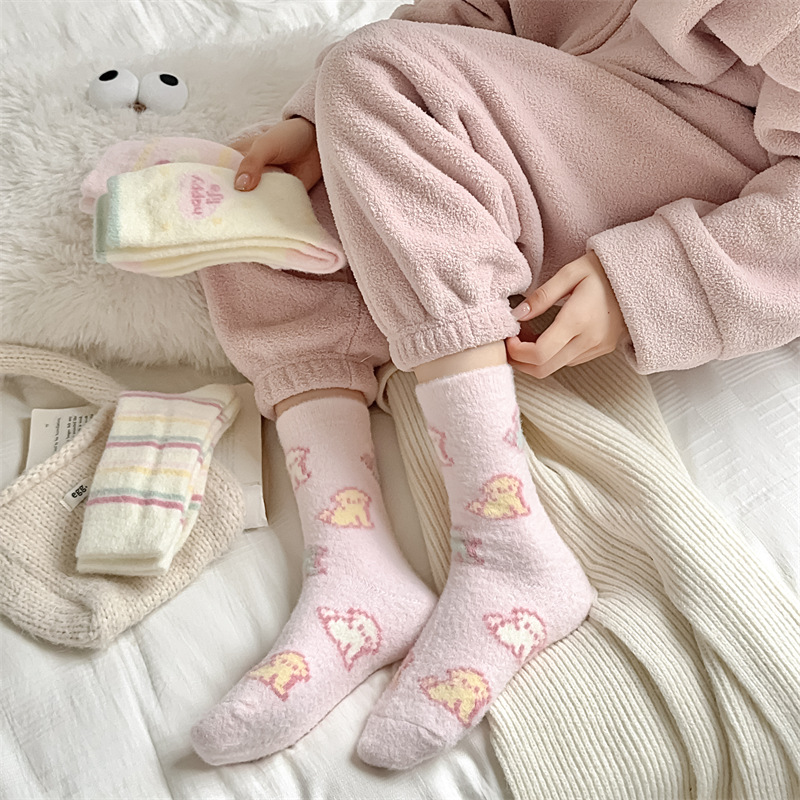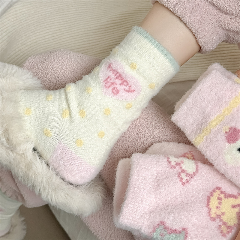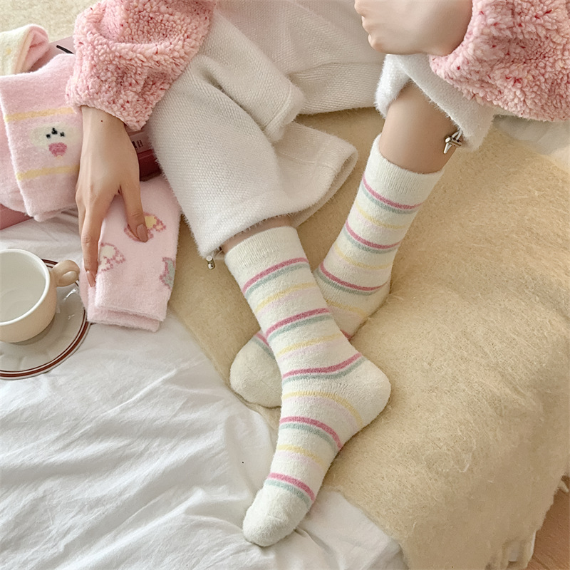 핑크 호주 벨벳 양말 어린이 가을과 겨울 두꺼운 따뜻한 튜브 양말 일본 만화 줄무늬 귀여운 플러시 바닥 양말스토어 가기