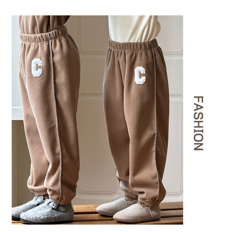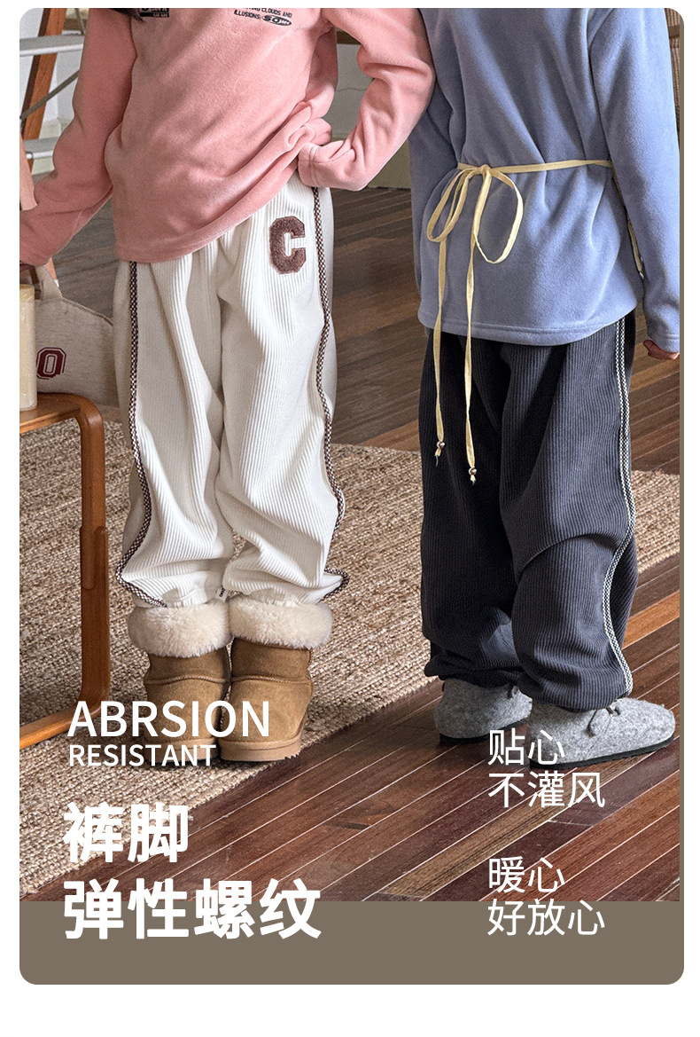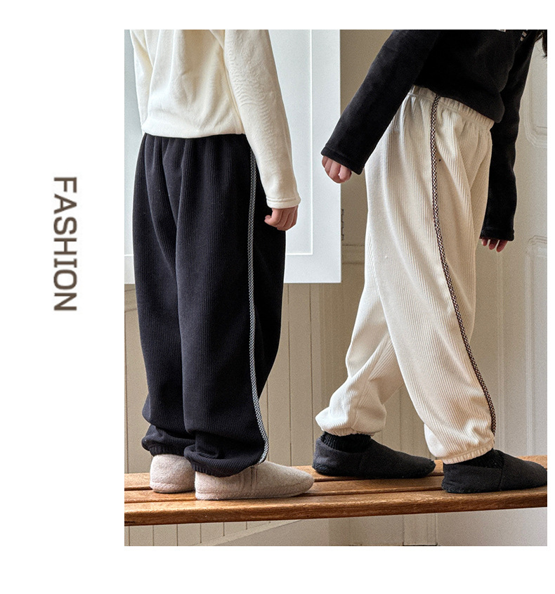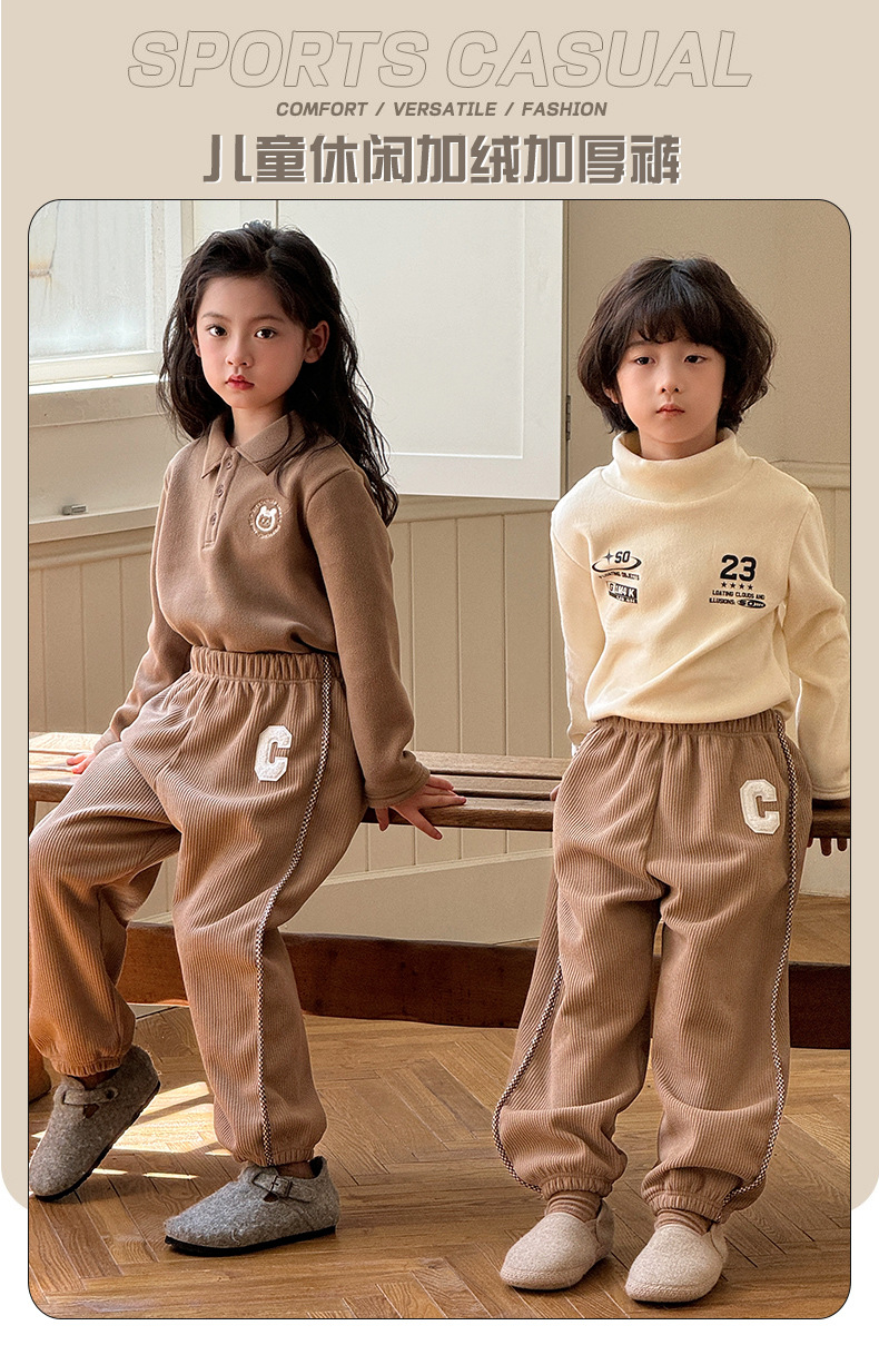 가을과 겨울 새로운 어린이 스포츠 캐주얼 바지 소년 기모 두꺼운 나사 바지 중소 소녀 발 따뜻한 바지
