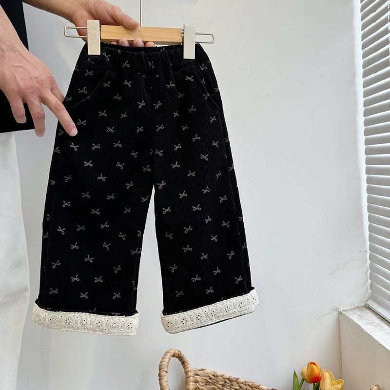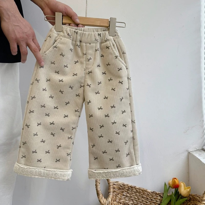 가을과 겨울을위한 소녀 코듀로이 기모 스트레이트 다리 바지 달콤한 활 레이스 스트레이트 벨벳 넓은 다리 바지
