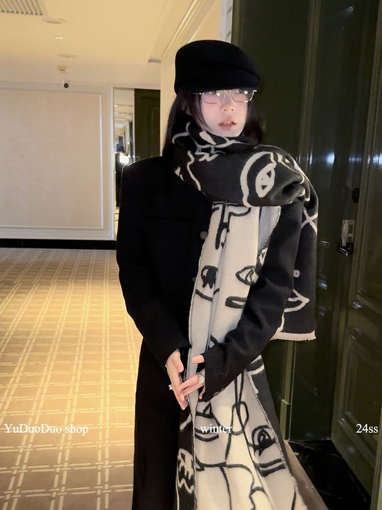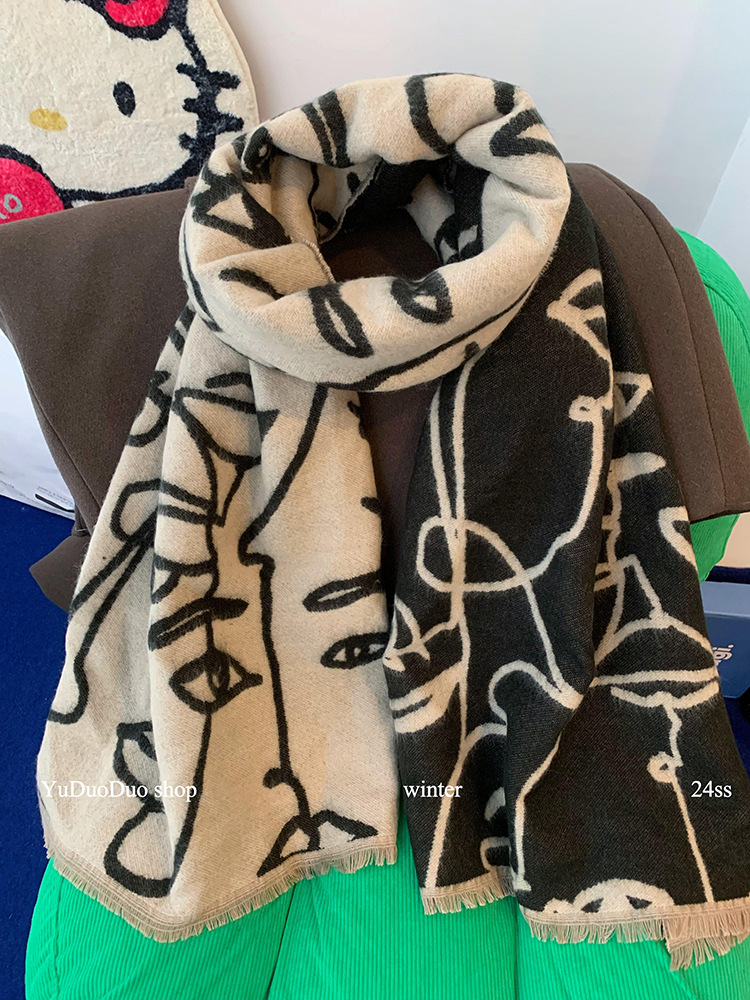 小众设计师款手绘抽象线条印花双面围巾女冬季仿羊绒加厚保暖围脖