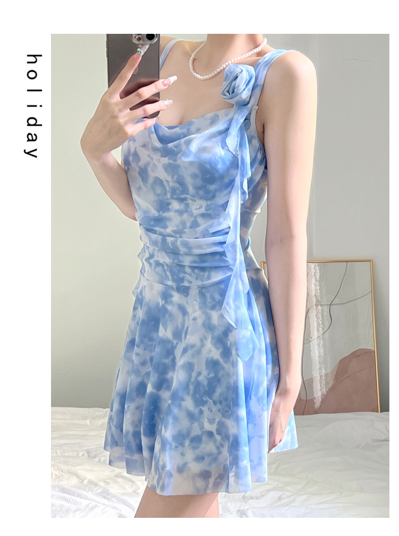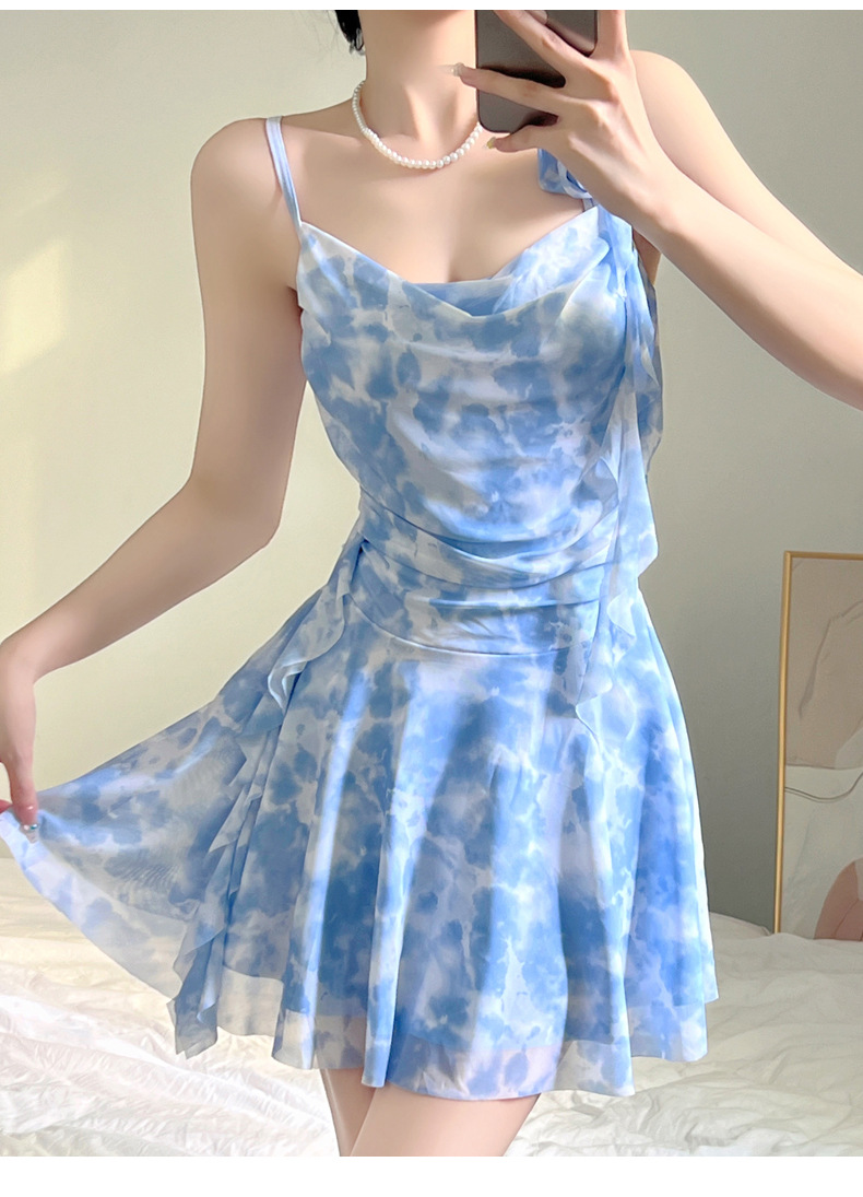 2024 민소매 블루 플로럴 스커트 원피스 새로운 온천 수영복 도매