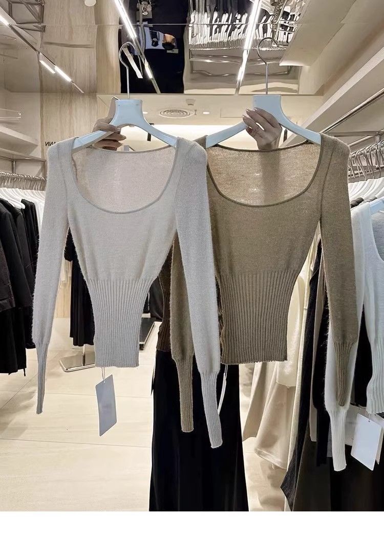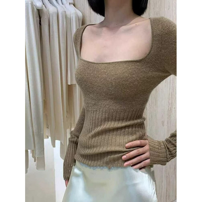 소프트 왁스 심플 올 매치 니트 스웨터 여성 가을 및 겨울 스퀘어 칼라 슬림 핏 슬림 슬림 긴팔 탑 다크 브라운 프리 사이즈 화이트스토어 가기