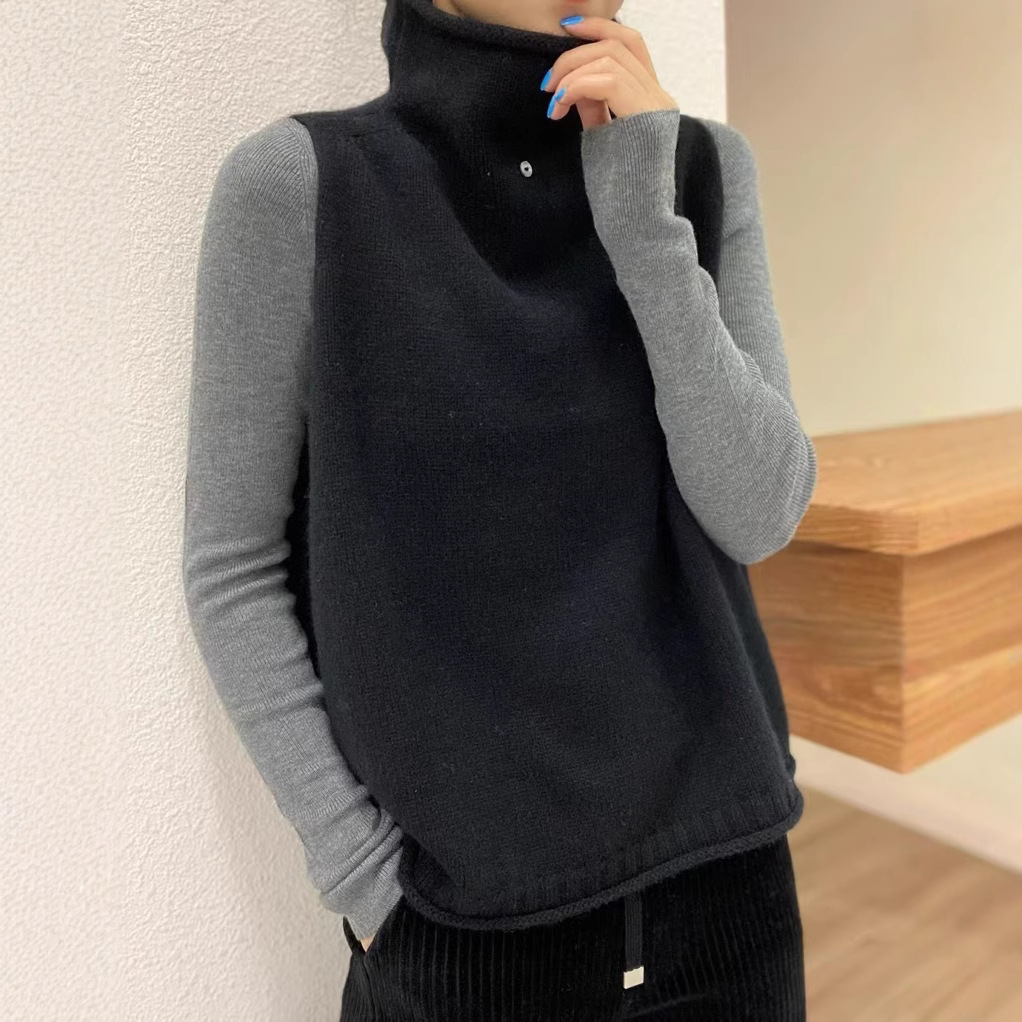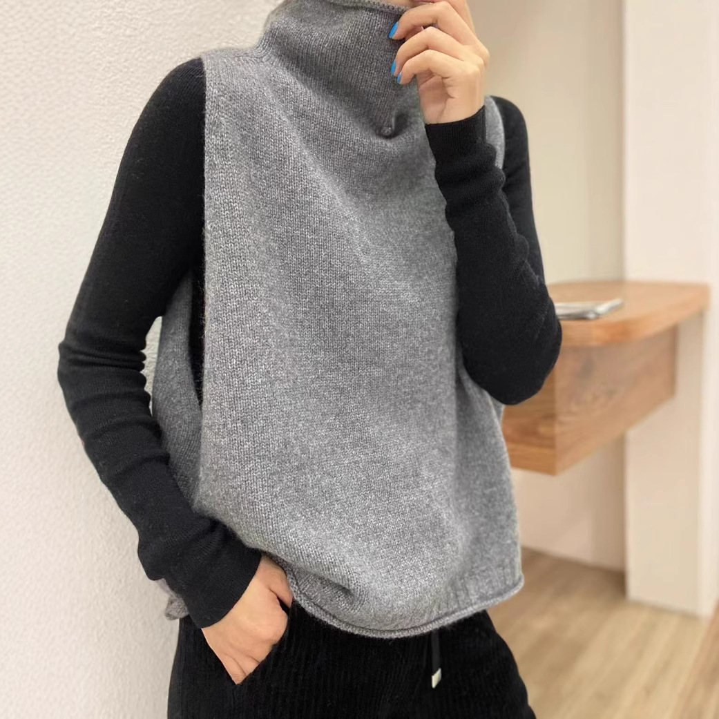 가을과 겨울 높은 칼라 순수한 양모 조끼 여성용 니트 왁스 코트 느슨한 슬리밍 플러스 사이즈 민소매 베이스 스웨터