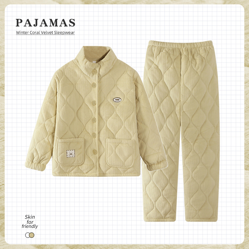 2024 새로운 도착 파자마 여성용 겨울 산호 양털 기모 3 층 퀼트 따뜻한 카디건 홈 의류 세트