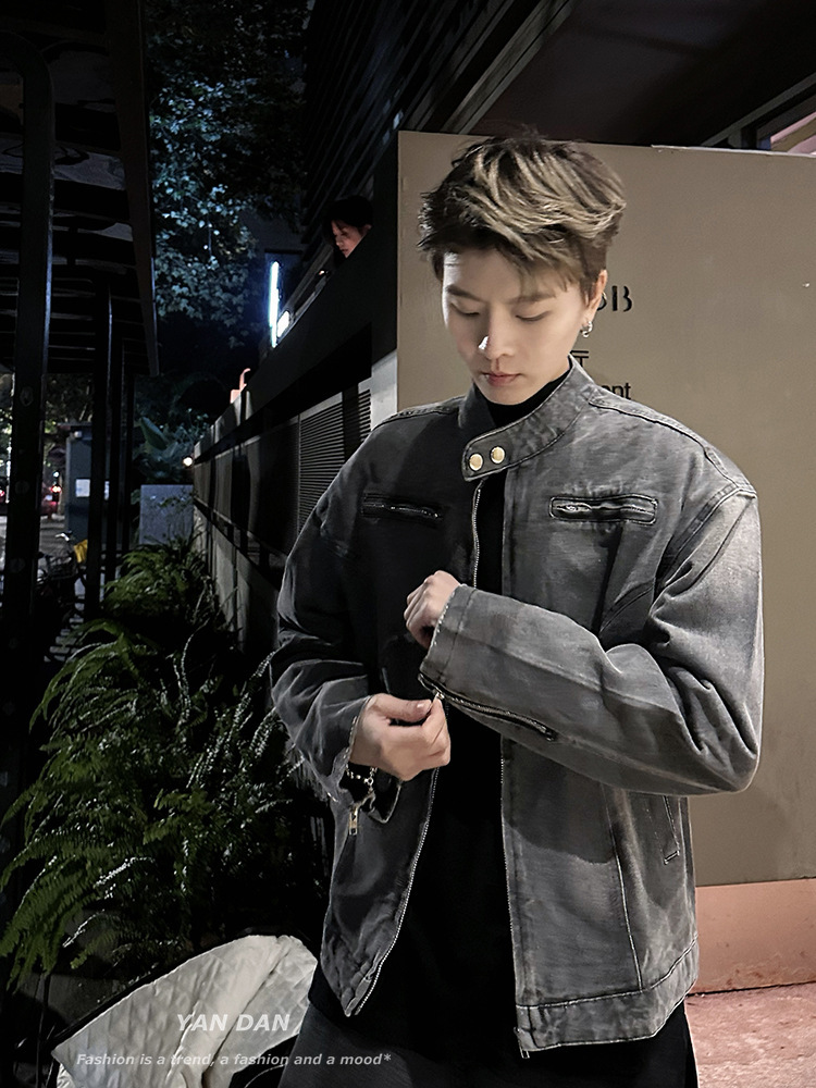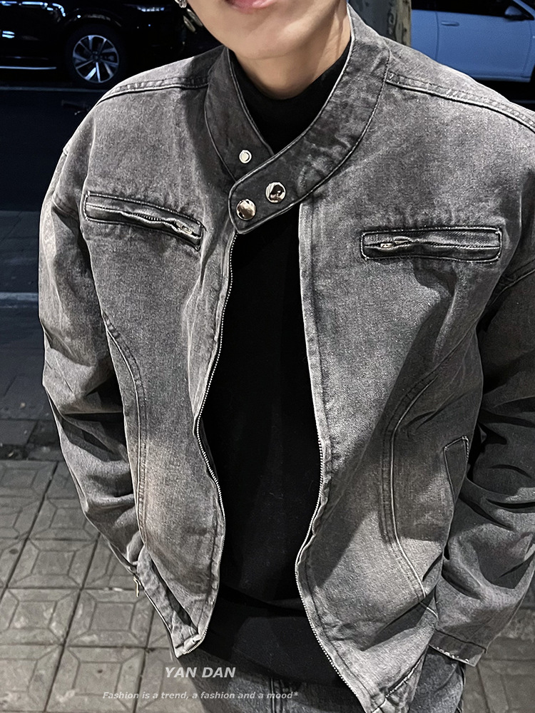 미국 오토바이 데님 재킷 남자의 2024 새로운 지퍼 장식 디자인 틈새 짧은 재킷