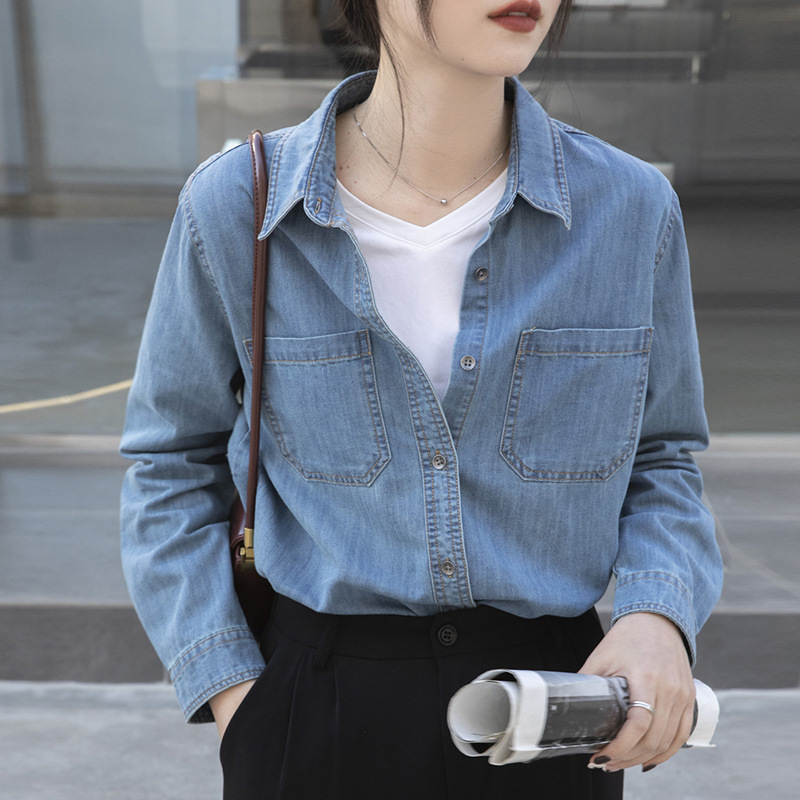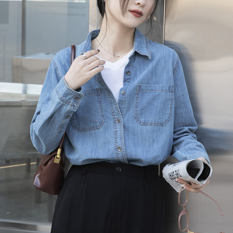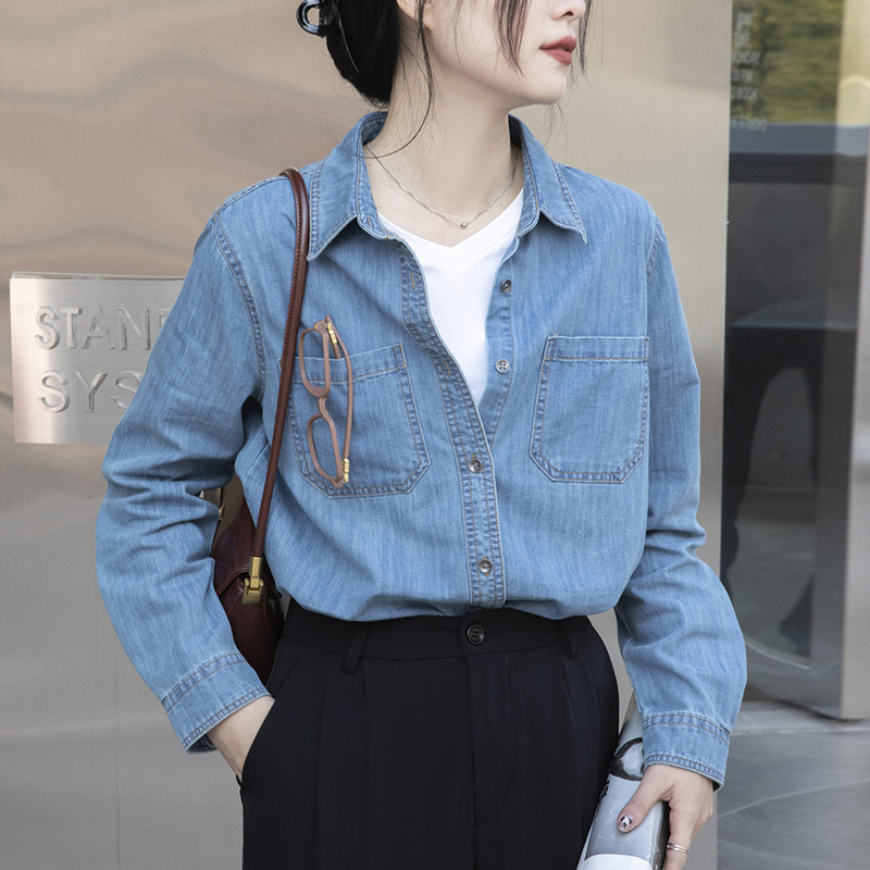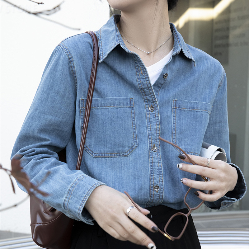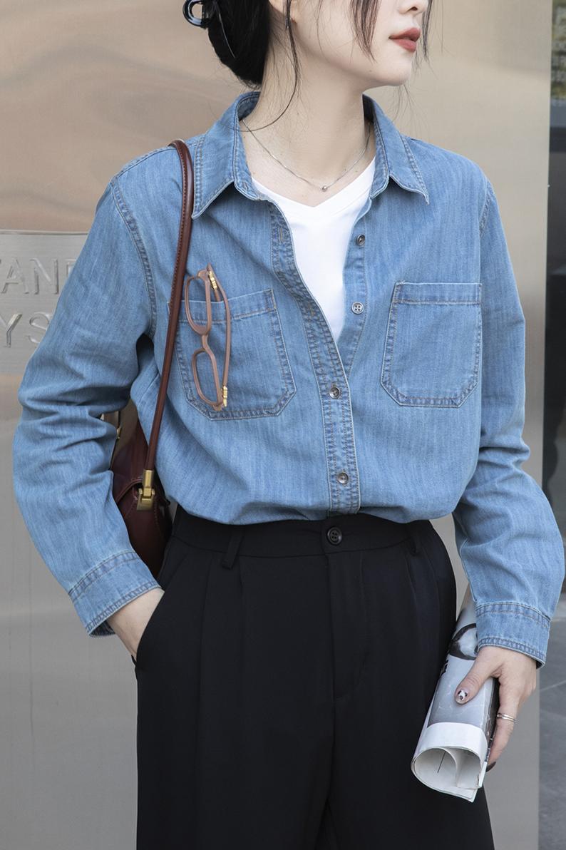 2023 진짜 샷 새로운 복고풍 고민 라이트 블루 부드러운 데님 셔츠 여성의 가을 올 매치 프론트 숄더 접은면 셔츠스토어 가기