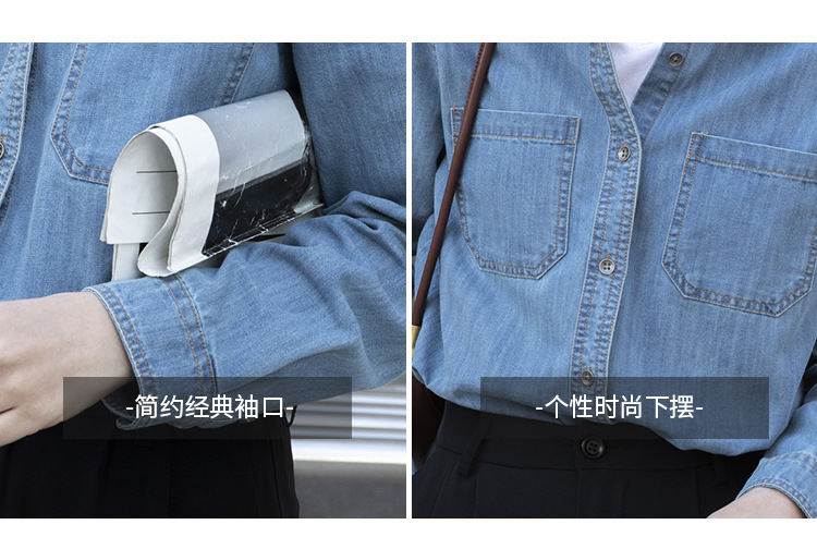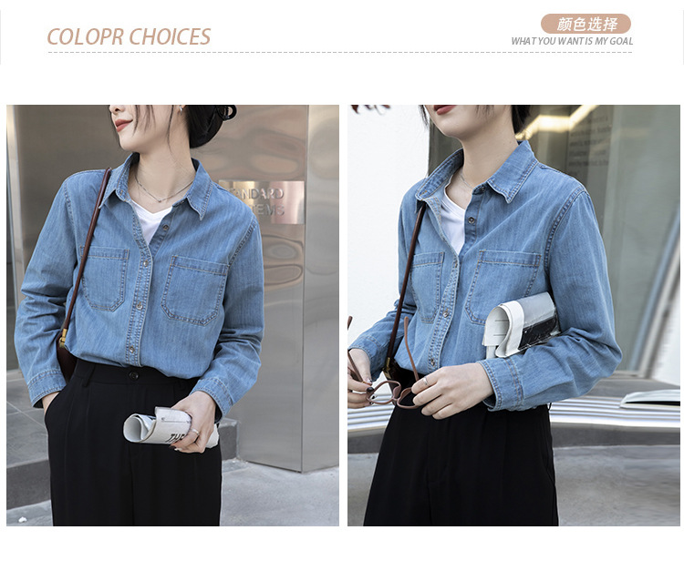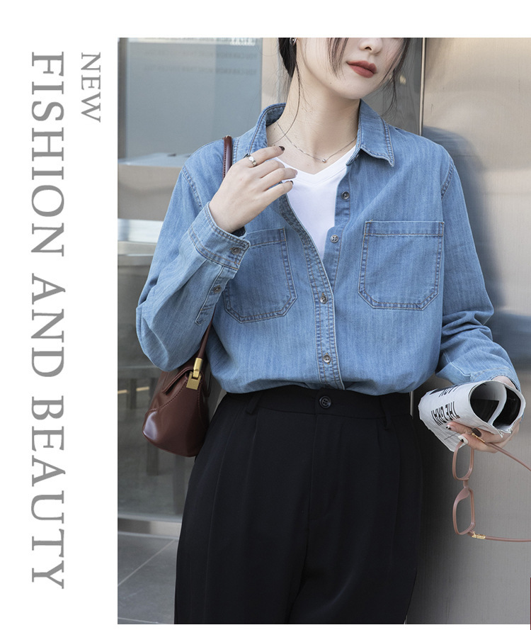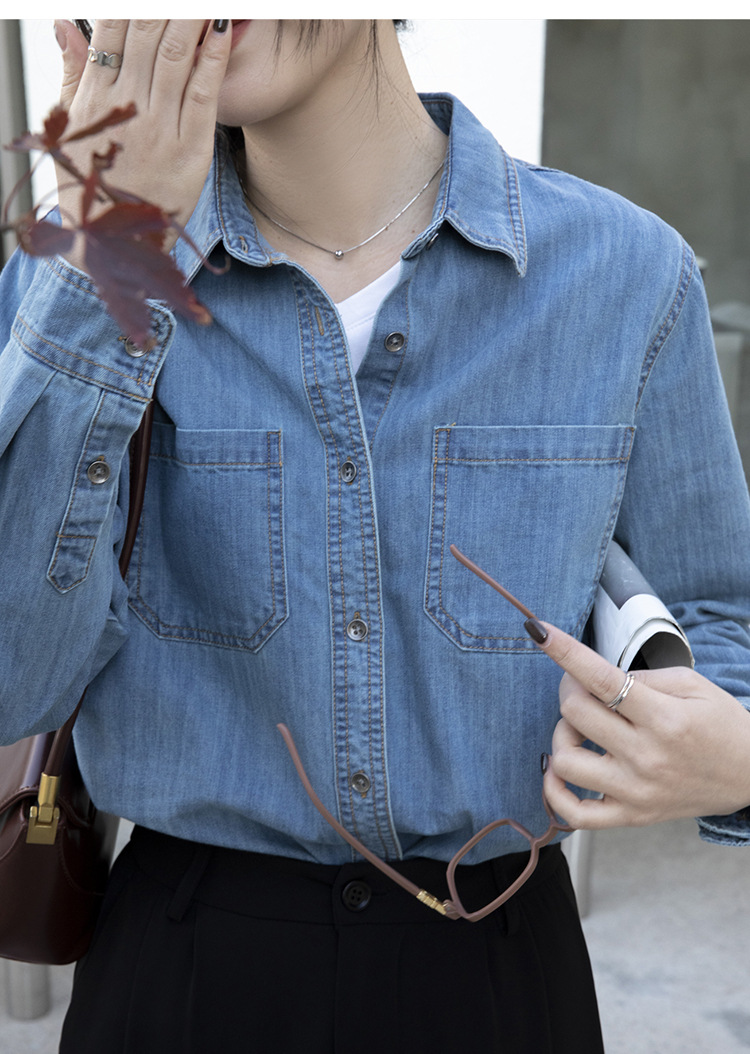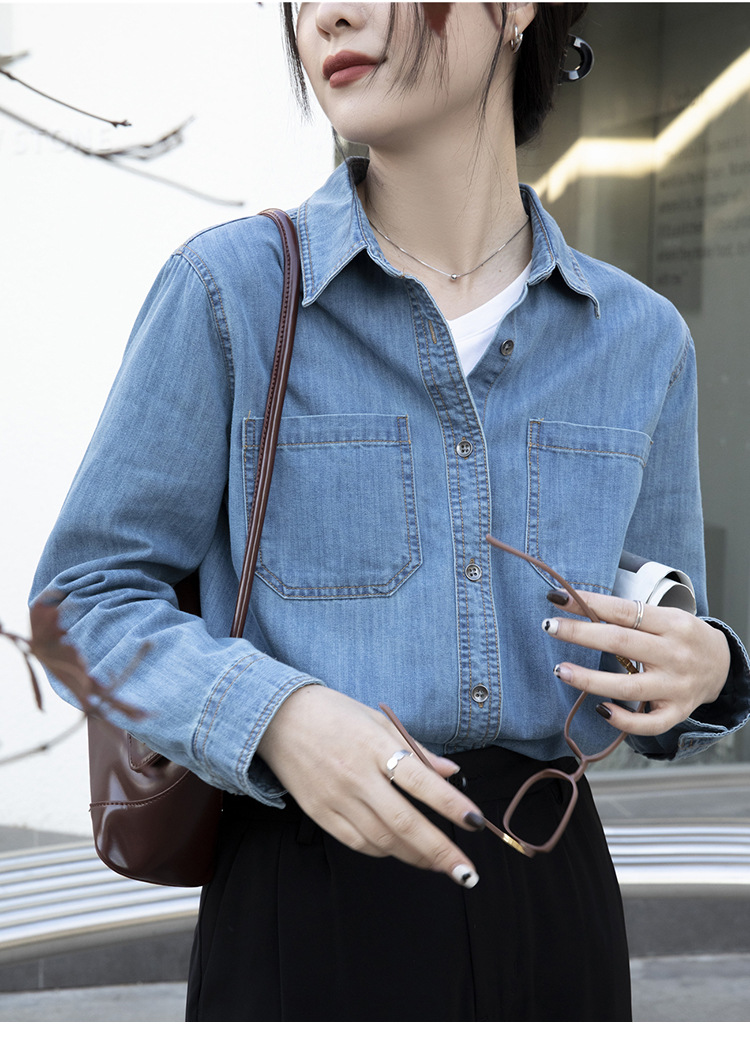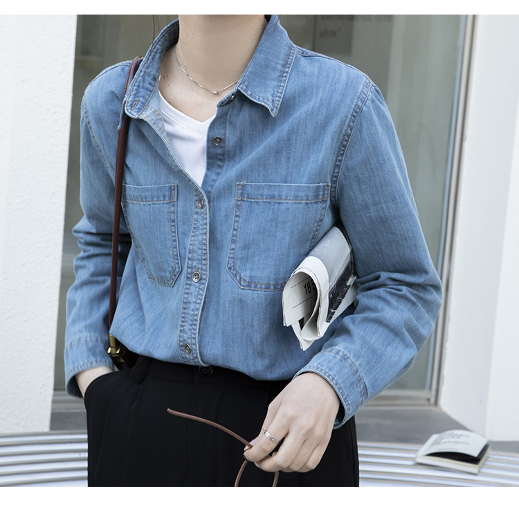 2023 진짜 샷 새로운 복고풍 고민 라이트 블루 부드러운 데님 셔츠 여성의 가을 올 매치 프론트 숄더 접은면 셔츠스토어 가기