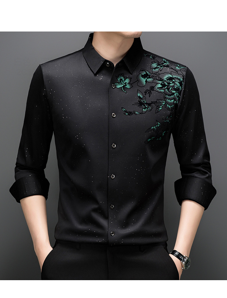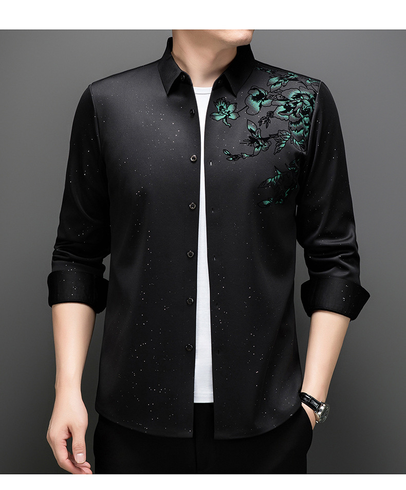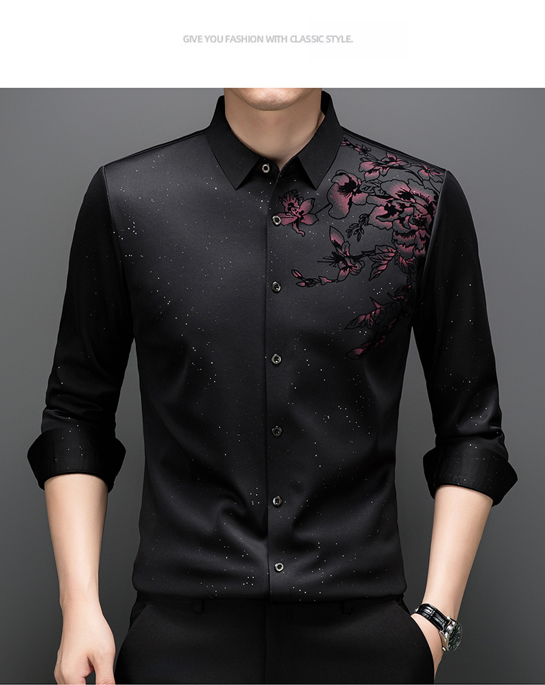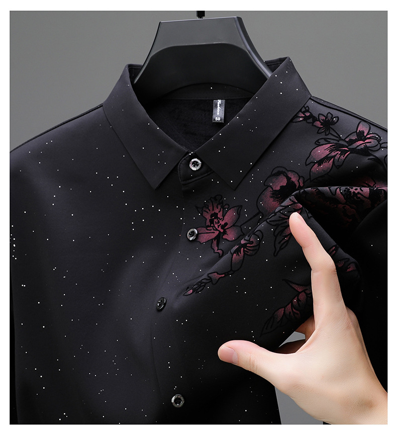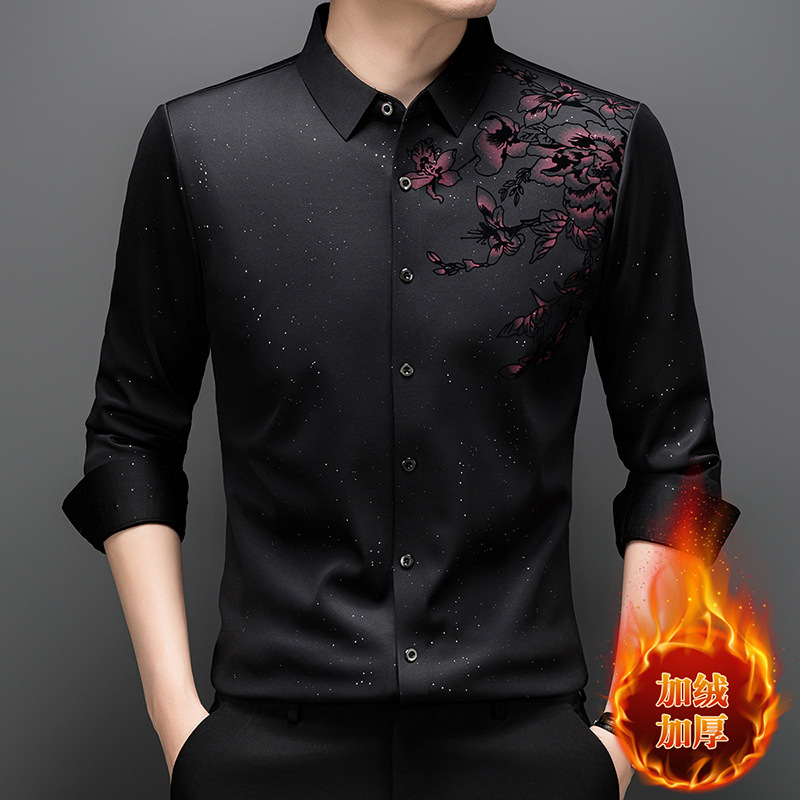 기모 셔츠 남자의 추적없는 긴팔 중년 및 젊은 유행 사업 캐주얼 매화 꽃 그림 탄성 따뜻한 우아한 꽃 셔츠스토어 가기