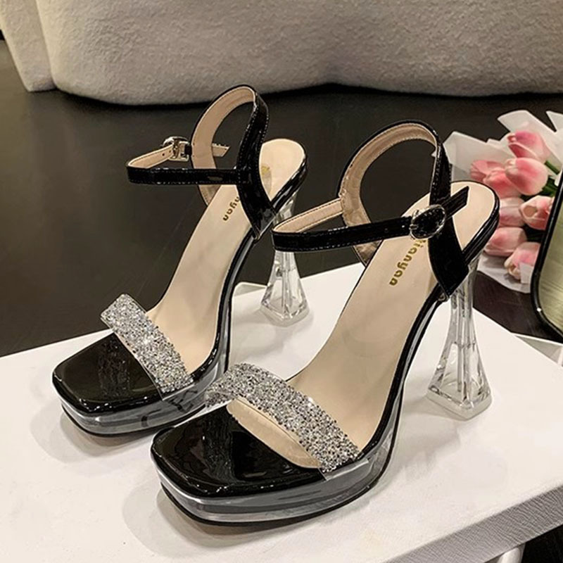 크리스탈 힐 하이힐 2024 여름 새로운 투명 라인석 9CM 두꺼운 힐 슈퍼 하이힐 샌들 여성스토어 가기