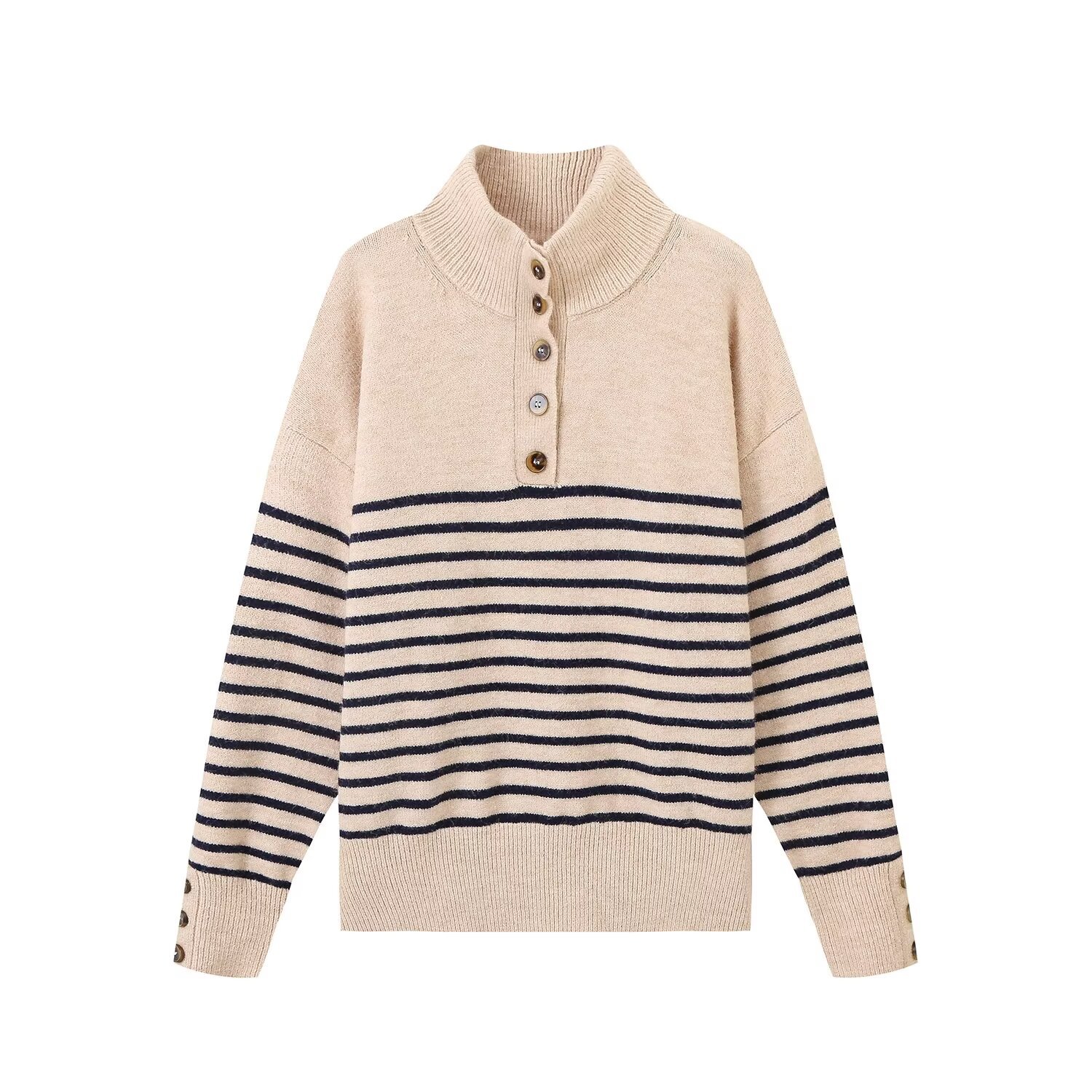 UC & ZA 국경 간 AliExpress 여성용 유럽과 미국 스타일의 수직 칼라 버클 스트라이프 느슨한 긴 소매 니트 셔츠 1509107스토어 가기