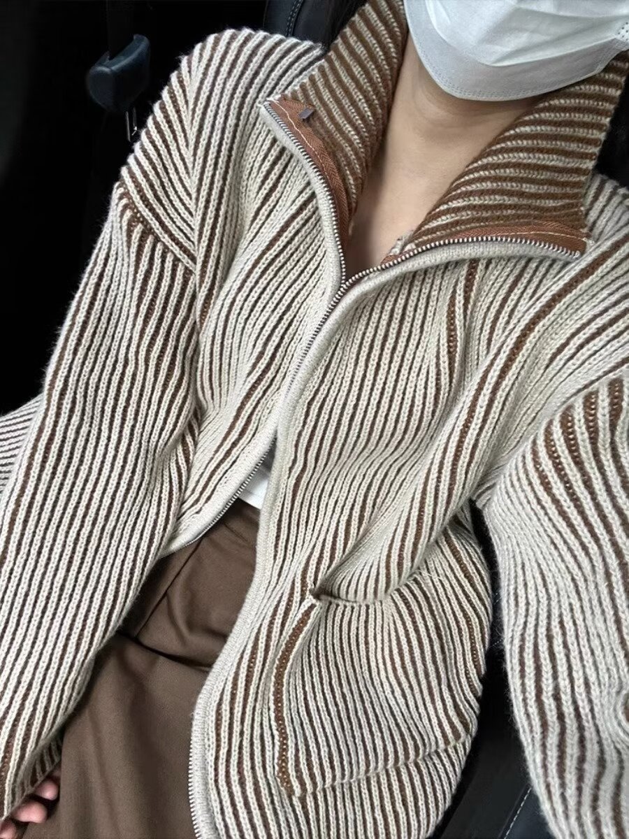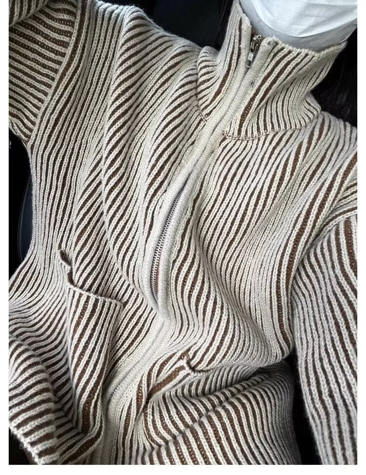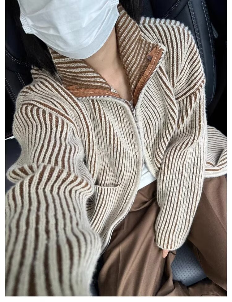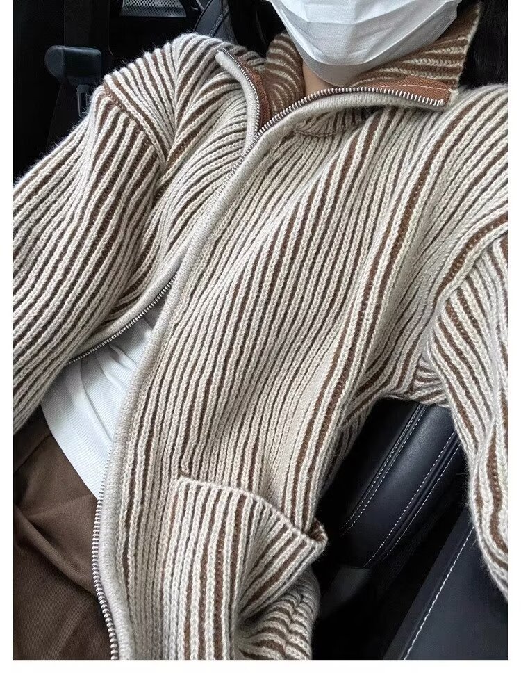 가을과 겨울 2024 새로운 수직 줄무늬 질감 카디건 스웨터 남성과 여성의 간단한 옷깃 지퍼 니트웨어스토어 가기