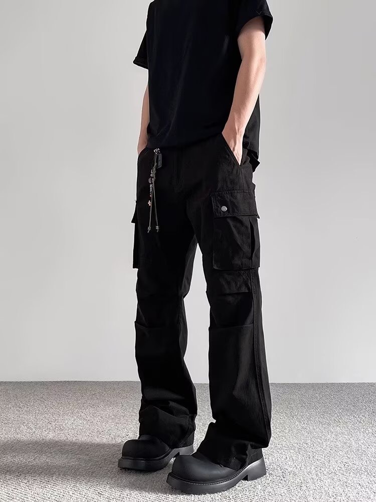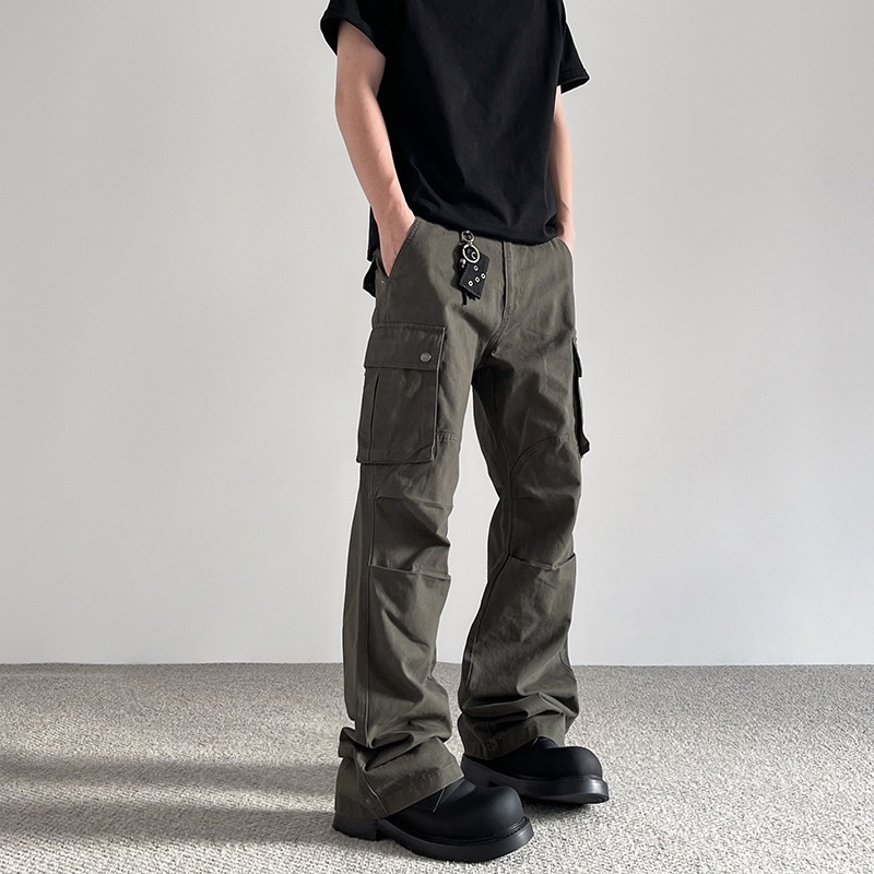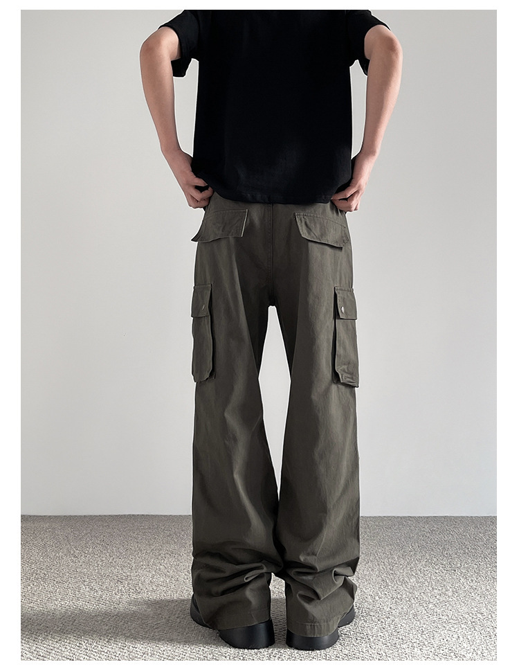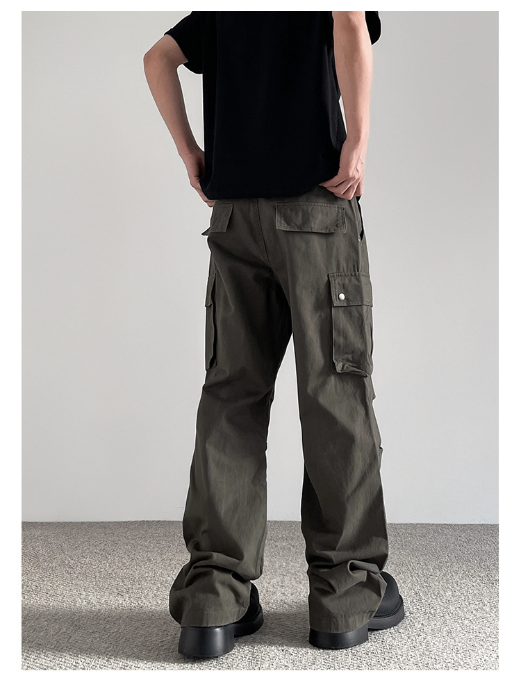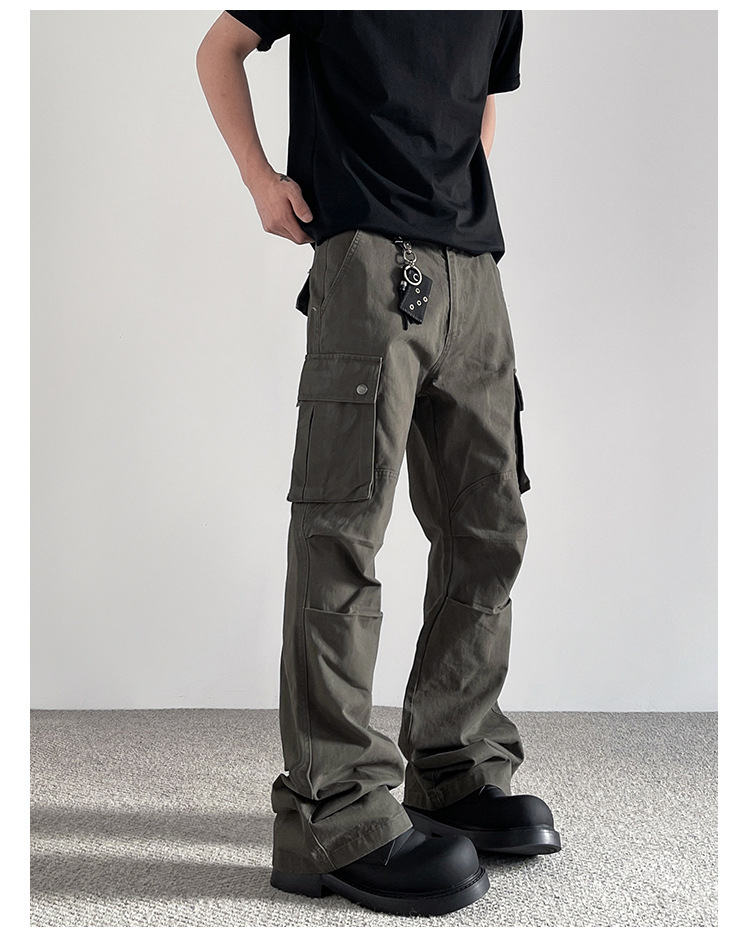 하이 스트리트 바이브 주름 낙하산 병 바지 남성 봄과 가을 미국 스타일 레트로 멀티 포켓 스트레이트 마이크로 캐주얼 바지