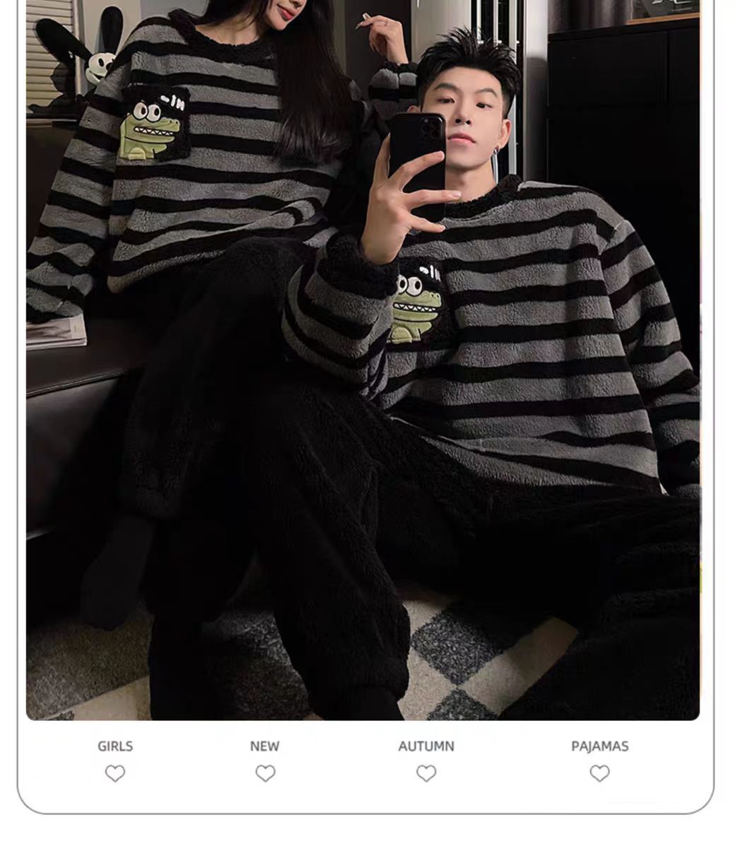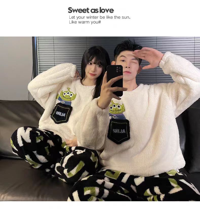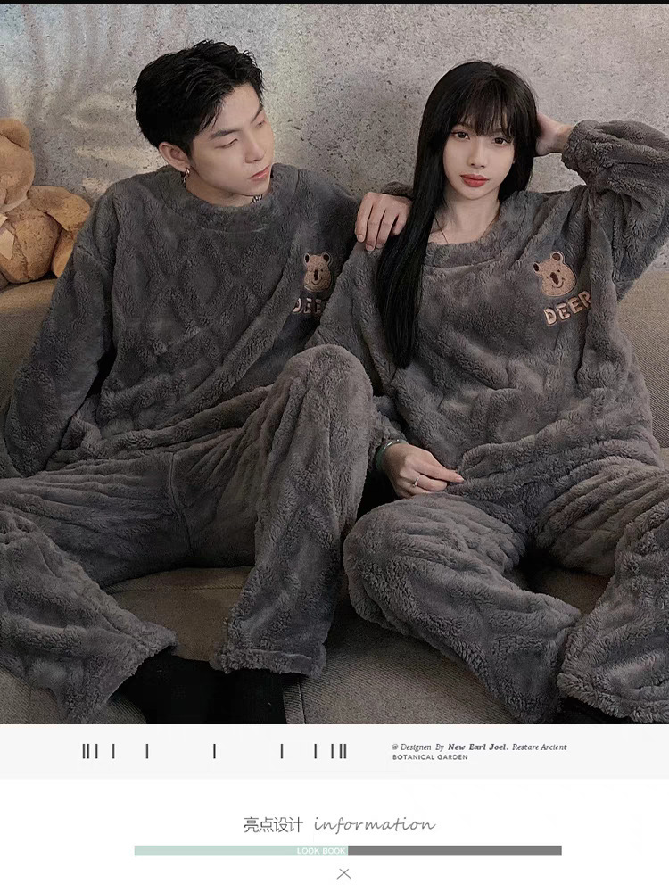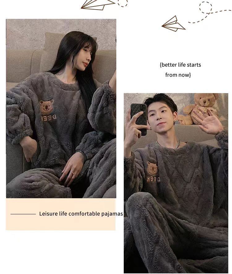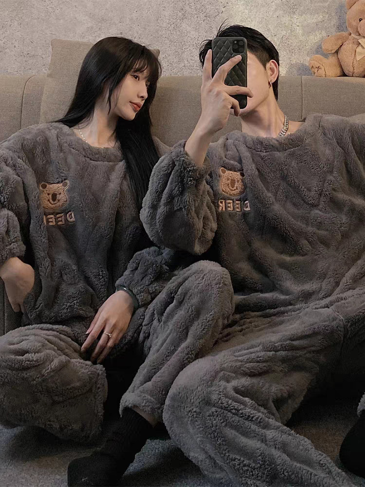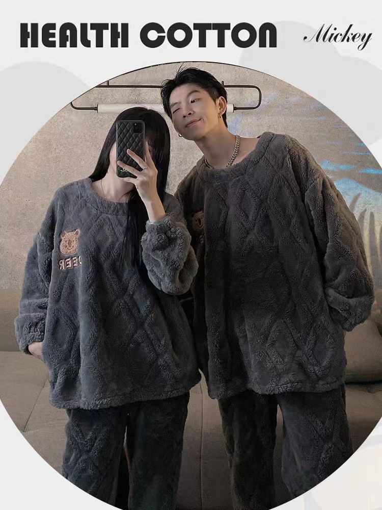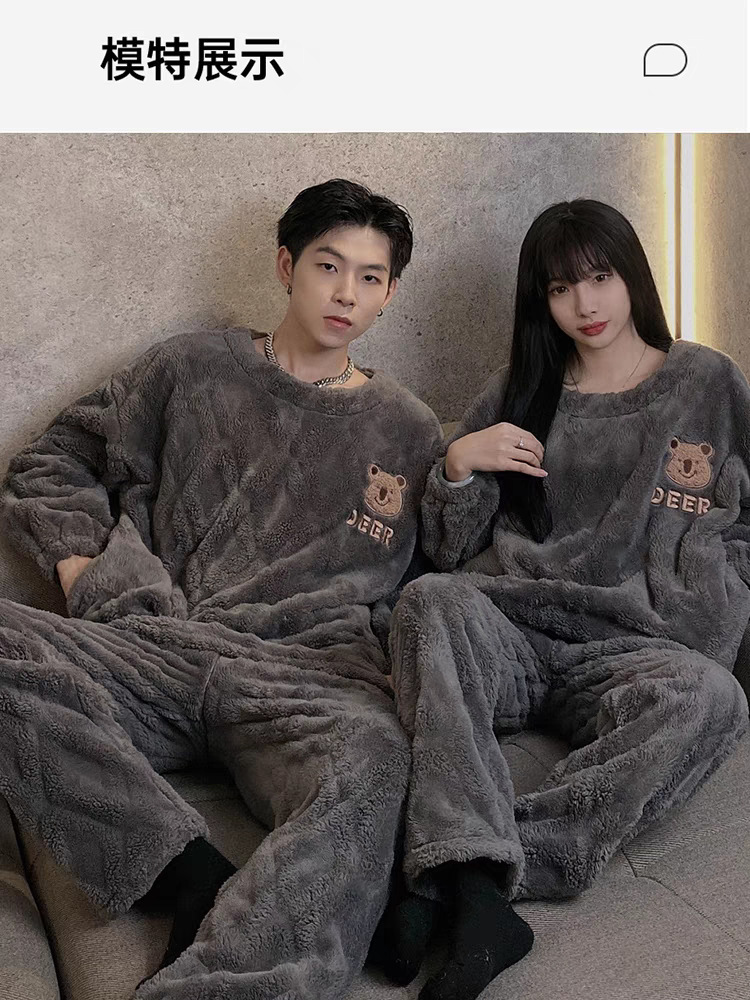 커플 잠옷 여성의 가을과 겨울 플란넬 간단한 만화 산호 양털 남자의 겨울 두꺼운 기모 홈 옷 세트스토어 가기