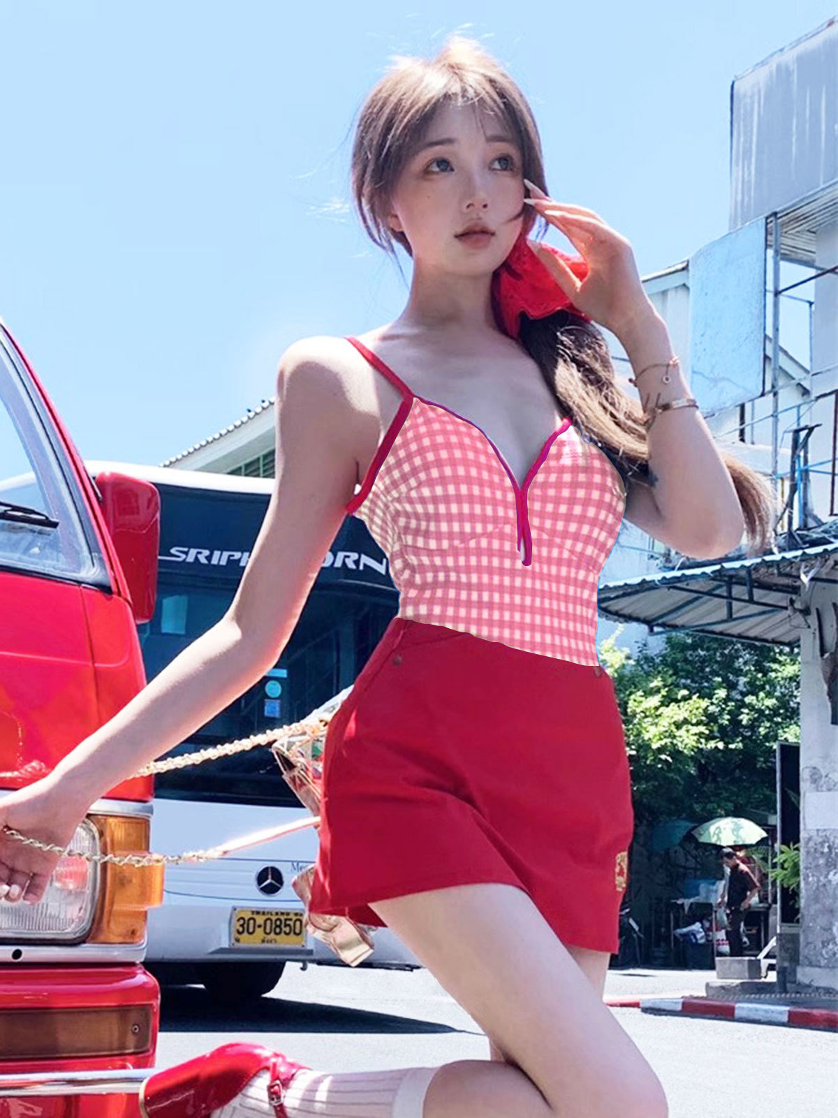 • 핑크색 수영복 + 빨간색 스커트