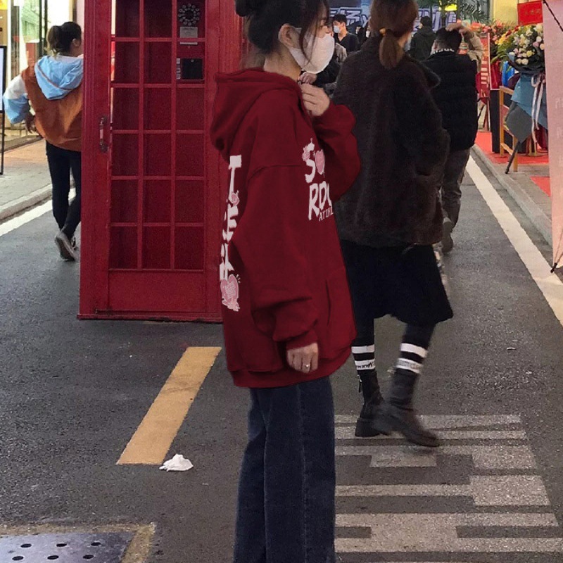 스트레이트 헤어 큰 아이들이 새해 축하 버건디 후드 조끼 봄과 가을 중학교 소스 고등학생 외국인 스타일 소녀 기모스토어 가기