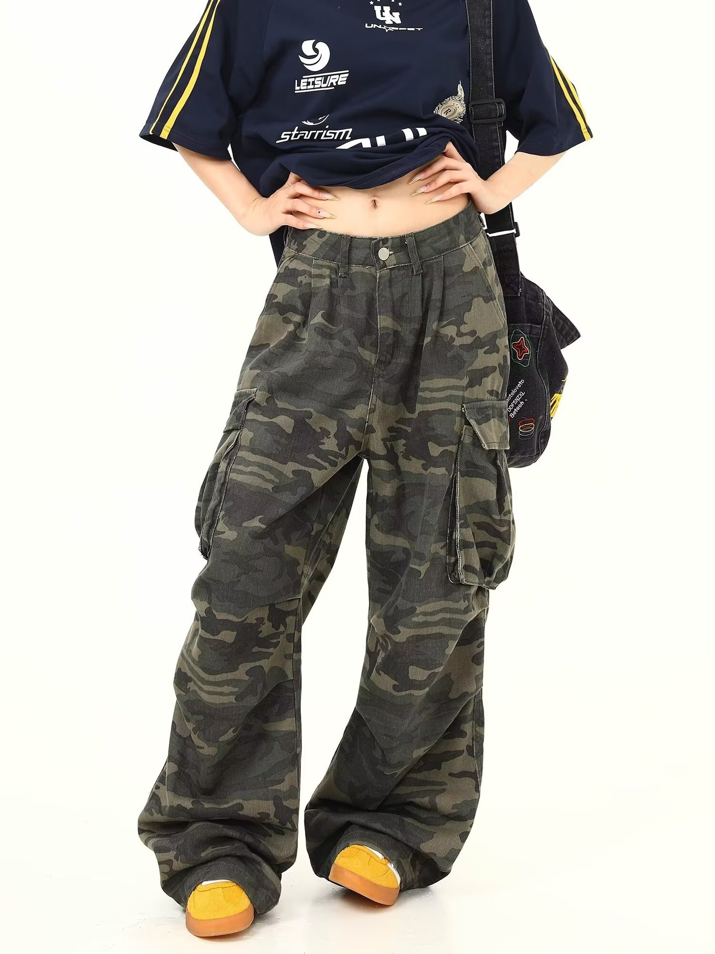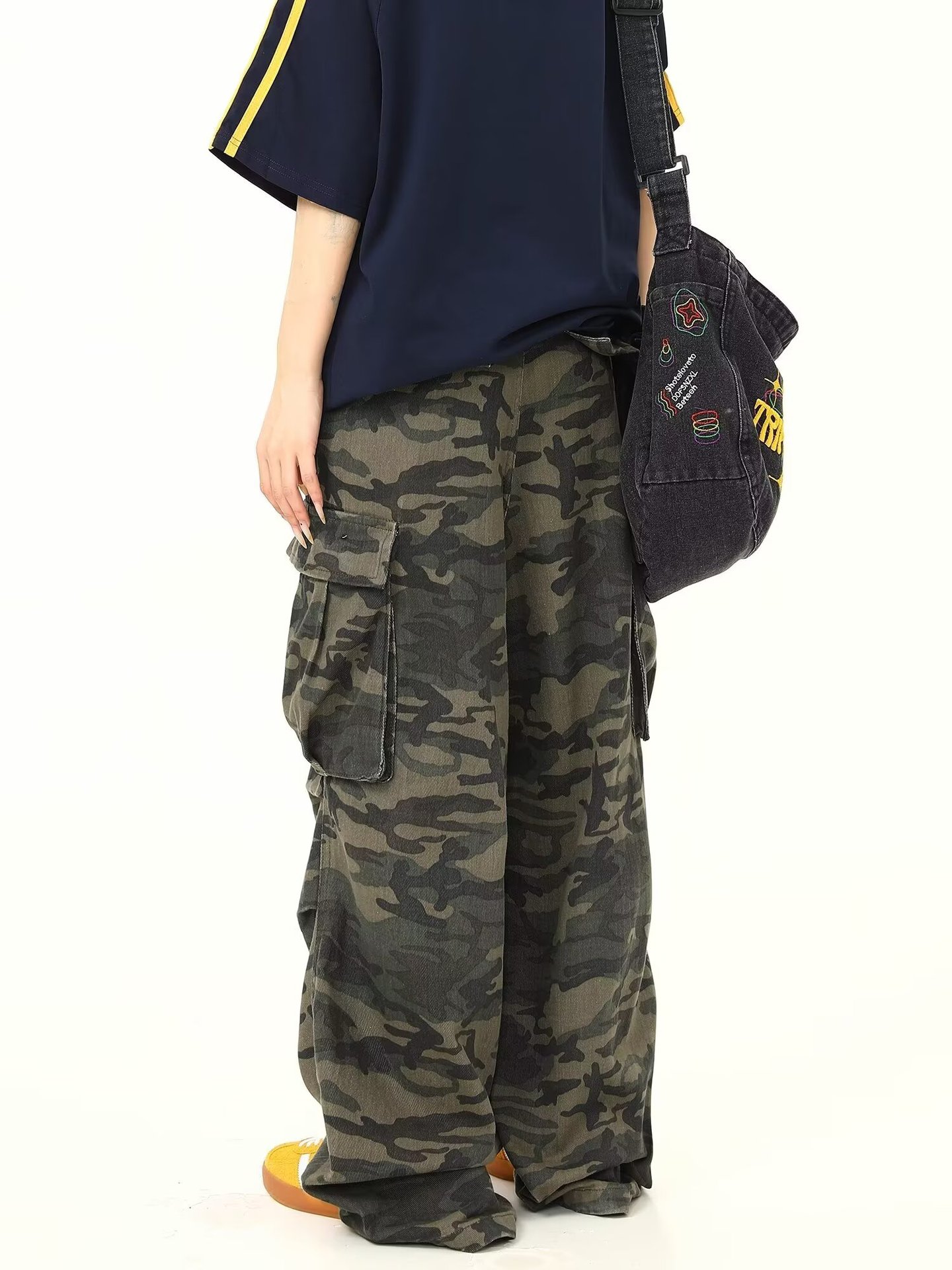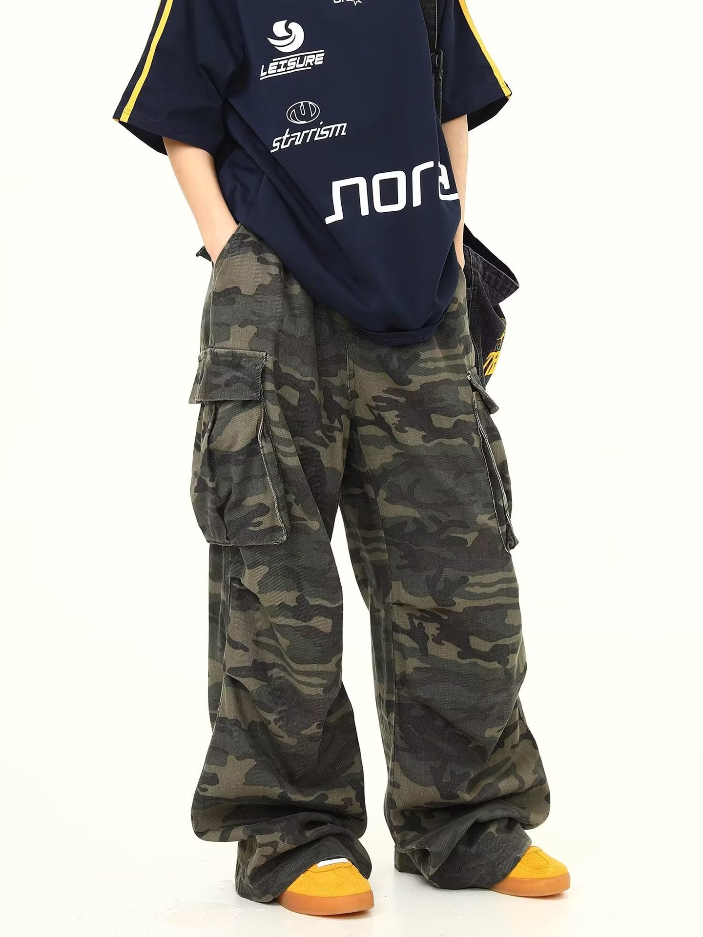 아메리칸 스타일 레트로 디자인 센스 빅 포켓 위장 툴링 청바지 남성용 느슨한 올매치 스트레이트 레그 와이드 레그 바지스토어 가기