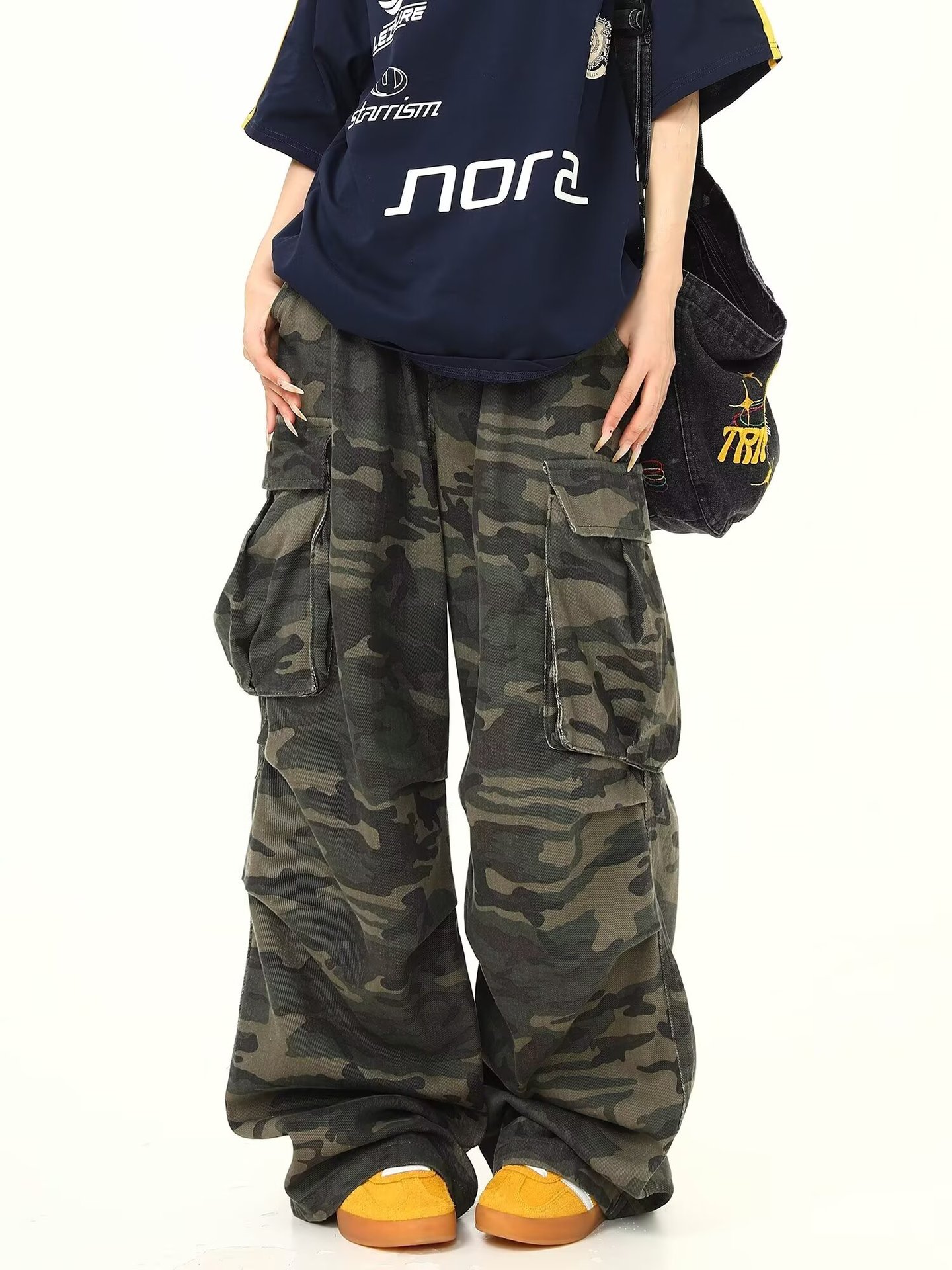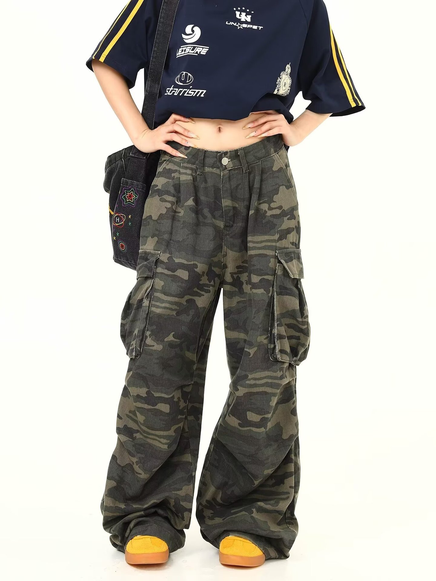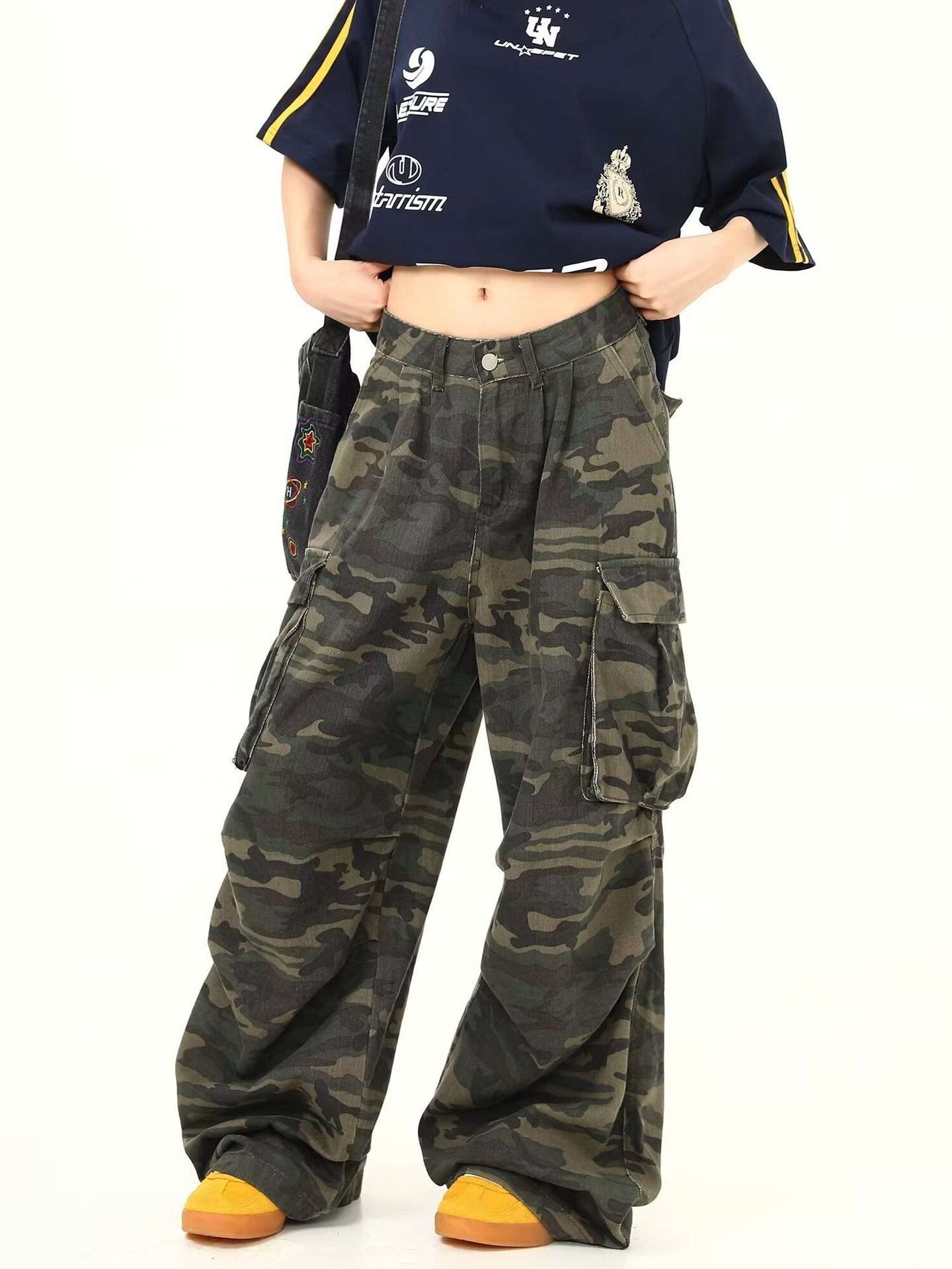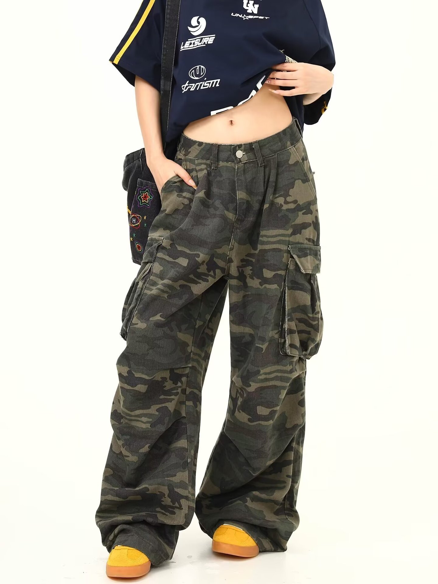 아메리칸 스타일 레트로 디자인 센스 빅 포켓 위장 툴링 청바지 남성용 느슨한 올매치 스트레이트 레그 와이드 레그 바지스토어 가기