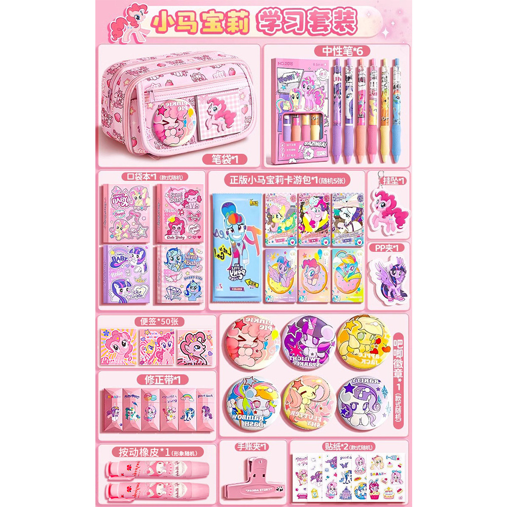 • 9단 핑크 필통 + 포니 카드 게임 가방 + 스티커 2개 + 바지 1개 + 펜던트 1개 + PP 클립 1 + 정품 지우개 1 + 젤펜 6 + 지팡이 클립 1 + 수정 테이프_