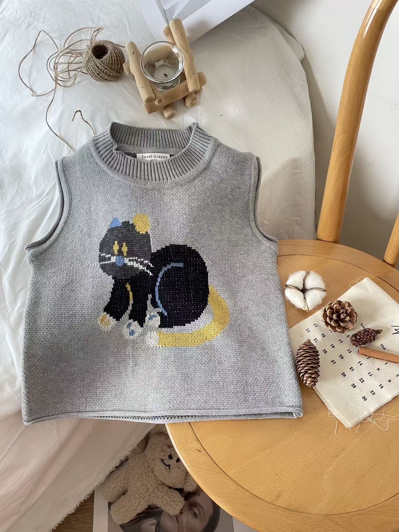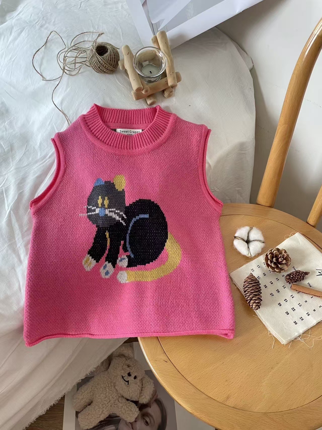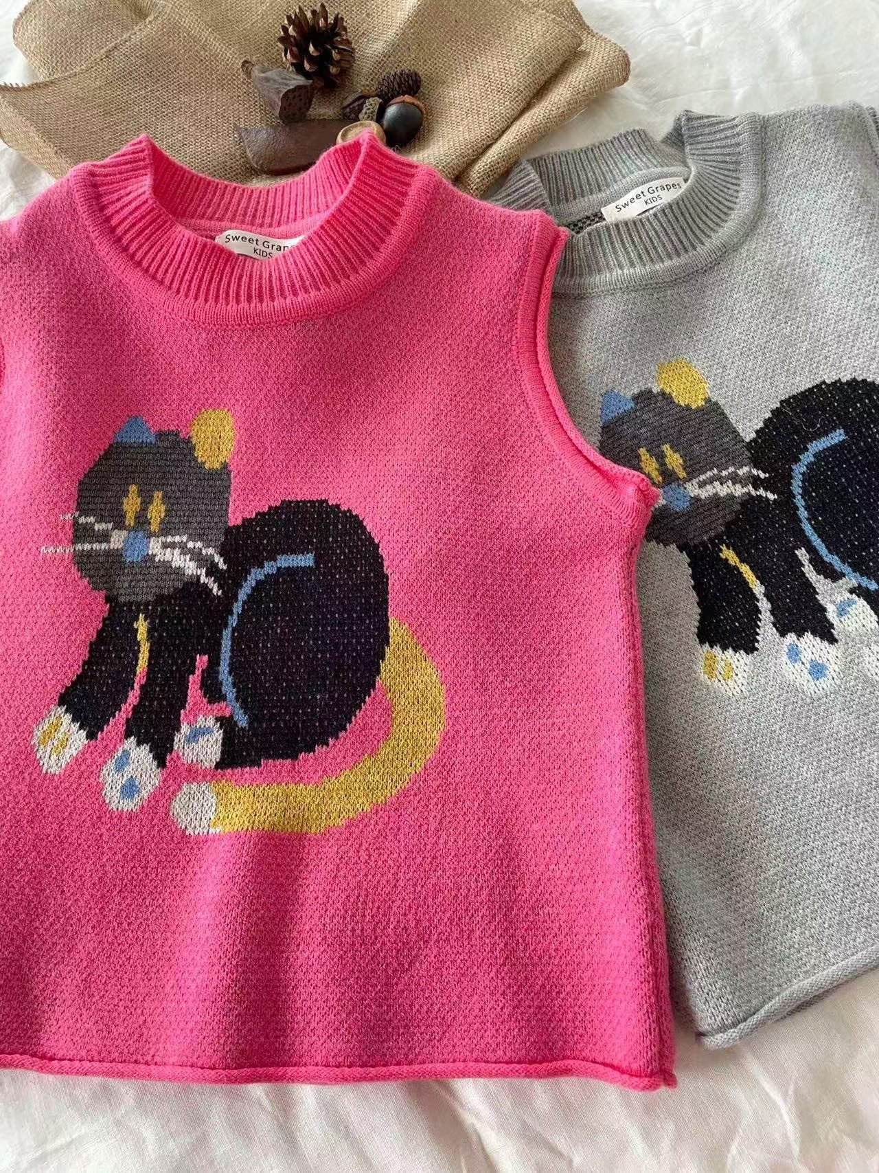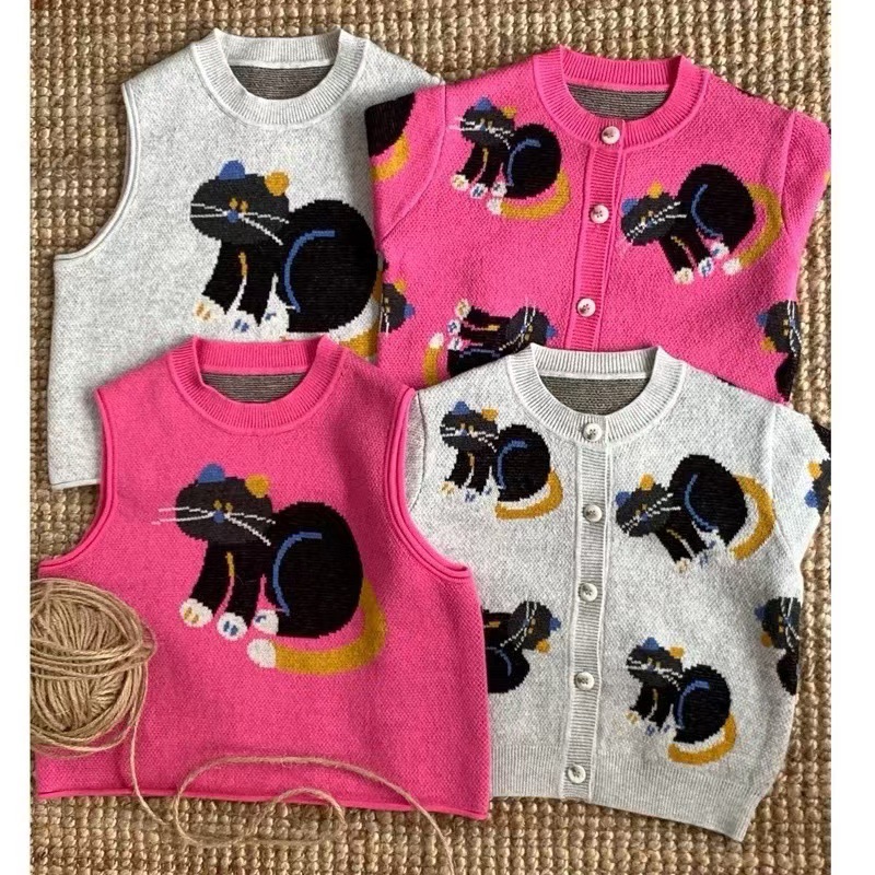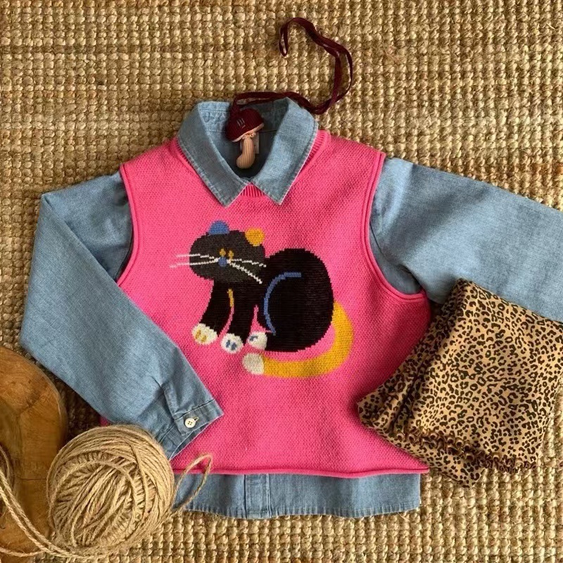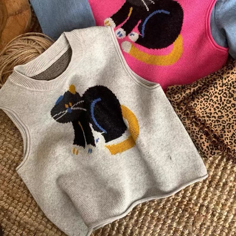 어린이 조끼 봄과 가을 2024 새로운 스타일 서양 스타일 유행 만화 자카드 허리 코트 남자와 여자를위한 니트 조끼 탑스토어 가기