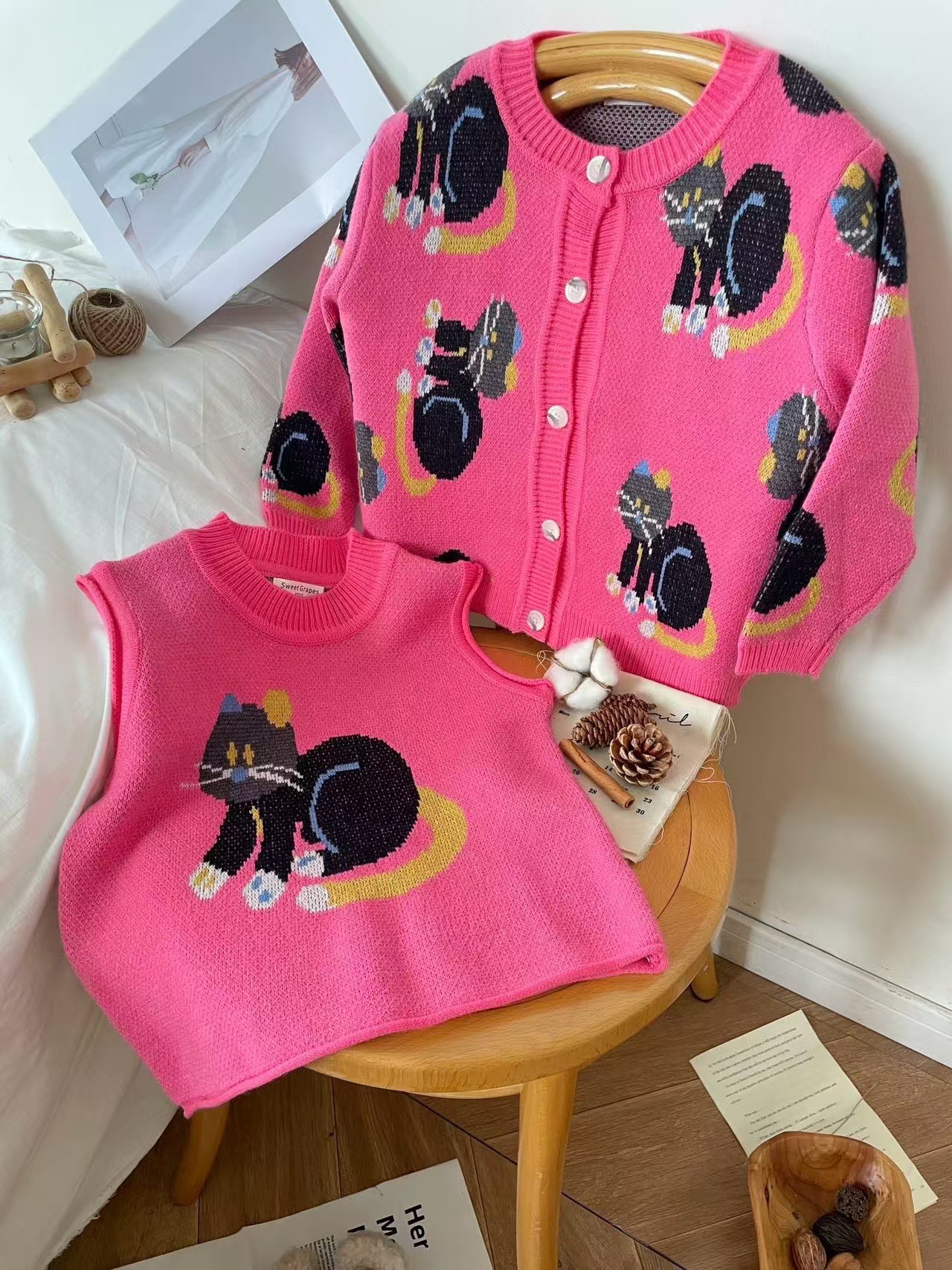 어린이 조끼 봄과 가을 2024 새로운 스타일 서양 스타일 유행 만화 자카드 허리 코트 남자와 여자를위한 니트 조끼 탑
