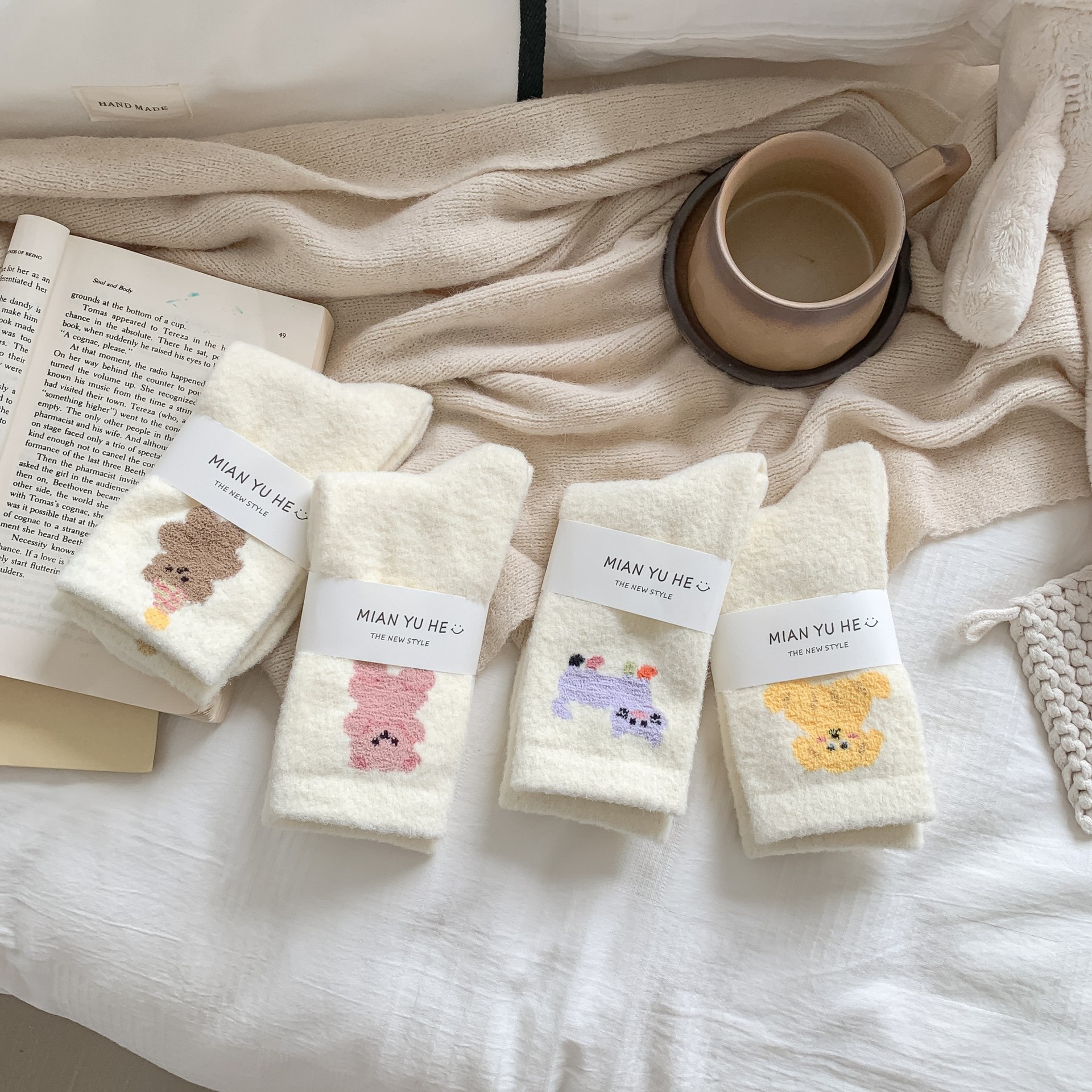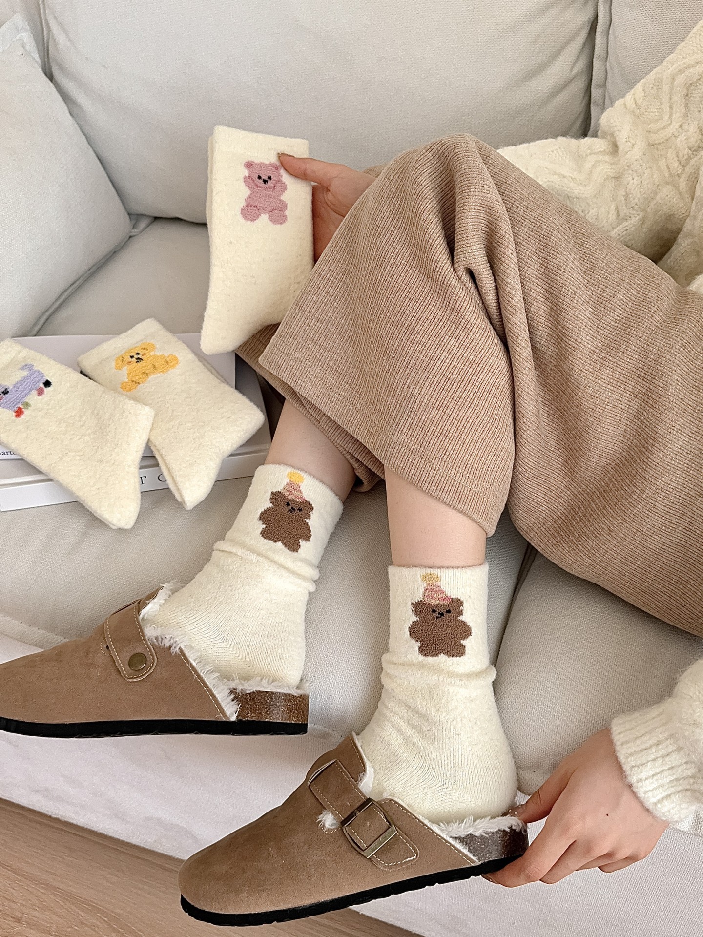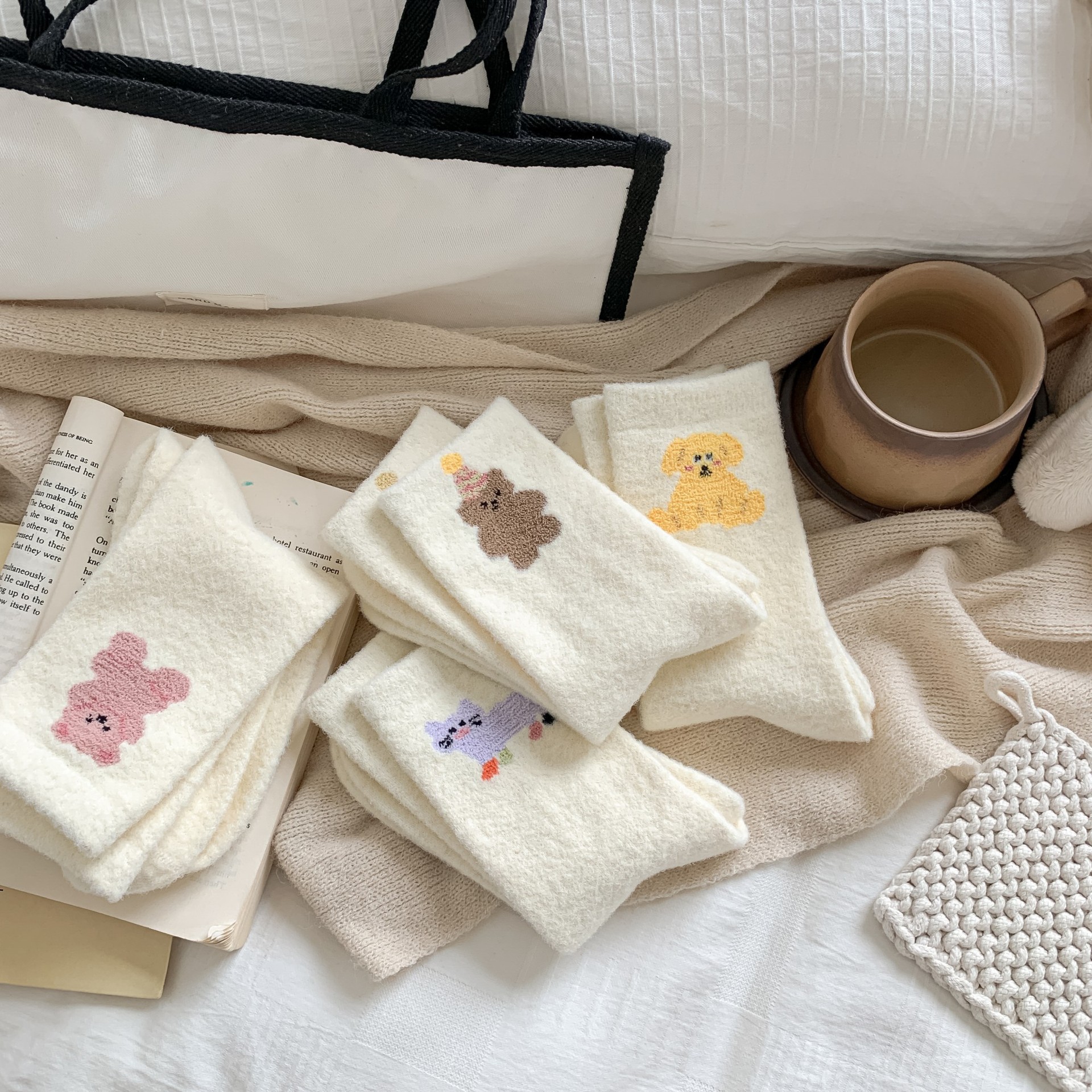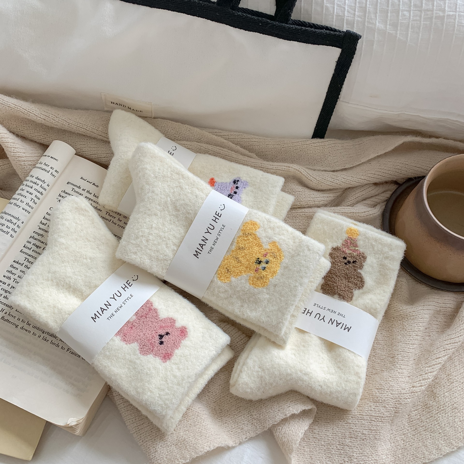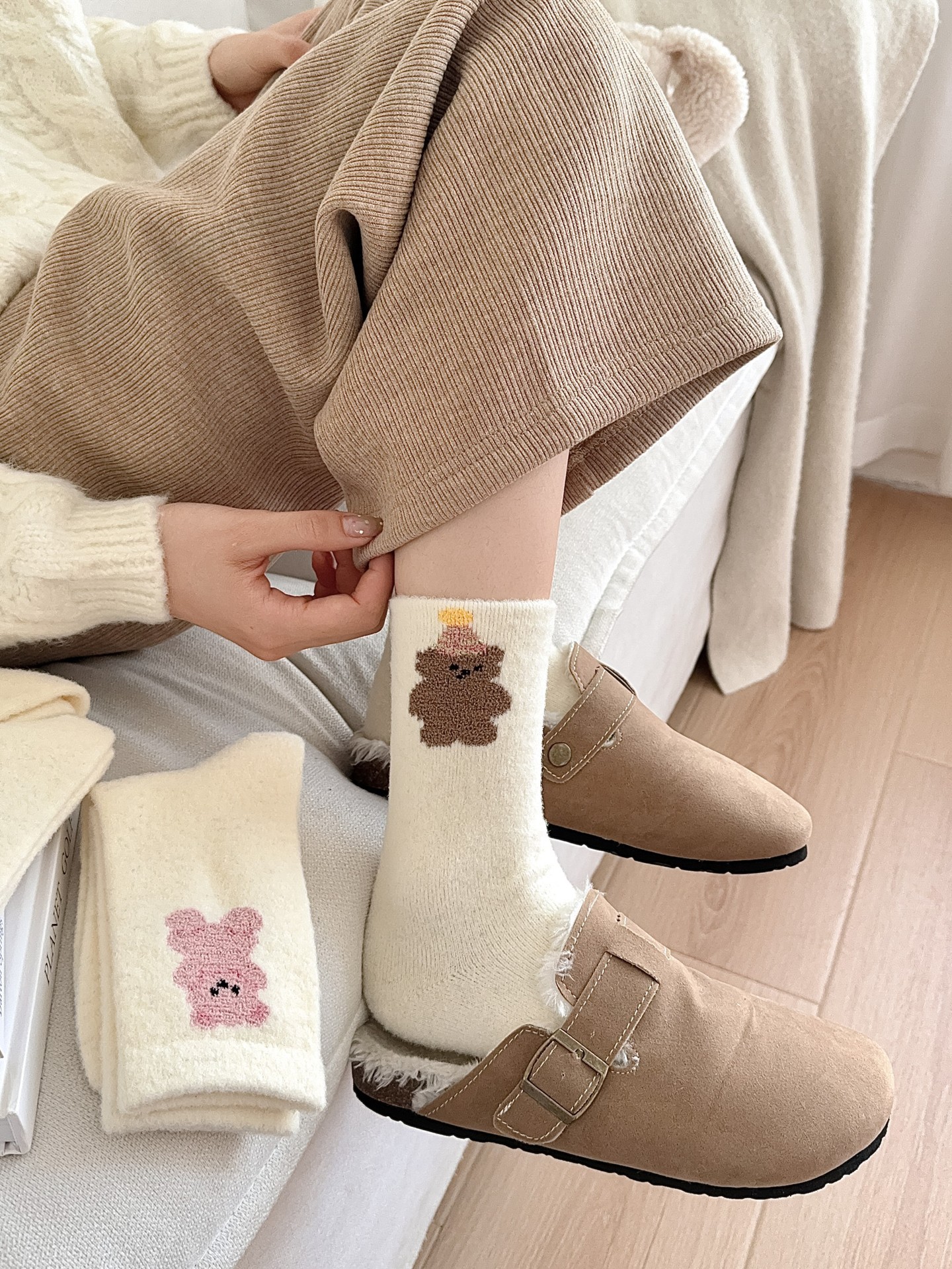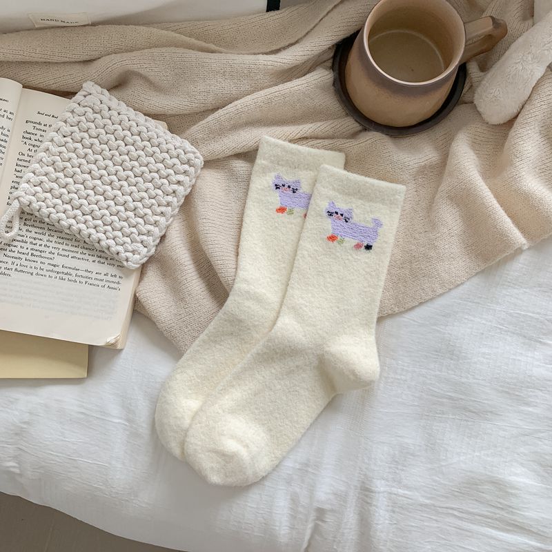 귀여운 곰 회색 벨벳 화이트 양말 여성의 중간 길이 양말 가을과 겨울 기모 두꺼운 따뜻한 일본 스타일 만화 겨울 스타킹스토어 가기