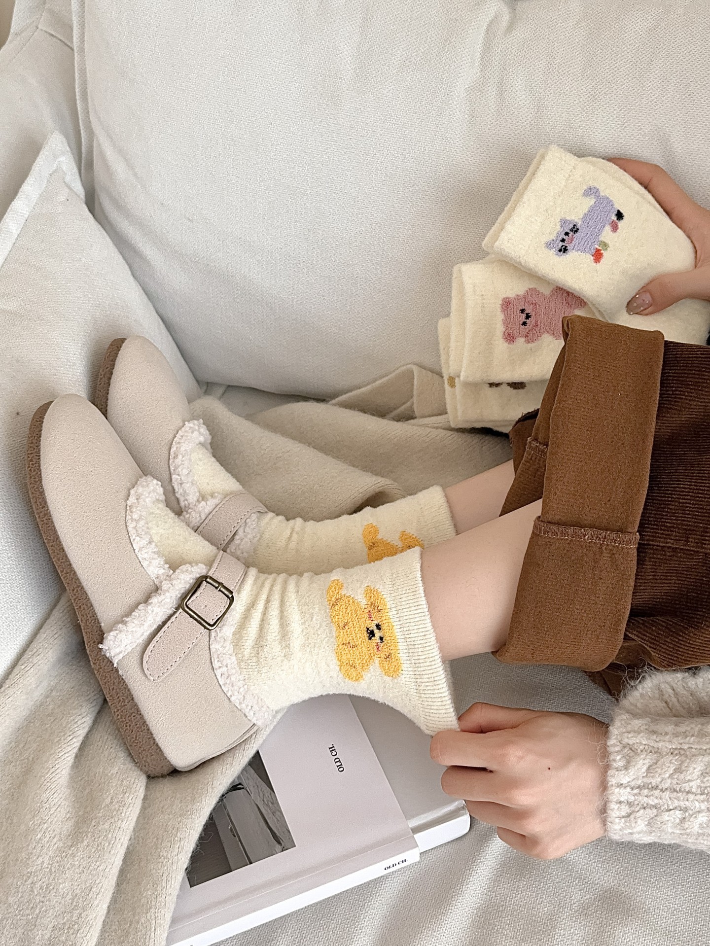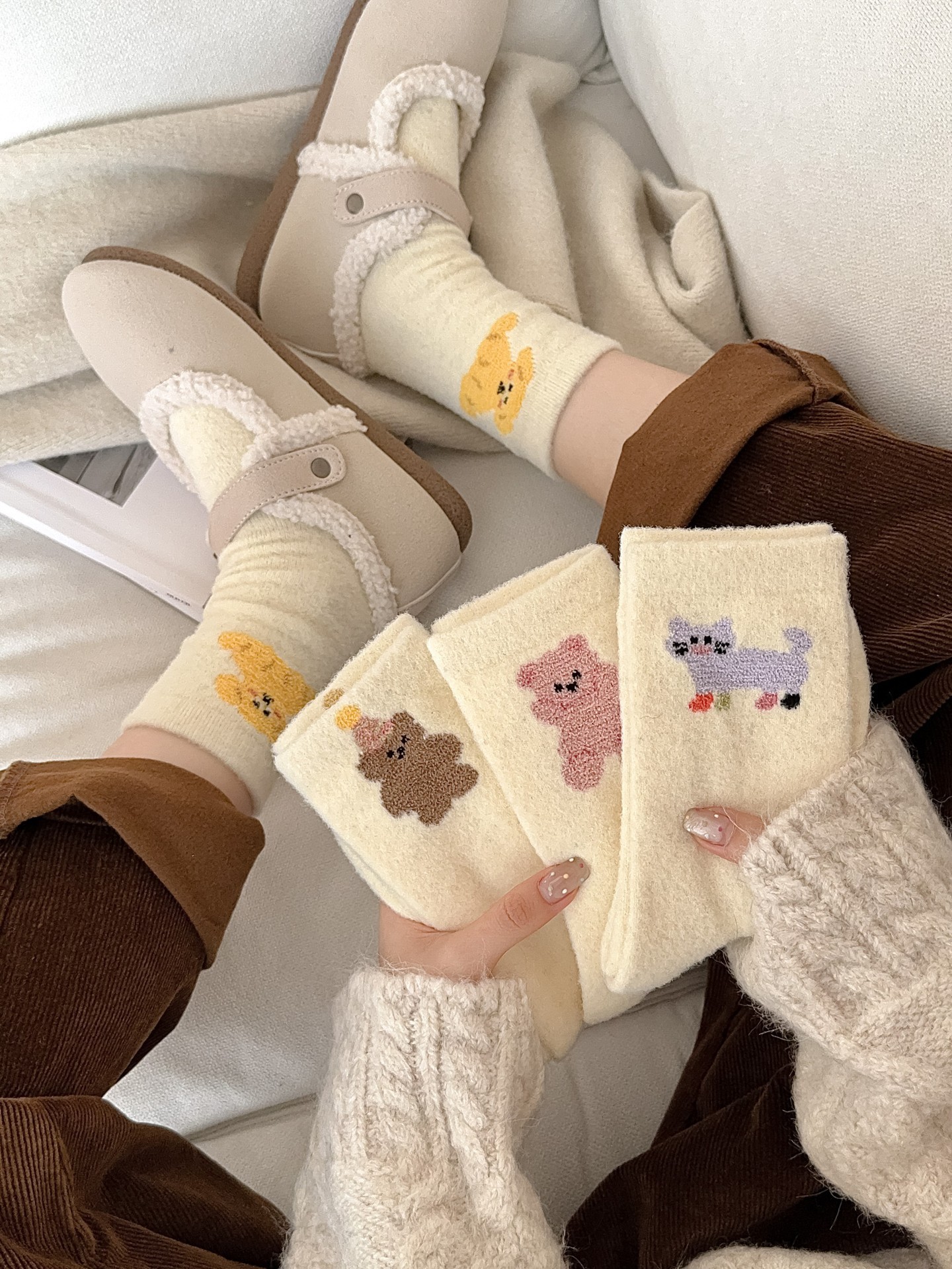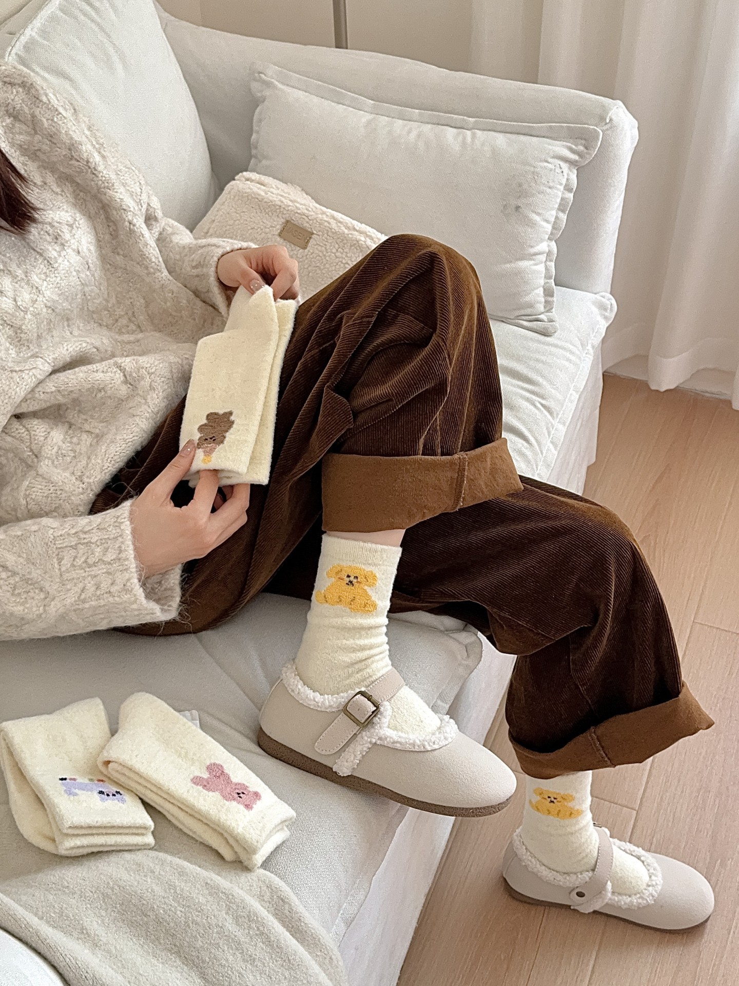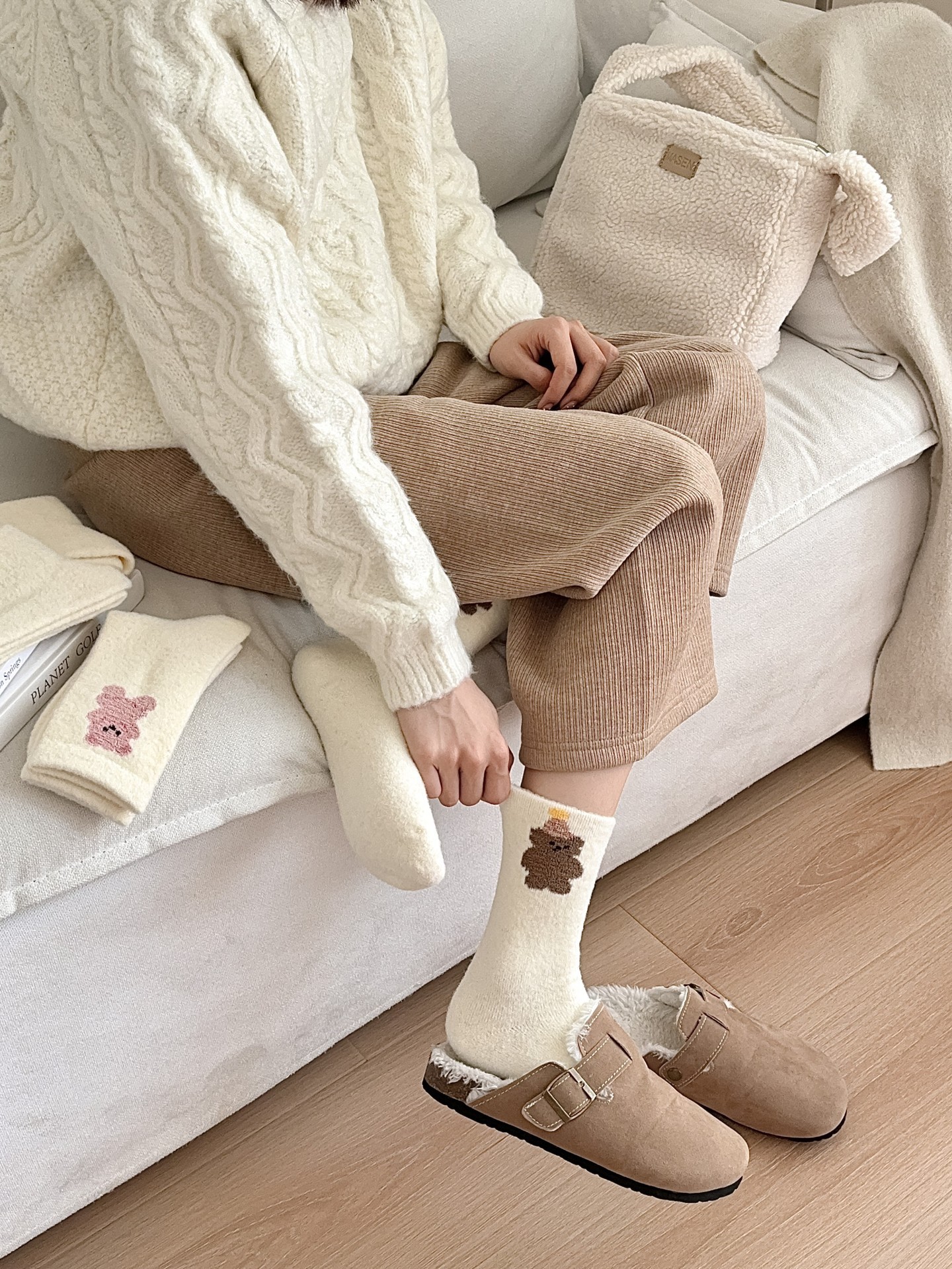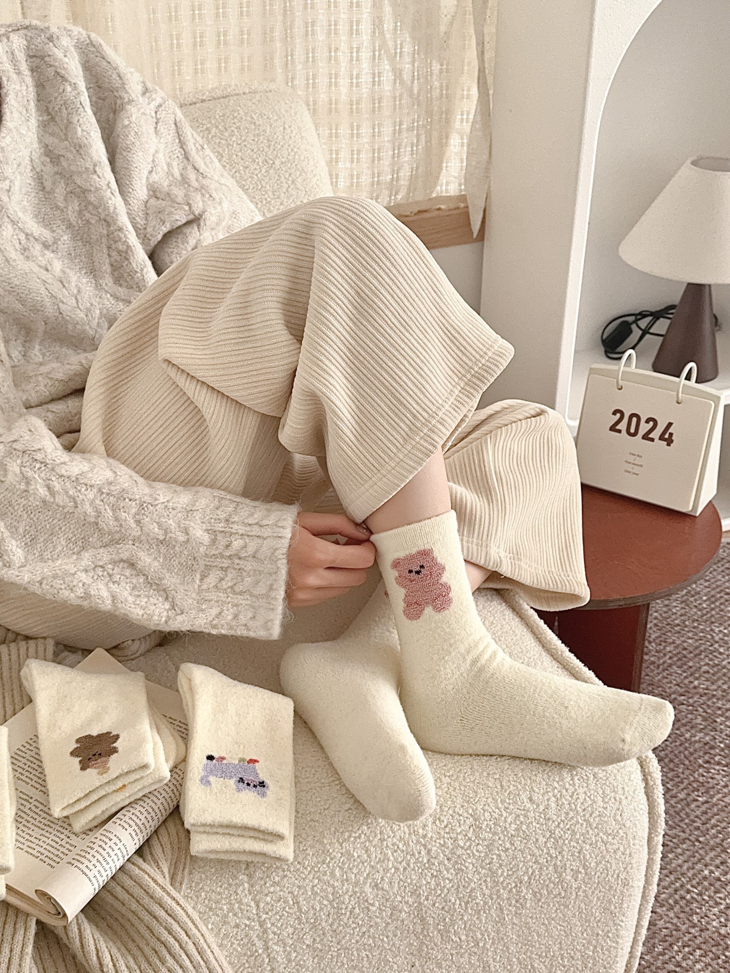 귀여운 곰 회색 벨벳 화이트 양말 여성의 중간 길이 양말 가을과 겨울 기모 두꺼운 따뜻한 일본 스타일 만화 겨울 스타킹스토어 가기