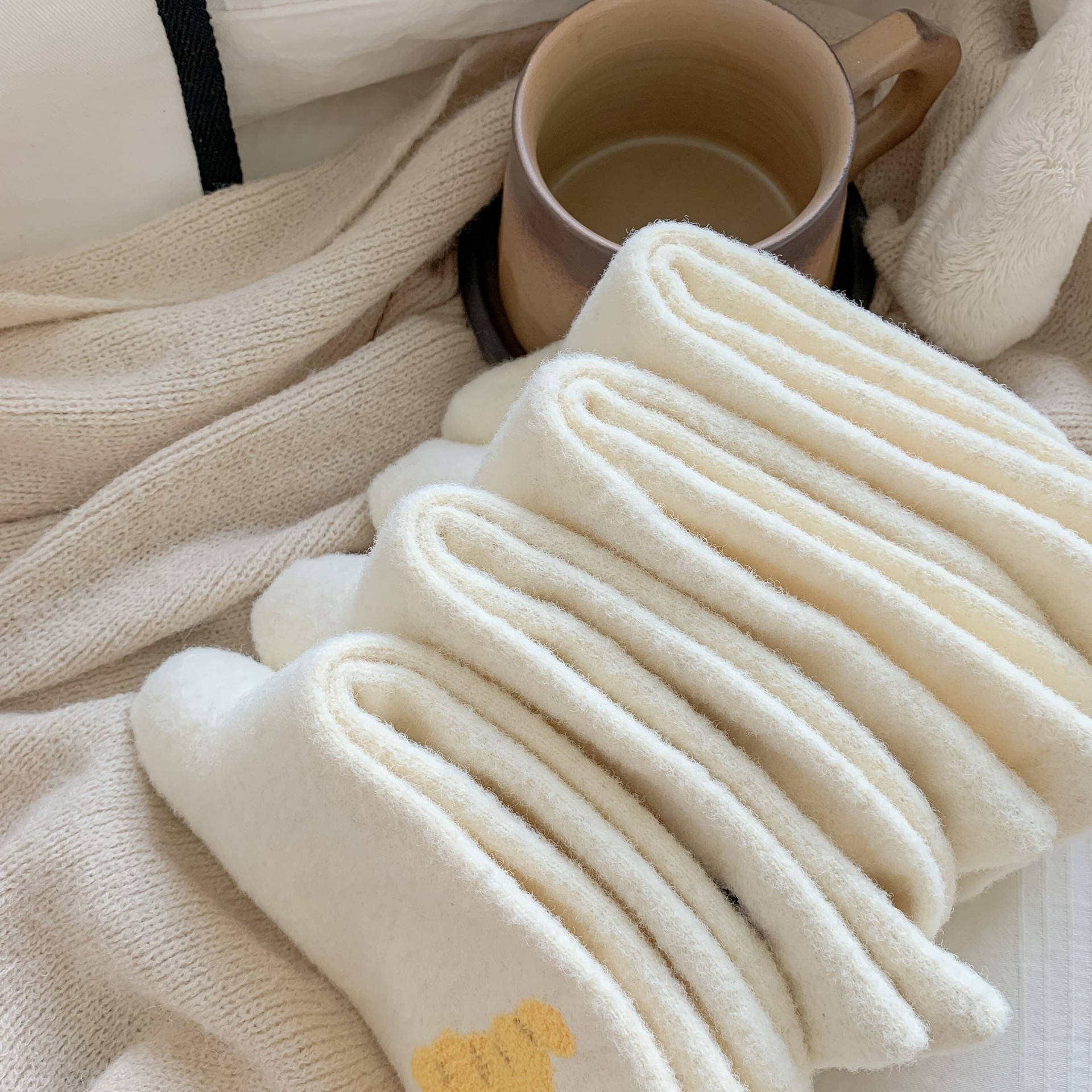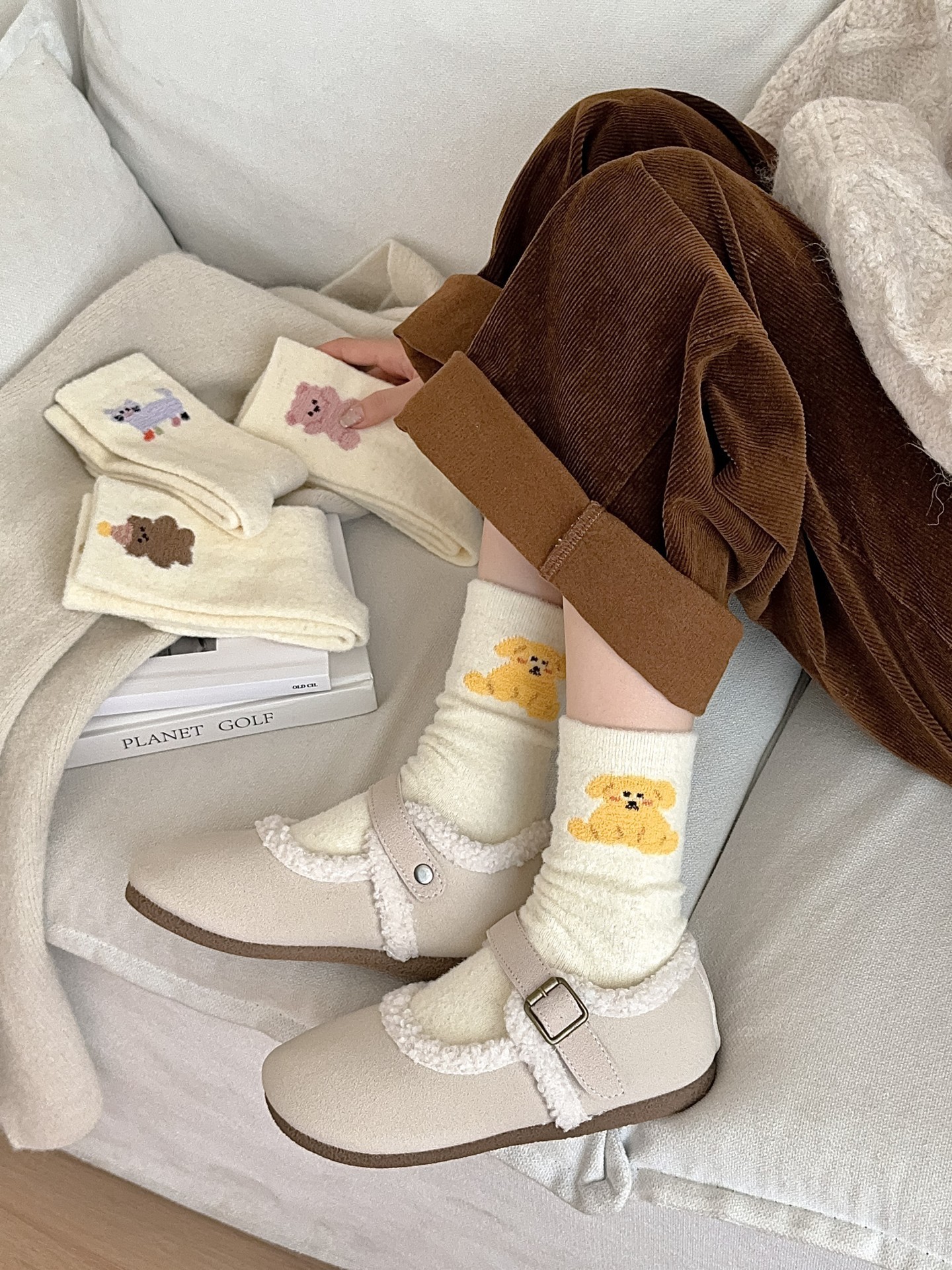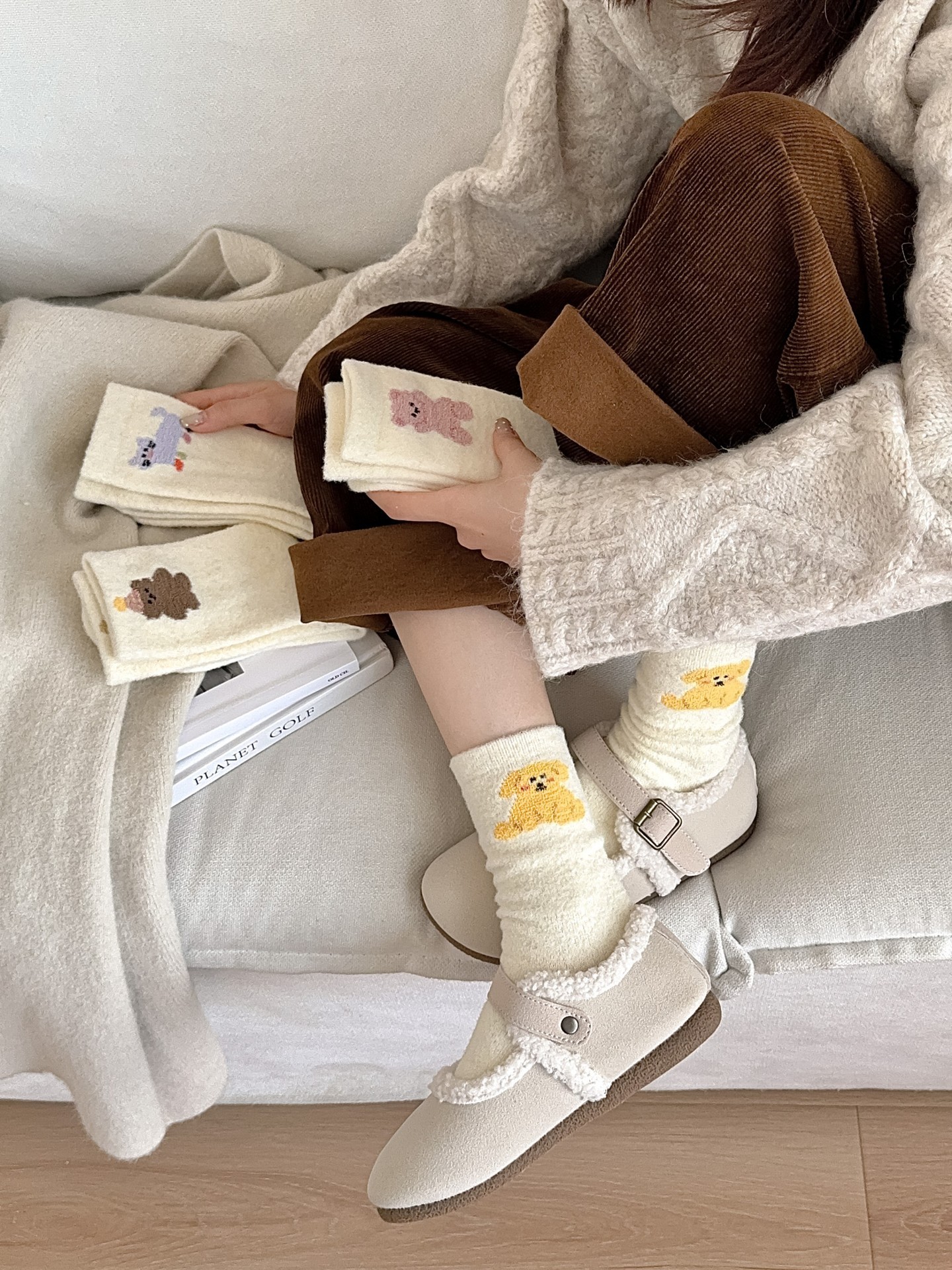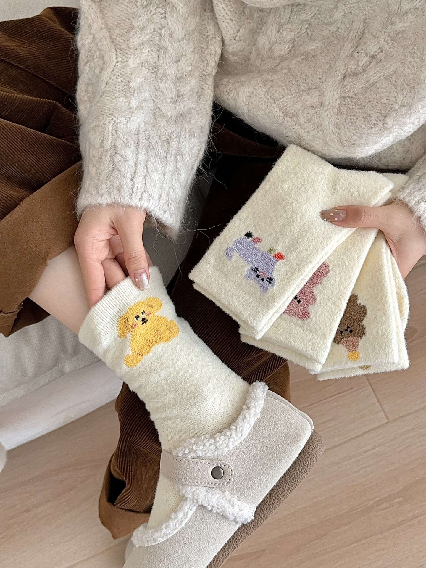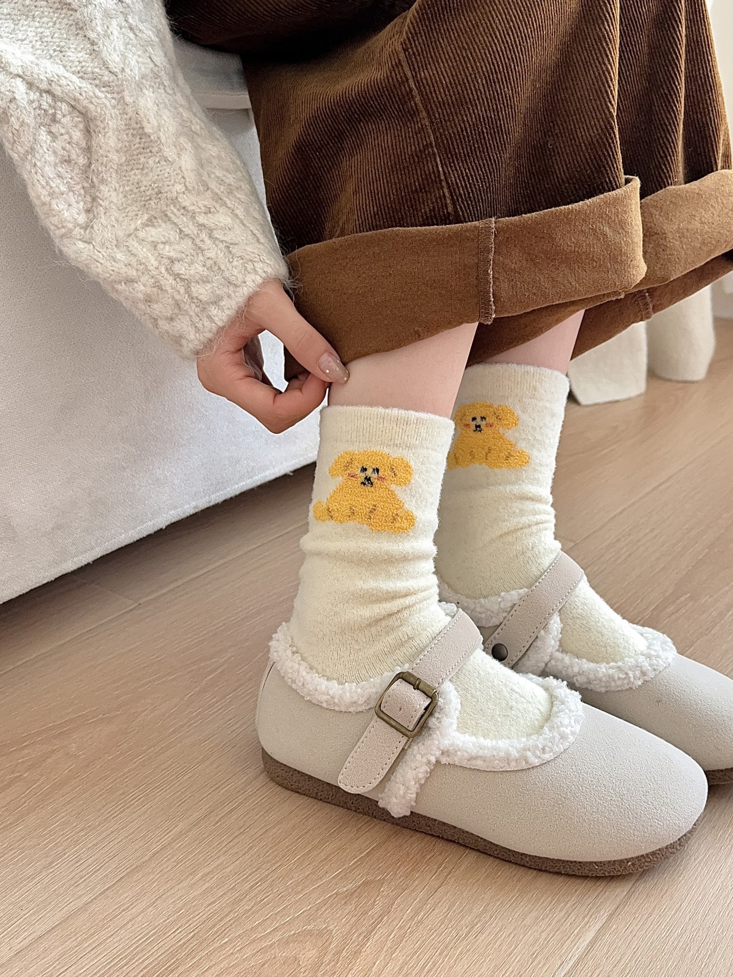 귀여운 곰 회색 벨벳 화이트 양말 여성의 중간 길이 양말 가을과 겨울 기모 두꺼운 따뜻한 일본 스타일 만화 겨울 스타킹스토어 가기