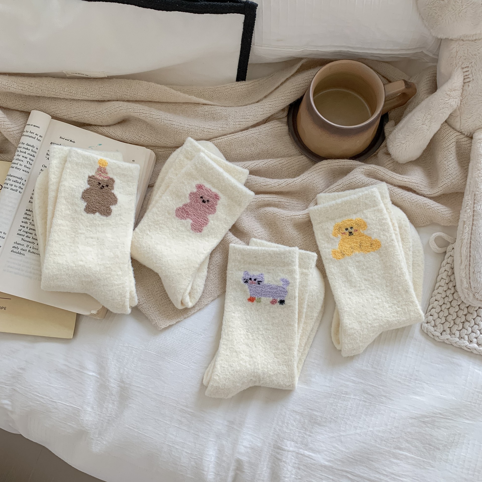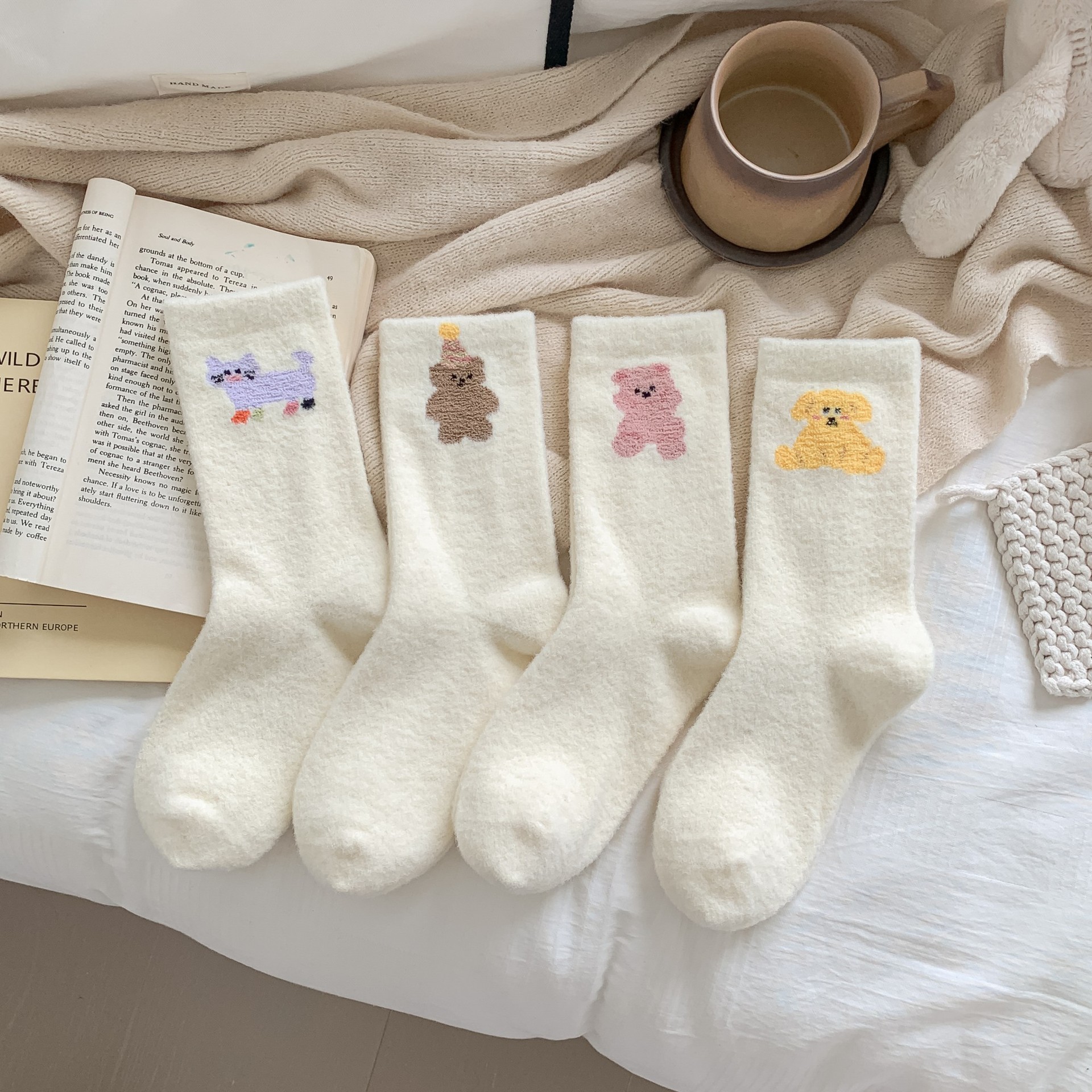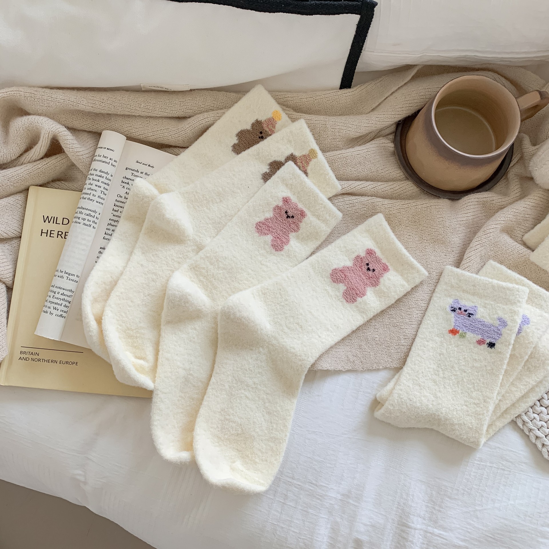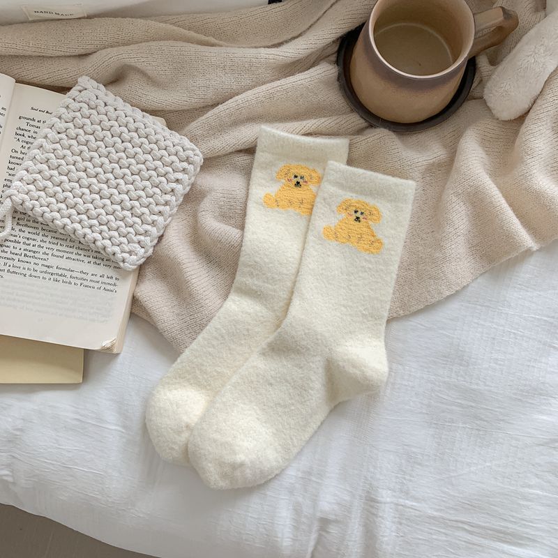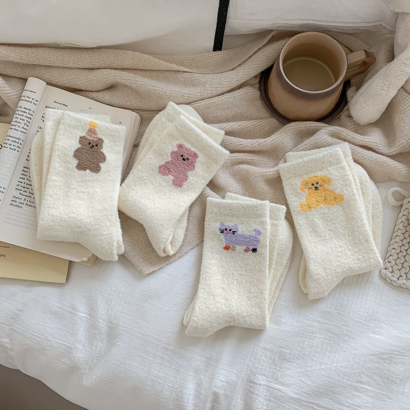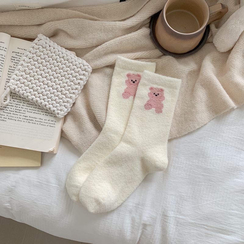 귀여운 곰 회색 벨벳 화이트 양말 여성의 중간 길이 양말 가을과 겨울 기모 두꺼운 따뜻한 일본 스타일 만화 겨울 스타킹