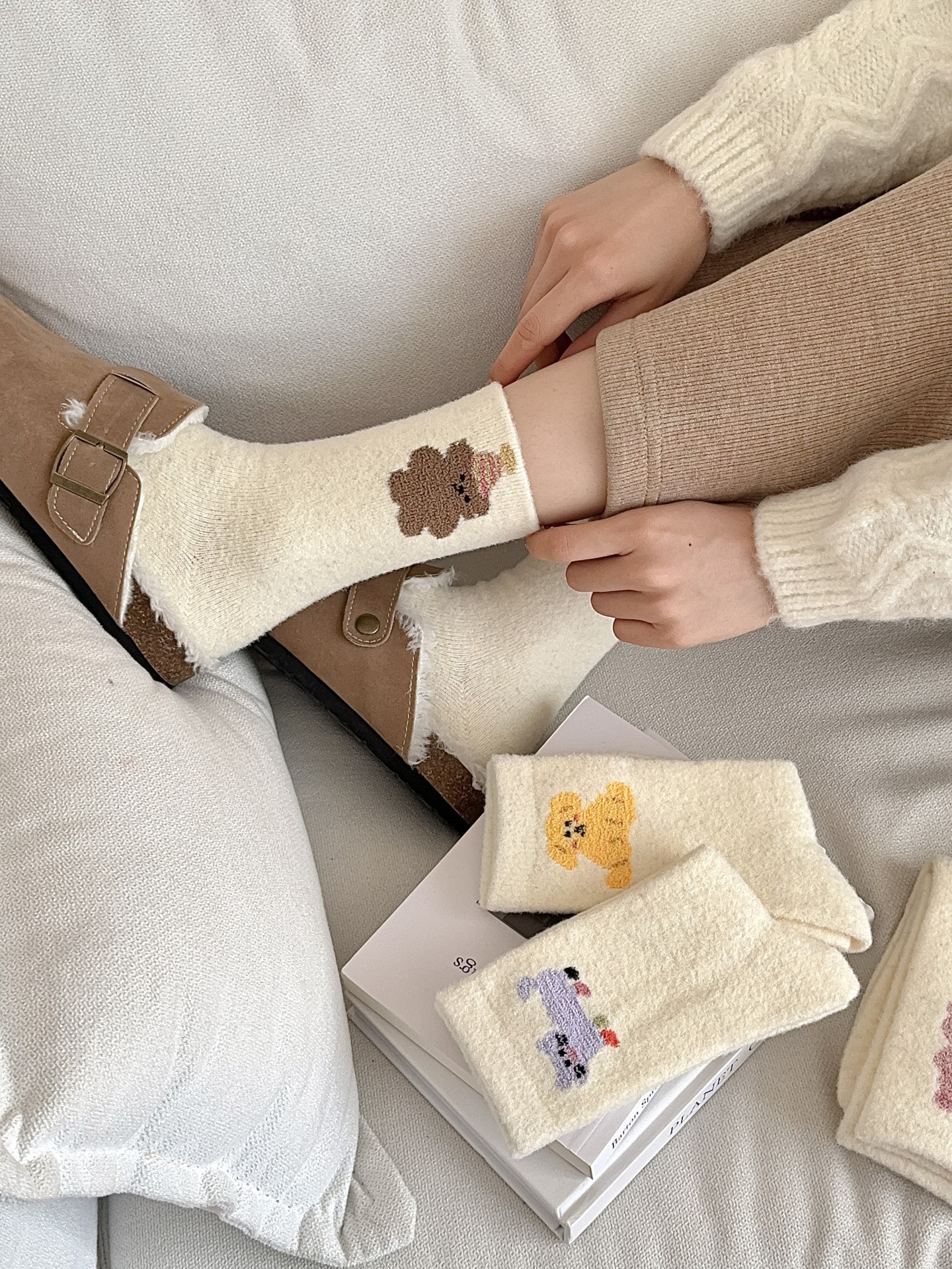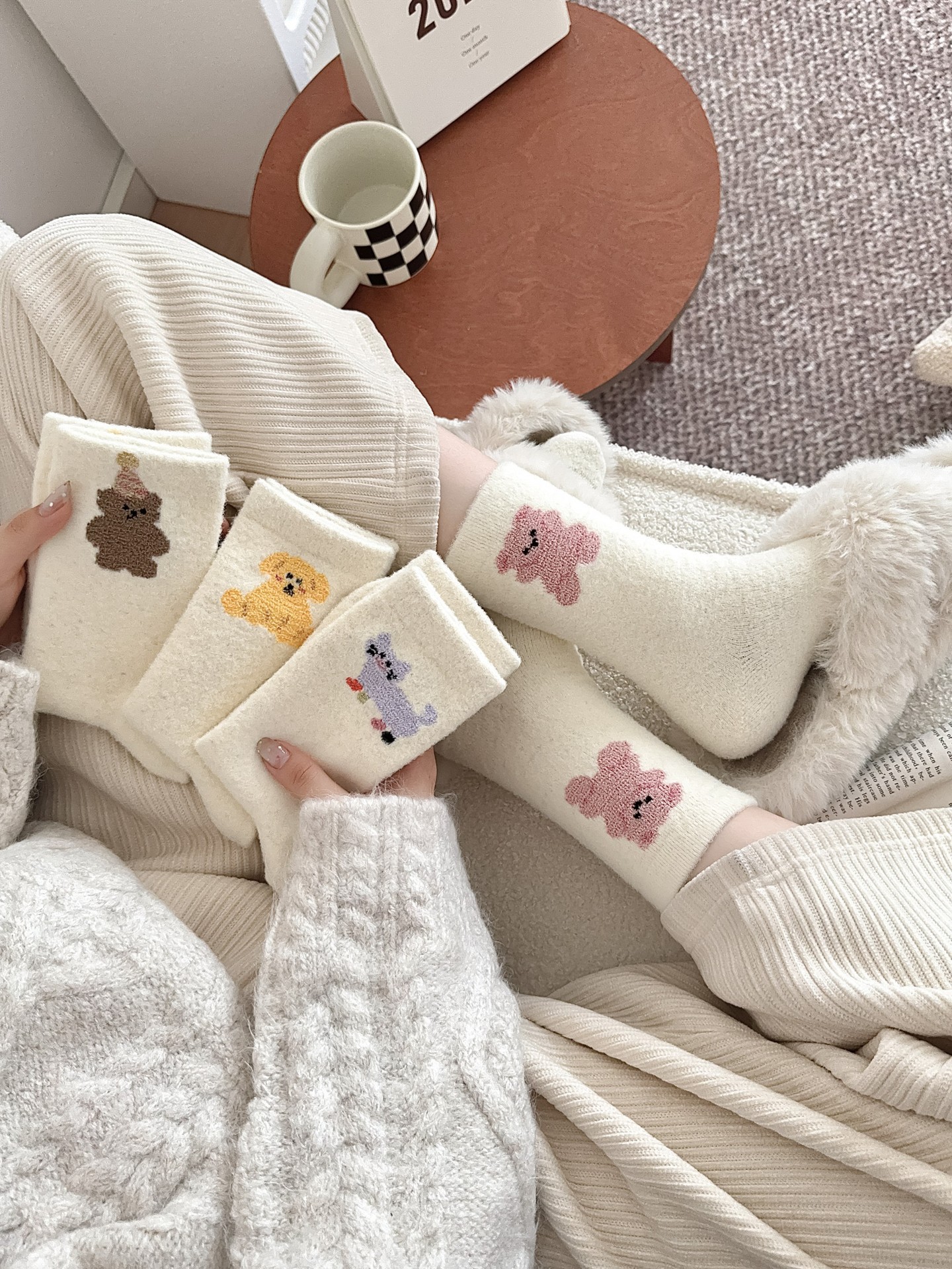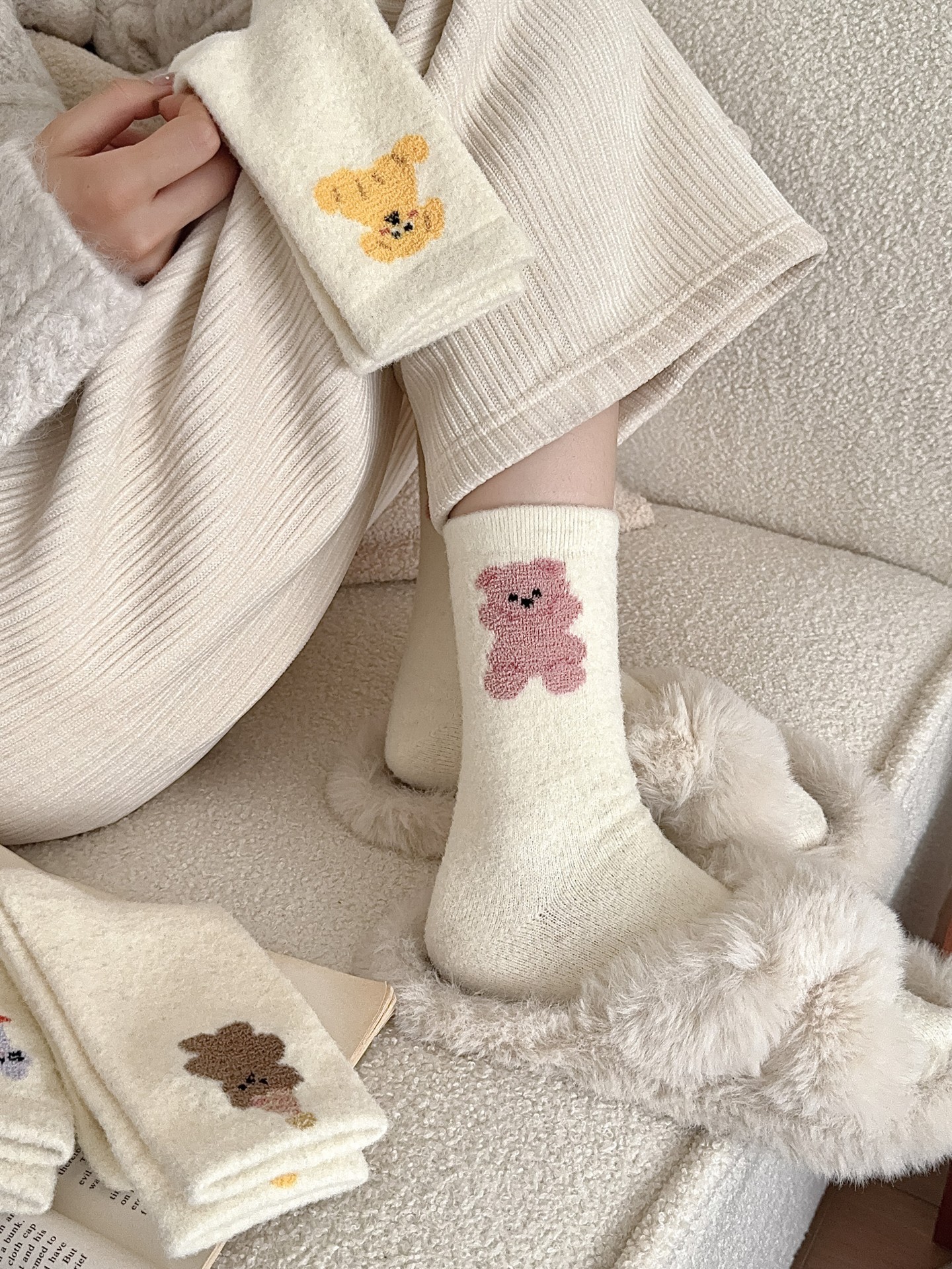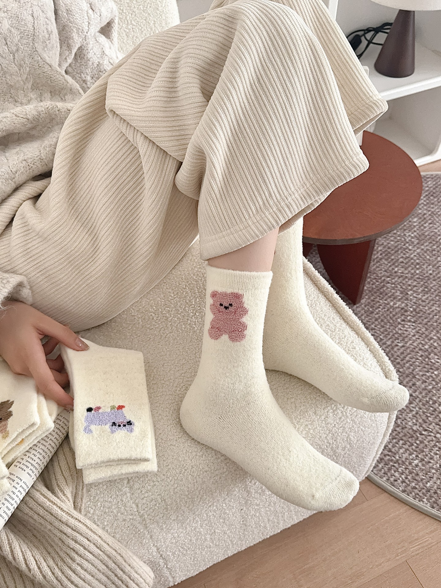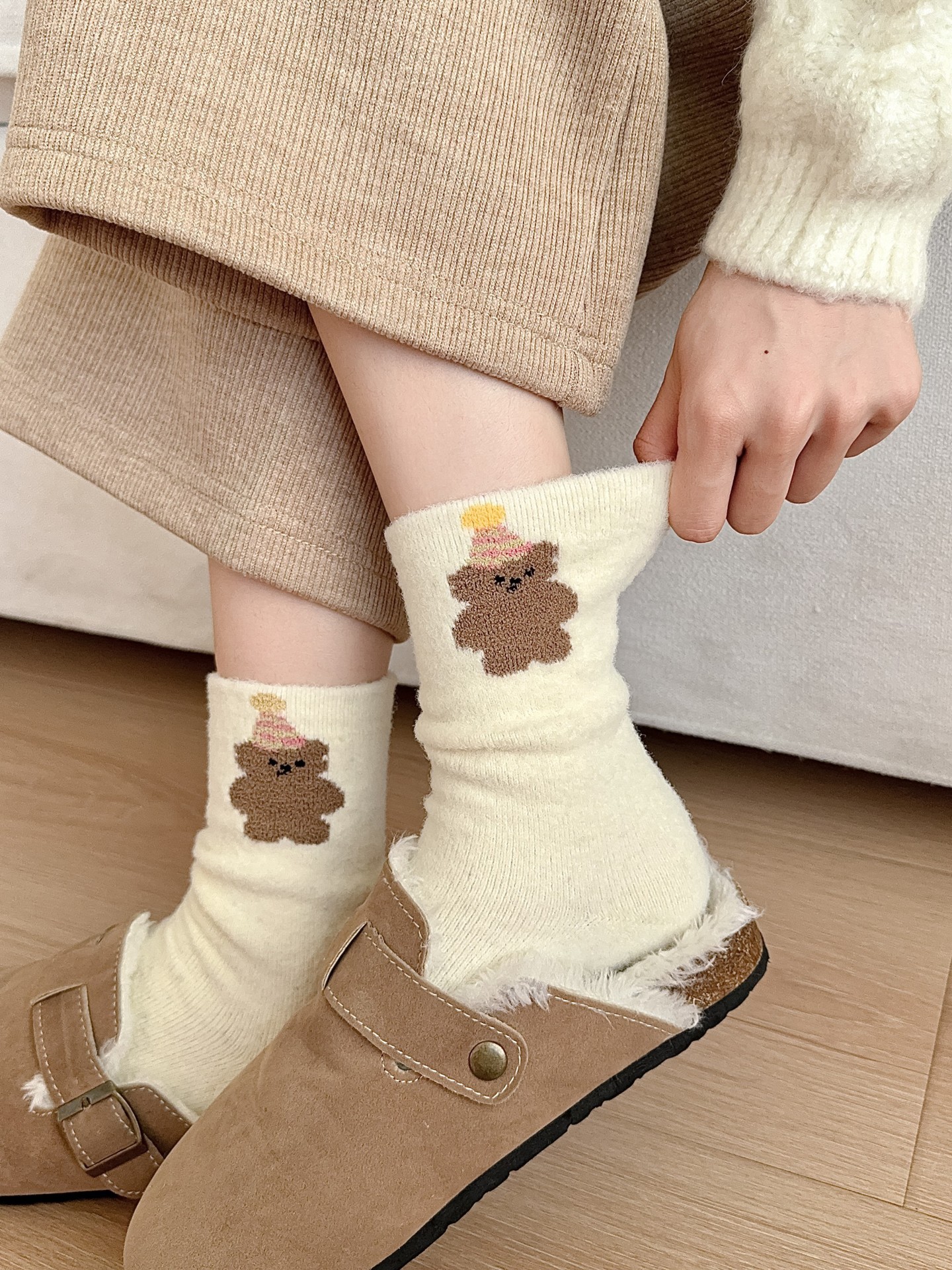 귀여운 곰 회색 벨벳 화이트 양말 여성의 중간 길이 양말 가을과 겨울 기모 두꺼운 따뜻한 일본 스타일 만화 겨울 스타킹