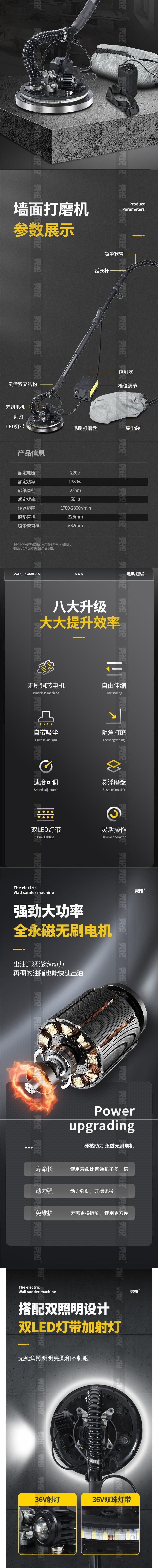 새로운 브러시리스 수정 된 이중 램프 초경량 흡입 상단 벽 연삭 기계 퍼티 먼지가없는 자체 진공 청소기 긴 막대 모래 피부 기계스토어 가기