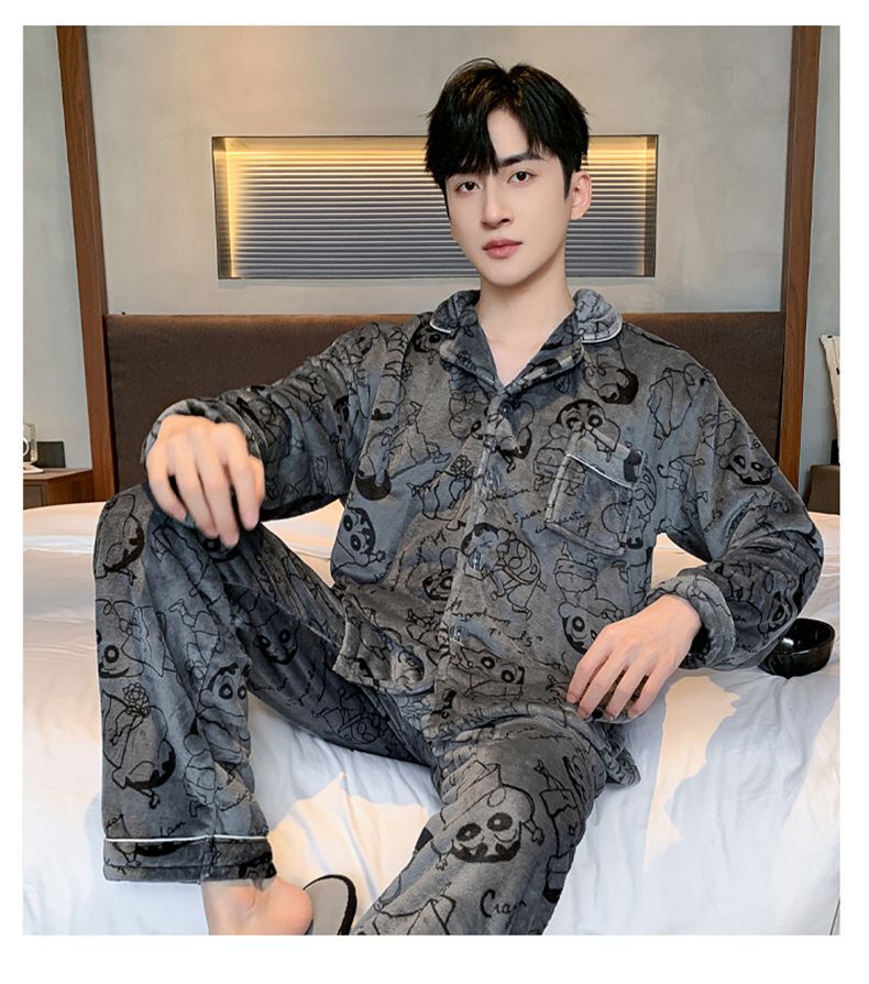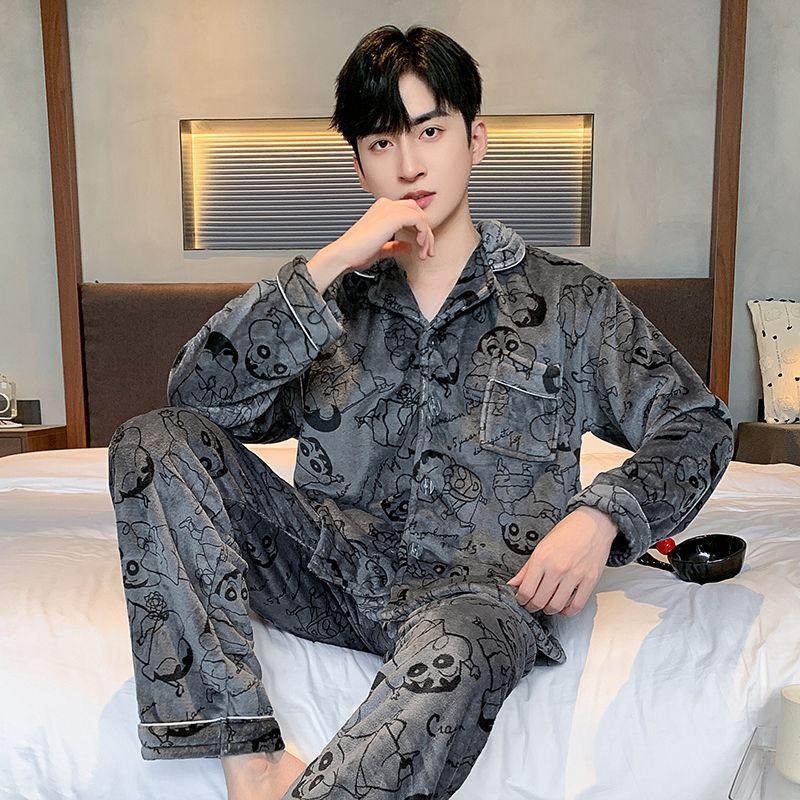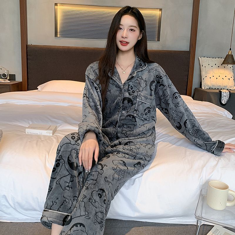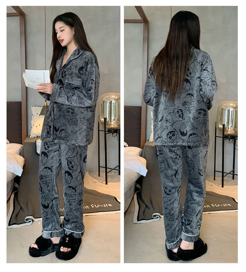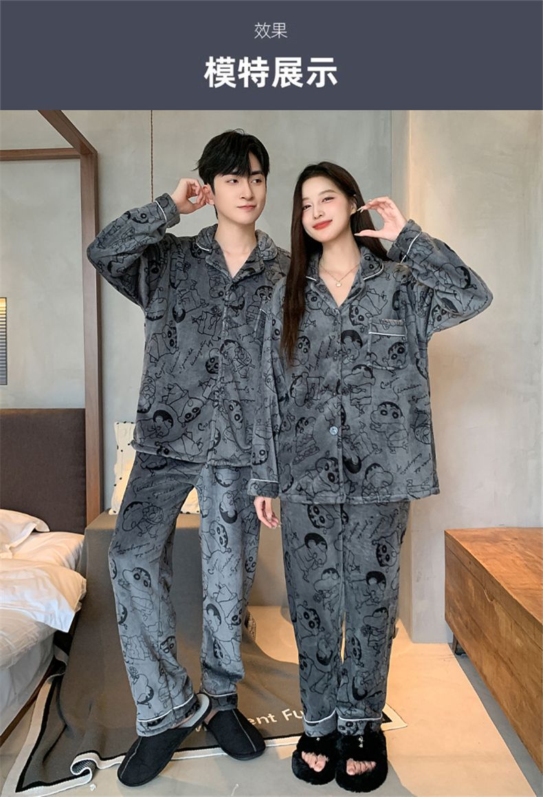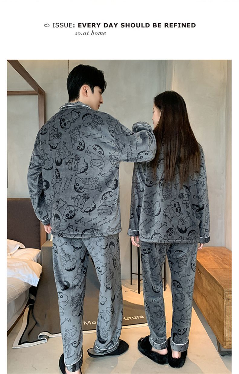 가을과 겨울 새로운 커플 잠옷 플란넬 옷깃 만화 작은 새로운 캐주얼 스타일 세트 따뜻한 두꺼운 홈 옷스토어 가기
