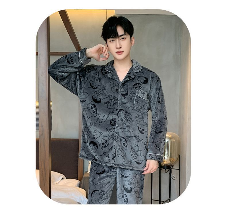 가을과 겨울 새로운 커플 잠옷 플란넬 옷깃 만화 작은 새로운 캐주얼 스타일 세트 따뜻한 두꺼운 홈 옷
