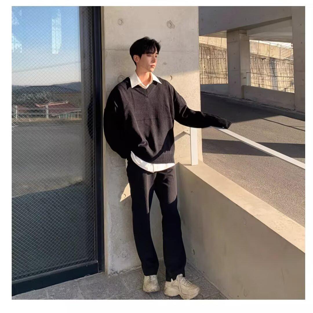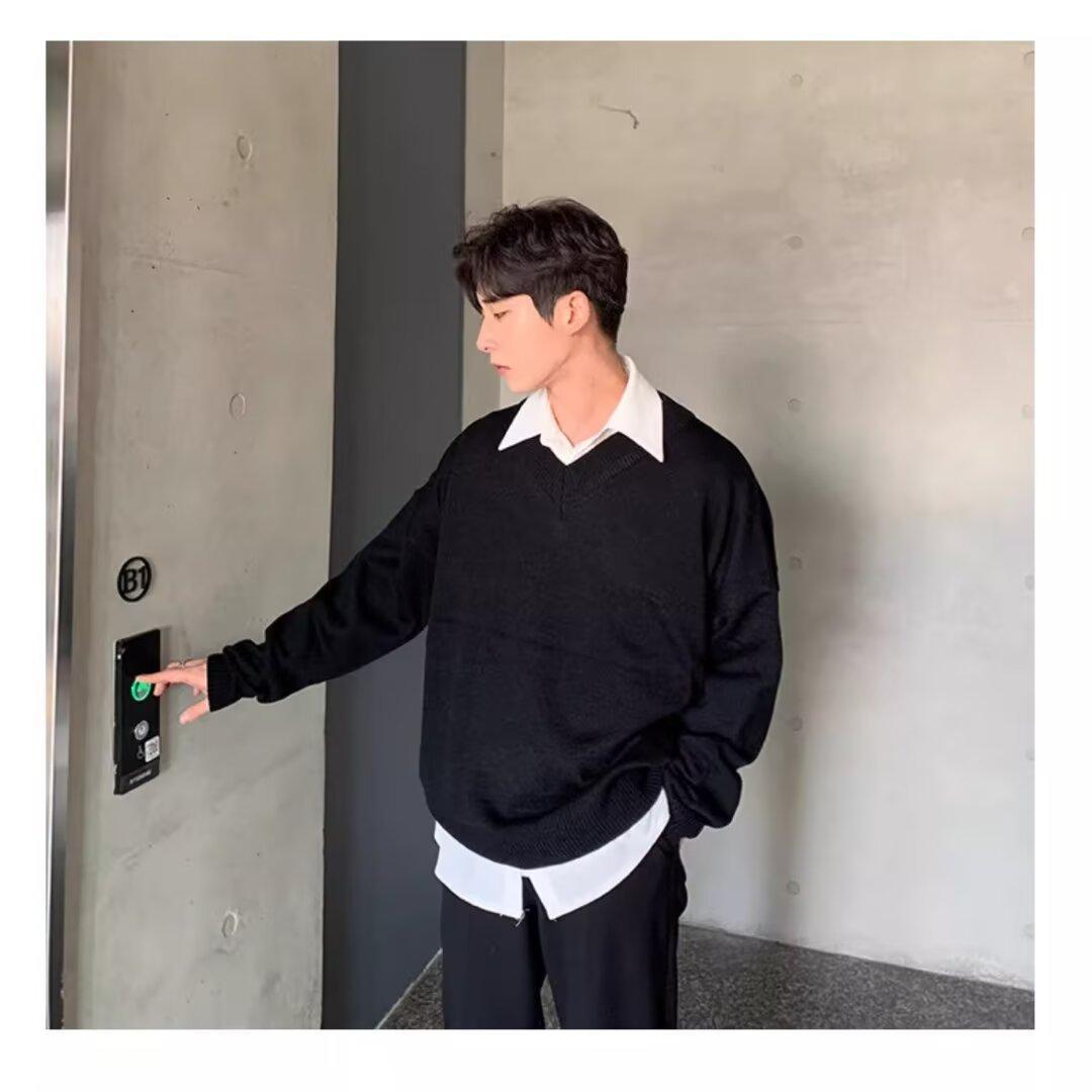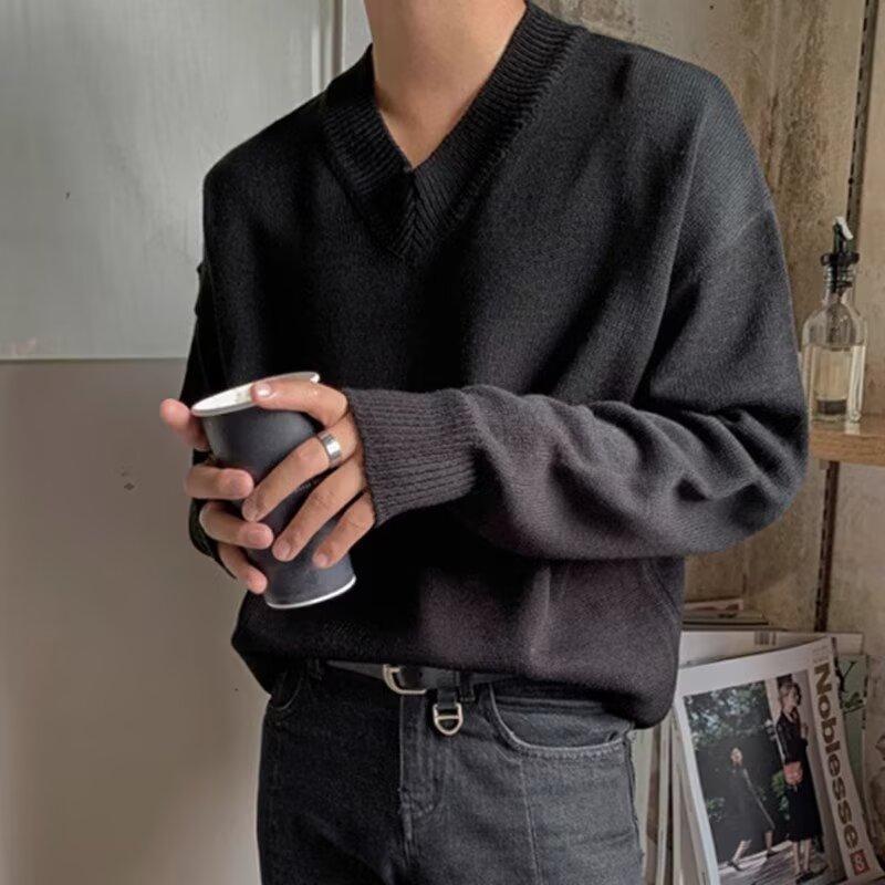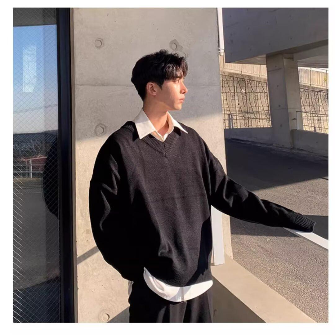 가을과 겨울 한국 스타일 V 넥 스웨터 남자의 새로운 느슨한 니트 스웨터 홍콩 스타일 캐주얼 긴 소매베이스 스웨터 트렌디 스웨터스토어 가기