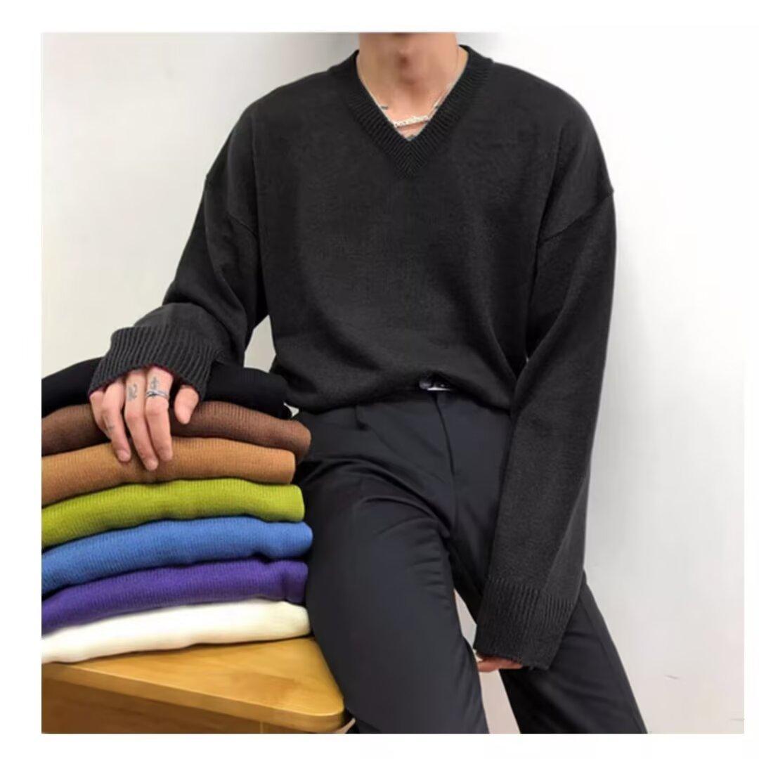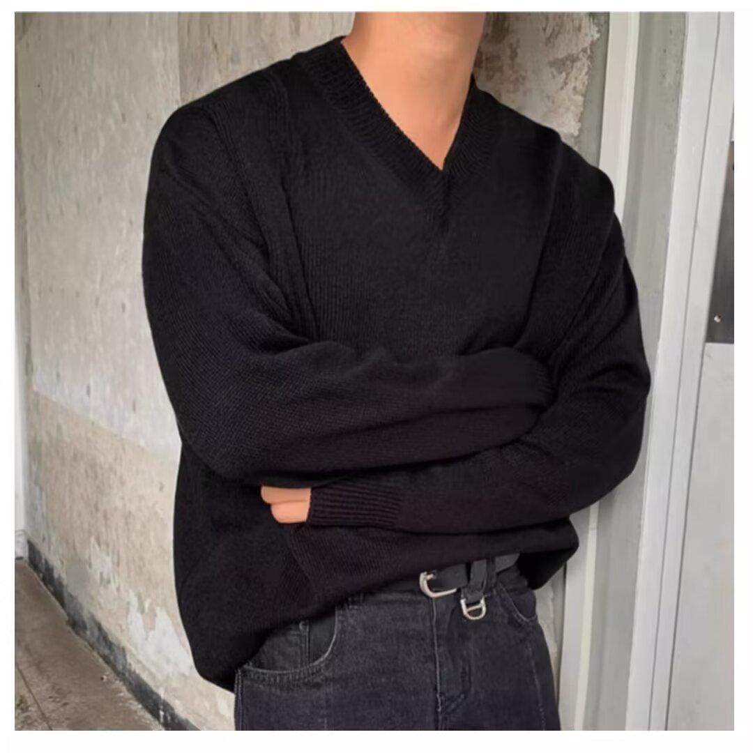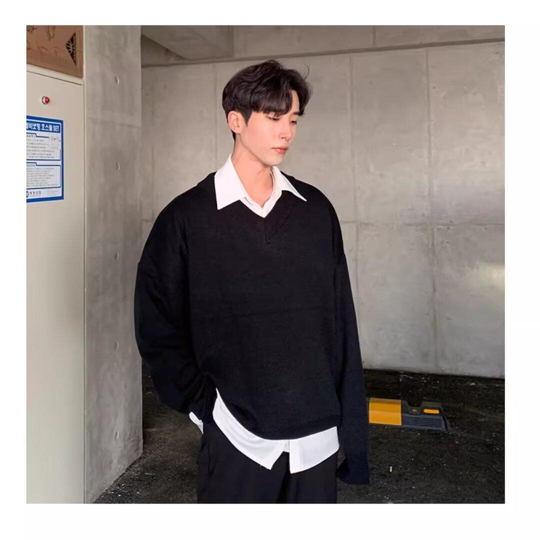가을과 겨울 한국 스타일 V 넥 스웨터 남자의 새로운 느슨한 니트 스웨터 홍콩 스타일 캐주얼 긴 소매베이스 스웨터 트렌디 스웨터