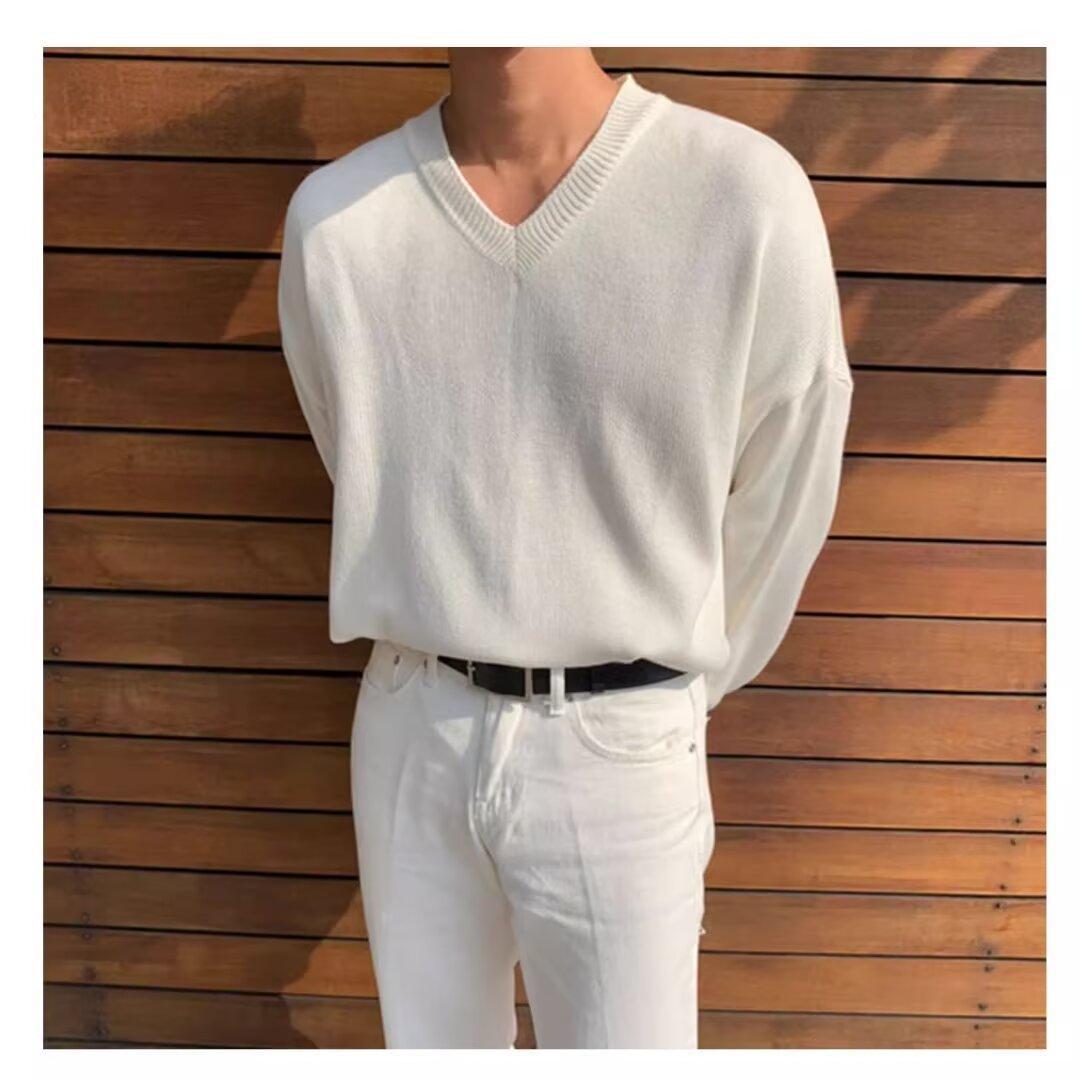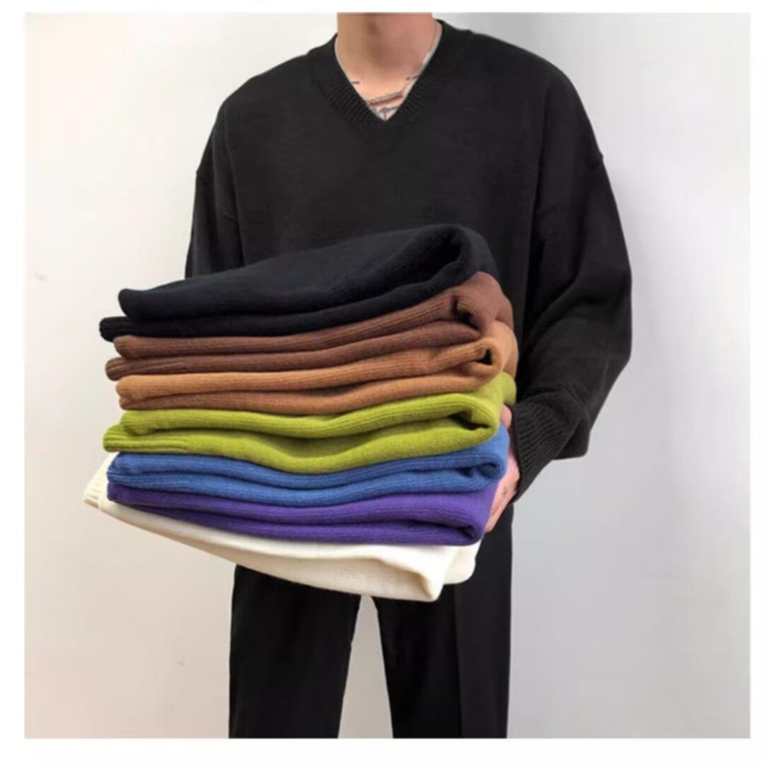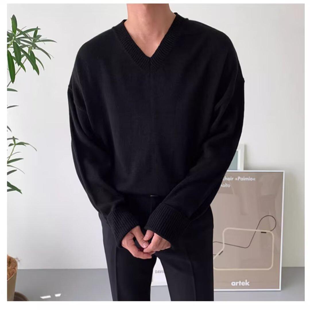 가을과 겨울 한국 스타일 V 넥 스웨터 남자의 새로운 느슨한 니트 스웨터 홍콩 스타일 캐주얼 긴 소매베이스 스웨터 트렌디 스웨터