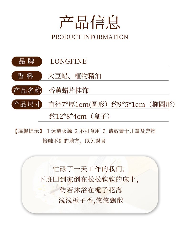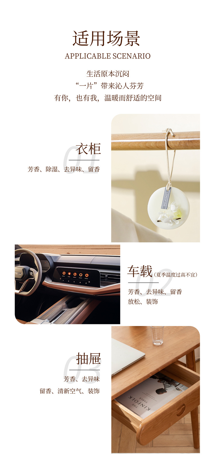 蜡片采用天然干花装饰,蜡质产品熔点为60℃左右,超过熔点会使产品融化变形,不建议您夏天放在车内使用。