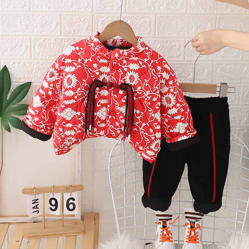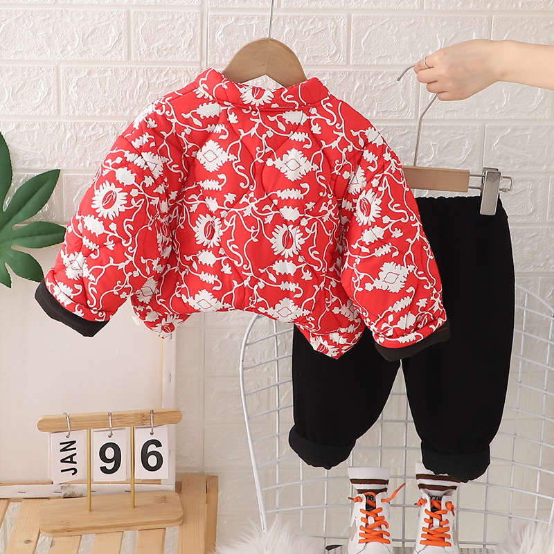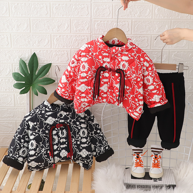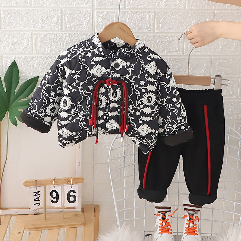 아동복 소년의 겨울 세트 소년의 2024 겨울 Guofeng 버클 카디건 기모 면봉 재킷 투피스 세트