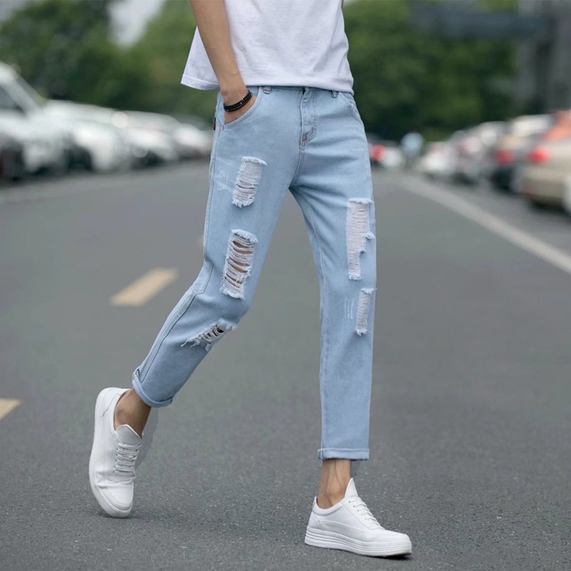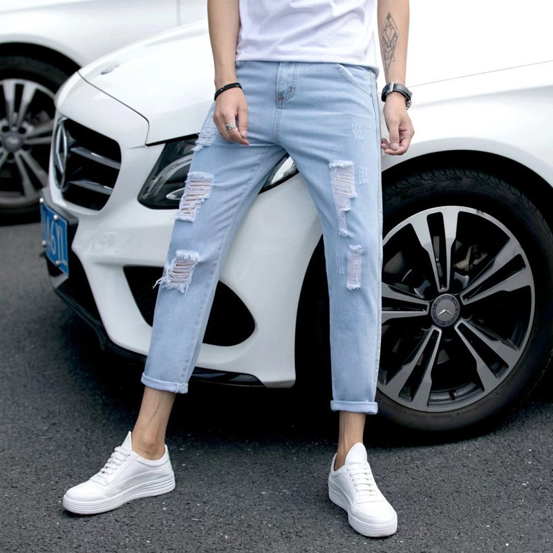 홍콩 스타일 봄과 여름 씻은 화이트 리핑 홀 청소년 올 매치 남자 발목 길이 청바지 한국 스타일 슬림 핏 스키니 팬츠 트렌디스토어 가기