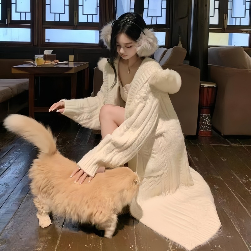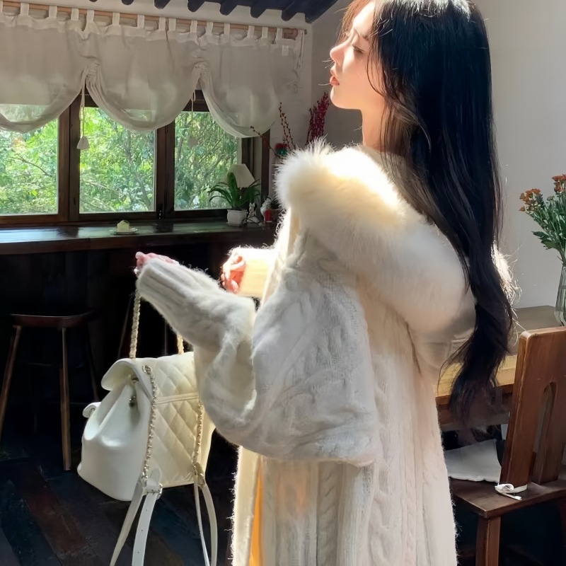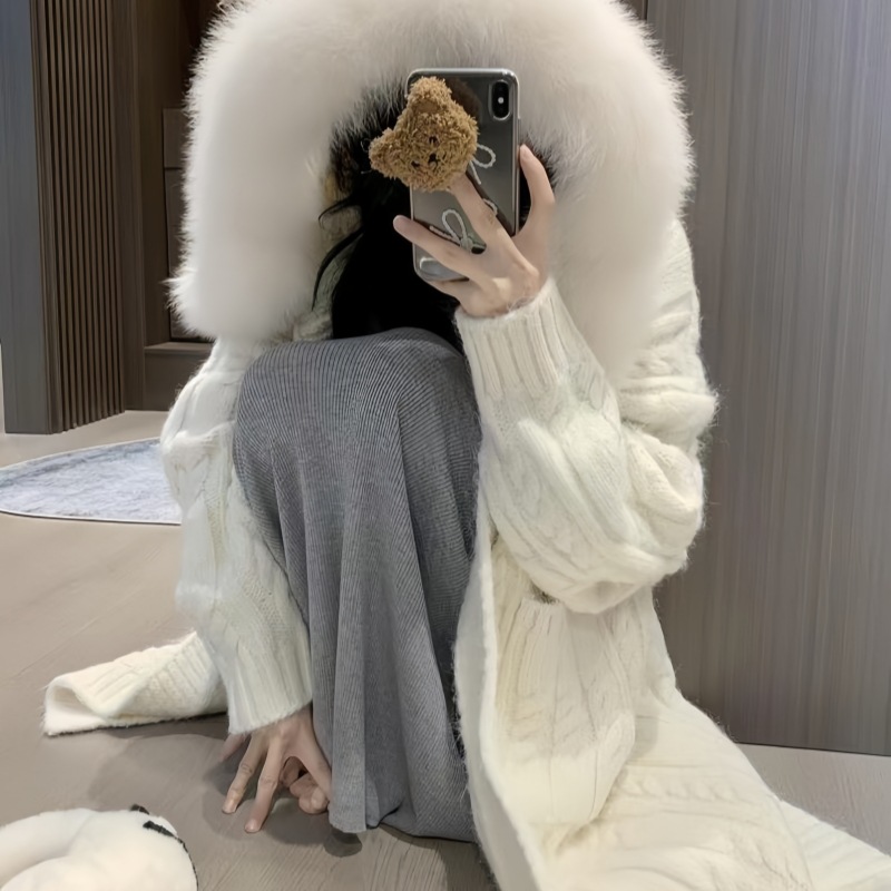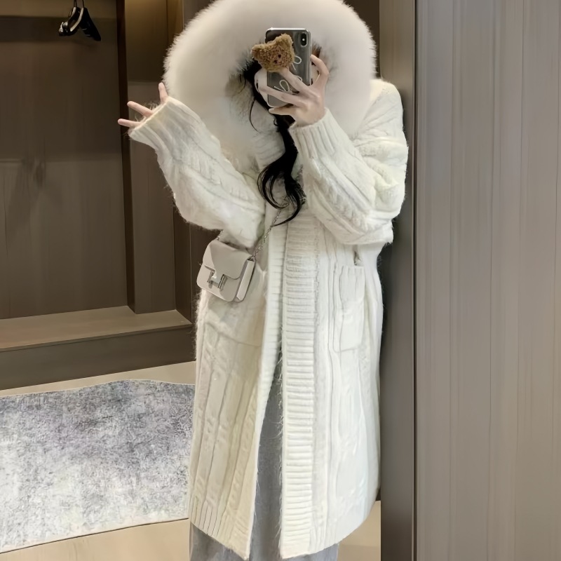 2024 겨울 트위스트 후드 게으른 스타일 스웨터 슈퍼 중공업 슈퍼 대형 울 칼라 니트 양모 긴 두꺼운 코트