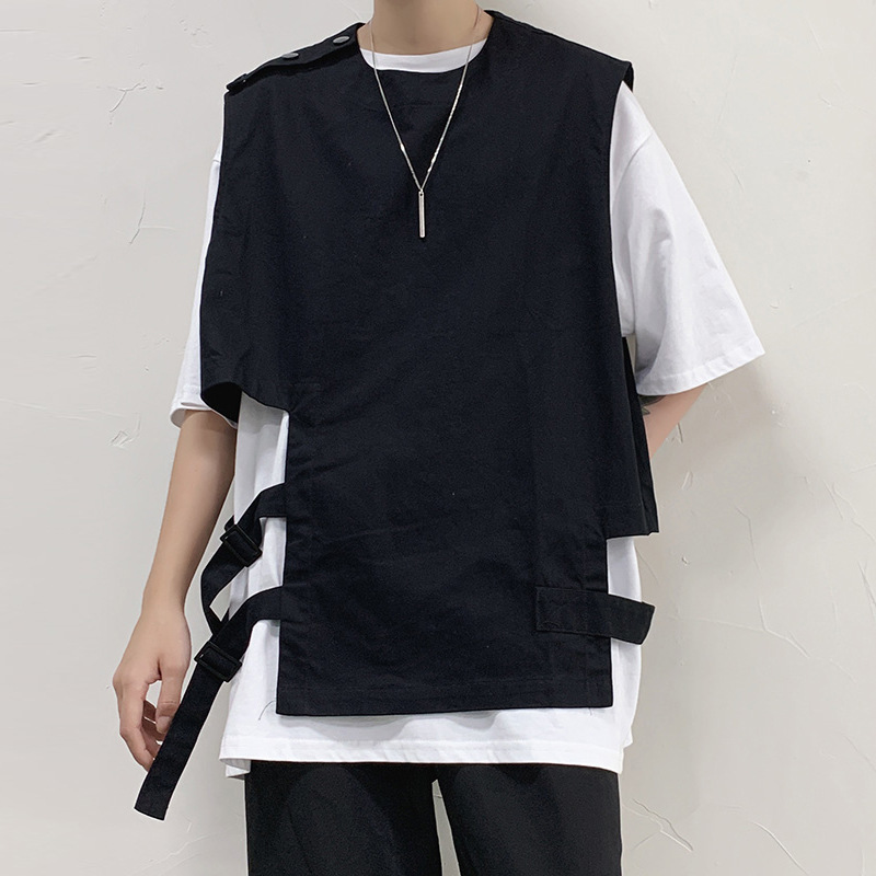 트렌디 한 브랜드 여름 의류 가짜 투피스 티셔츠 남성용 느슨한 헤어 스타일리스트 트렌디웨어 불규칙한 스티칭 반팔 조끼